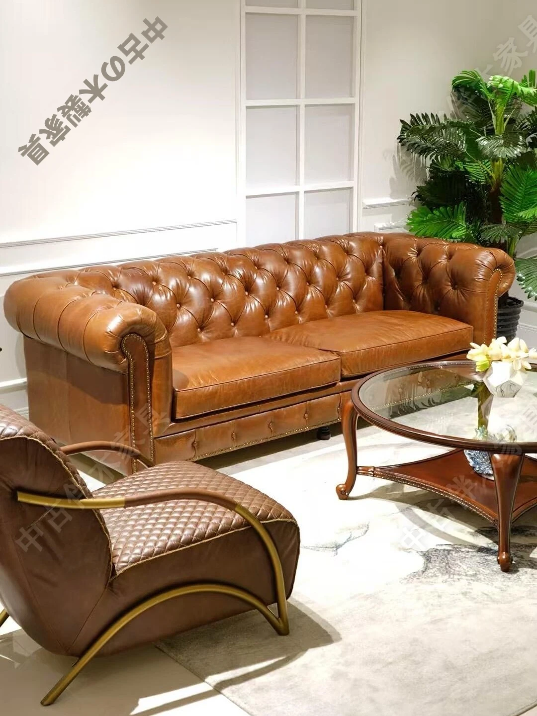 アンティーク風のアメリカンレトロレザーソファ - 高級感溢れる本革使用、3人掛けのスタイリッシュなデザインで、ヴィラのリビングにぴったり!快適な座り心地と洗練された雰囲気をお楽しみください。