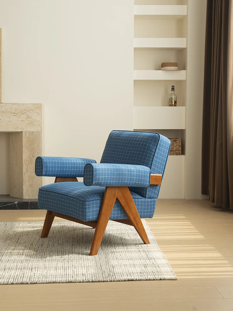 美しさの魅力!チャンディガール風レトロデザインの韓国スタイル1人掛けソファチェア - おしゃれなブルーチェック柄で、あなたのインテリアに個性をプラス!