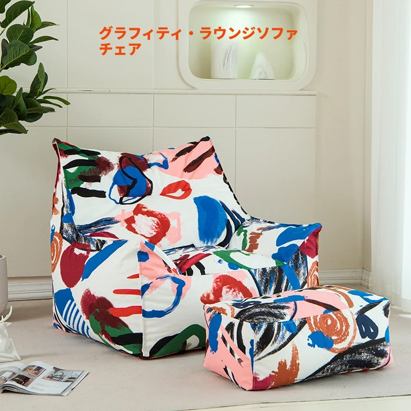 おしゃれな落書きデザインのリラックスソファ!座るもよし、寝るもよし、横になるもよし。バルコニーやリビング、寝室にぴったりな一人用座椅子。畳にも最適で、快適なひとときを提供します!