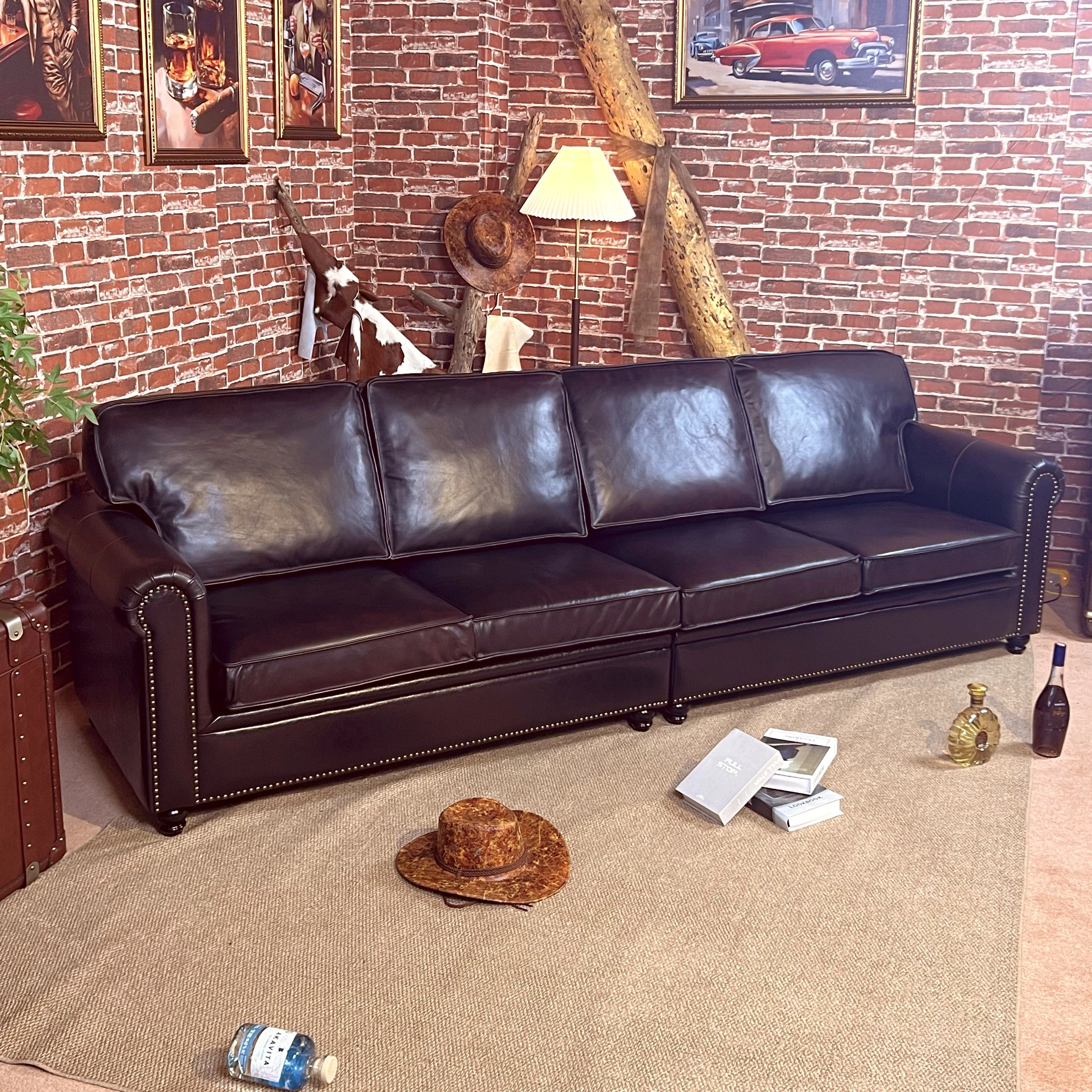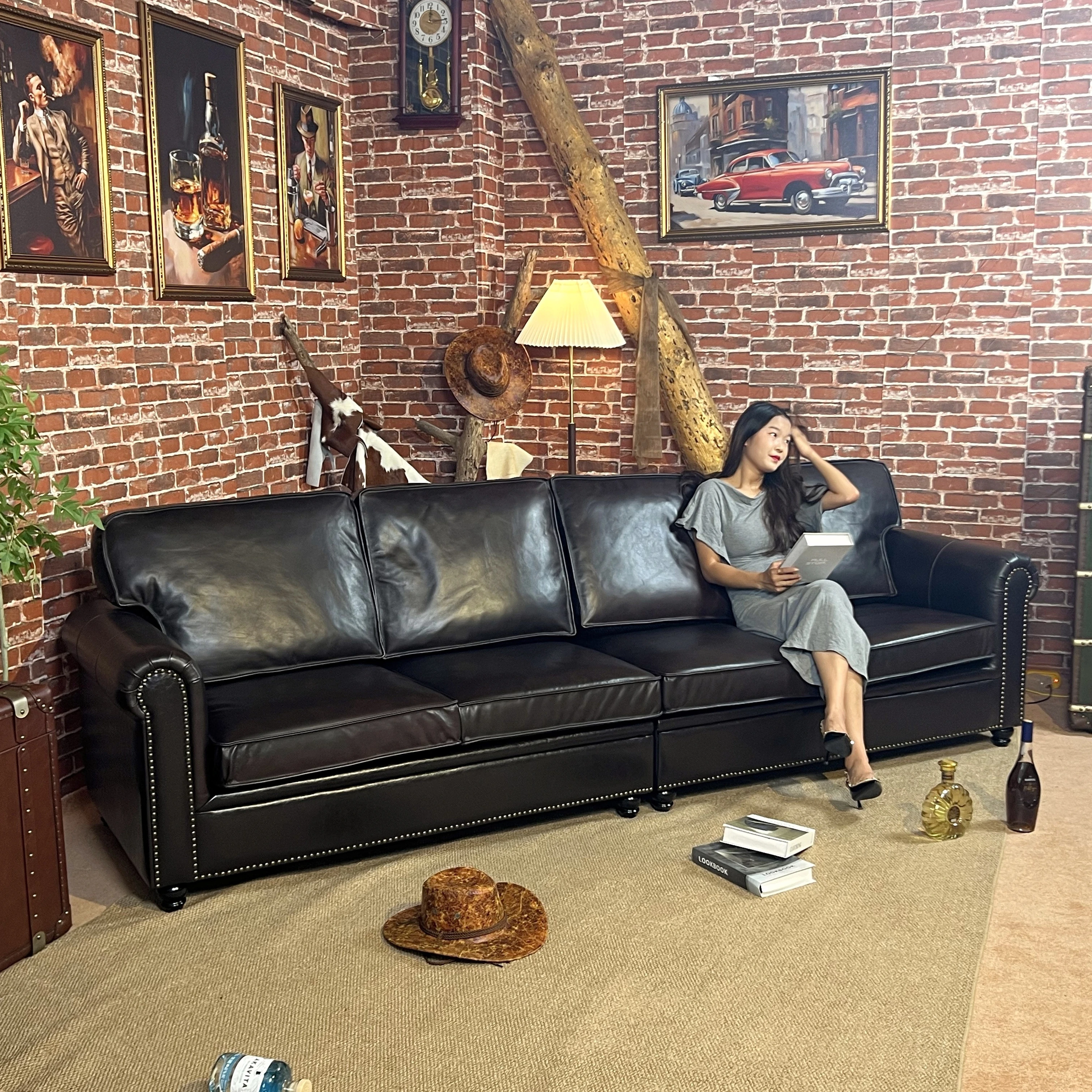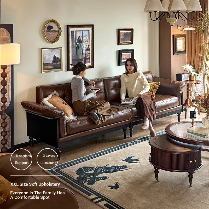 Vintage American Solid Wood Leather Sofa - Retro Waxed Finish for Spacious Living Rooms, Perfect for Mid to Large-Sized Homes, Classic Design Furniture