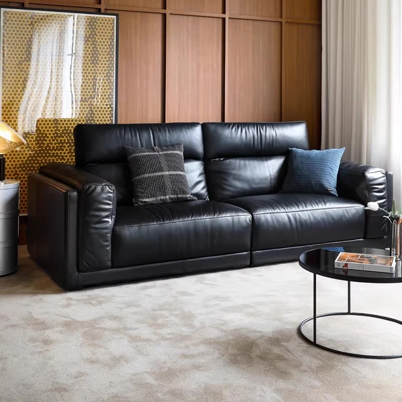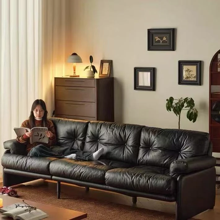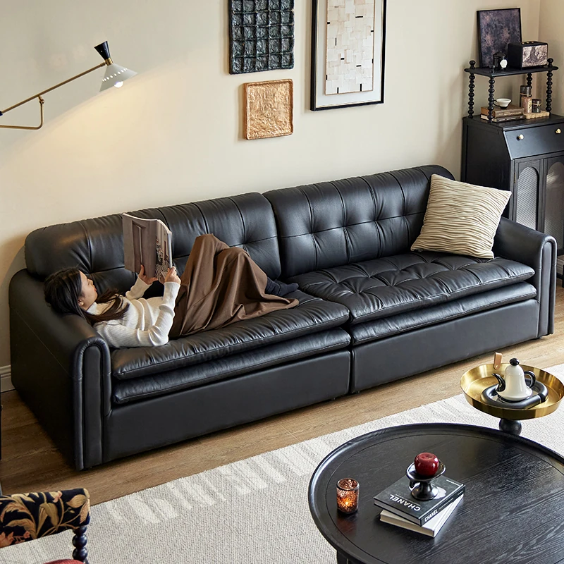 2025 New French Vintage Black Genuine Leather Sofa for Small Living Rooms - Luxurious Black Full-Grain Leather with Antique Style