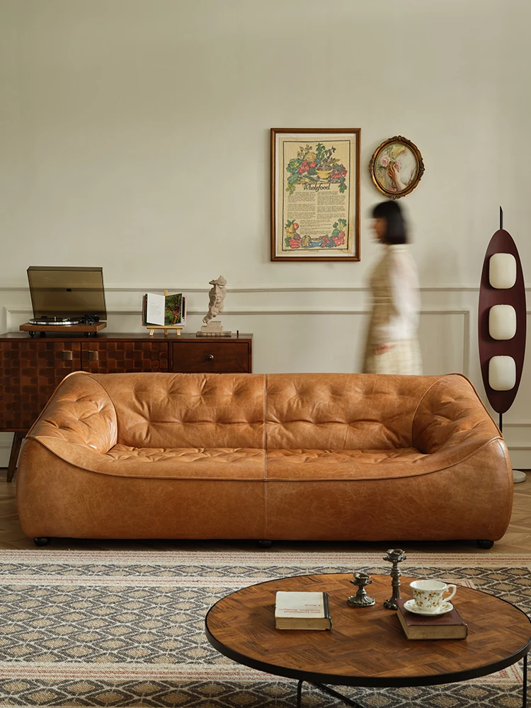 American-Style Light Luxury Vintage Bean Bag Sofa - Full Wax Leather Mid-Century Design for Small Living Rooms, 3-Seater Genuine Leather Couch