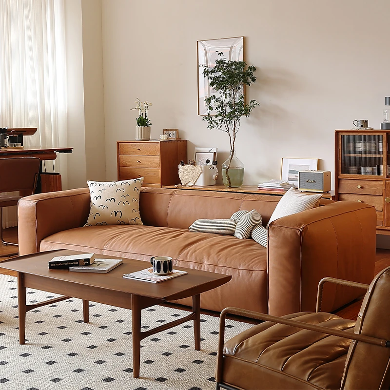 2025 New Vintage French Genuine Leather Sofa - High-End American Solid Wood Designer Mid-Century Modern Living Room Furniture