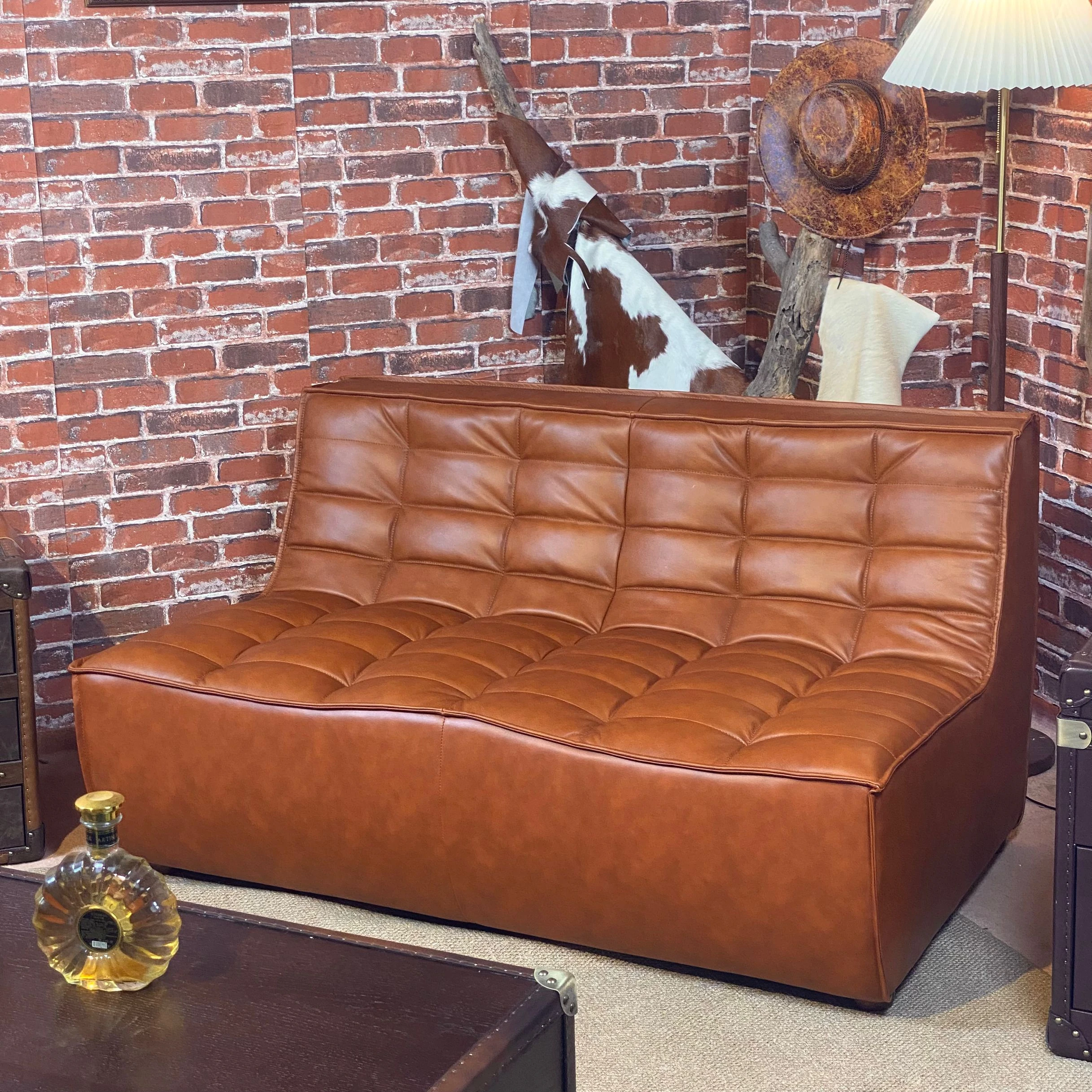 Vintage Waxed Leather Waffle Sofa - Retro Wabi-Sabi Style for Living Room & Villa, Trendy Designer Couch Perfect for Modern Homes