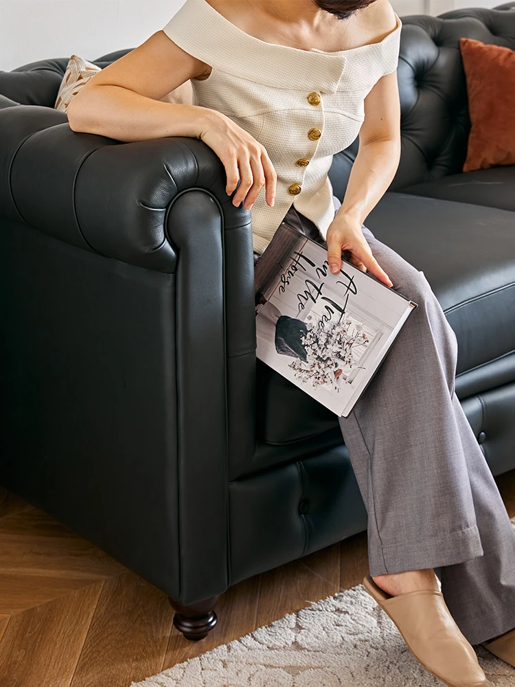 Vintage American Style Kenny Genuine Leather Sofa - Elegant Black, High-Quality Real Leather with Solid Wood Frame for Your Living Room - New Arrival!