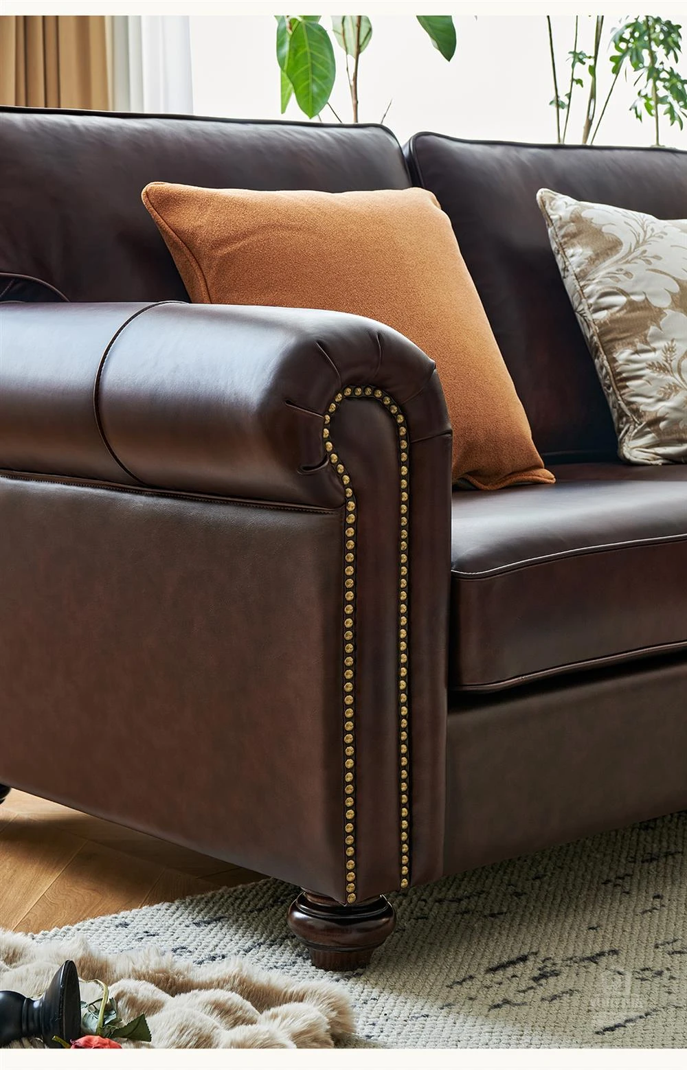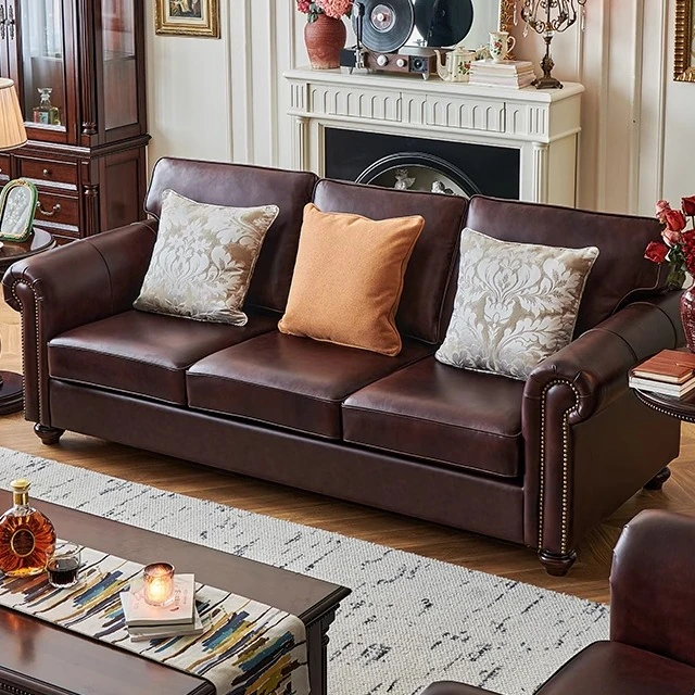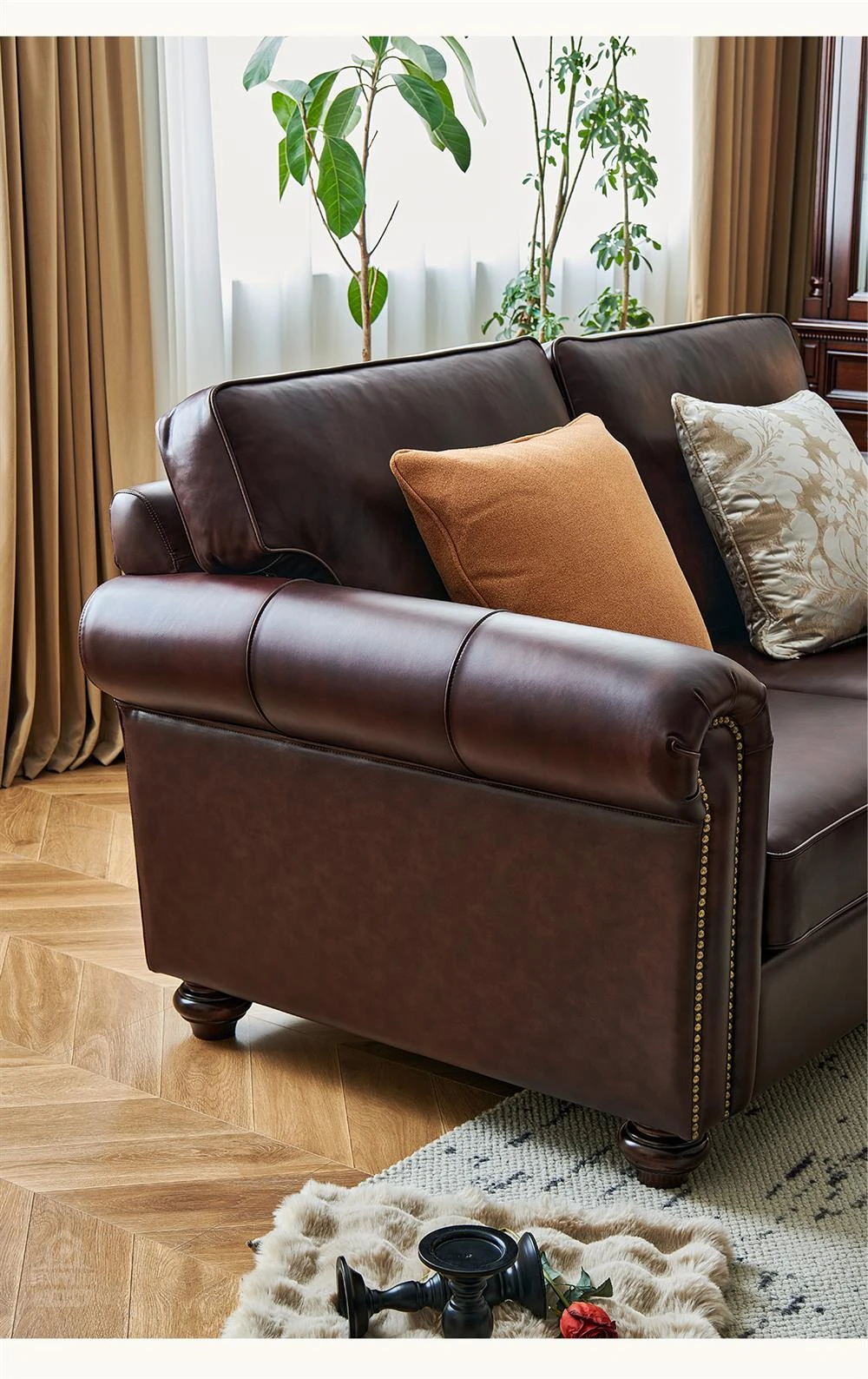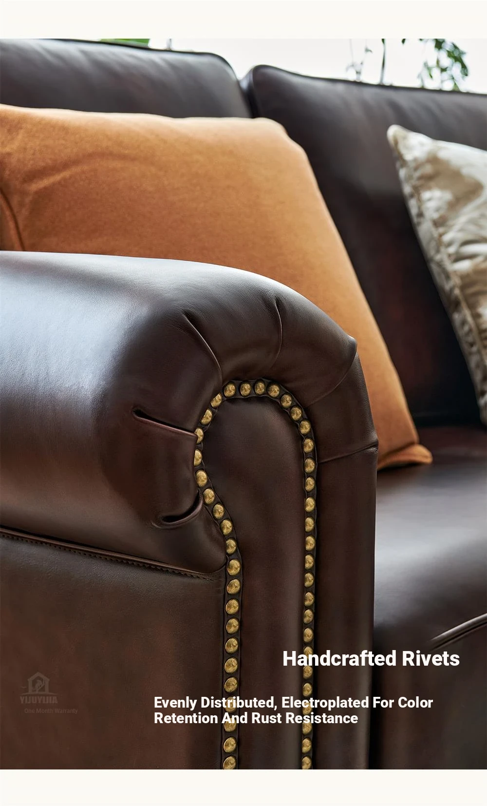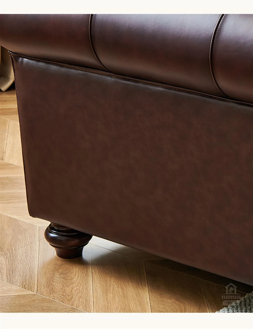 American Vintage Genuine Leather Sofa - Large Button Design, Top Grain Oil Wax Leather, Perfect for Small Living Rooms, 3-Seater Solid Wood Sofa
