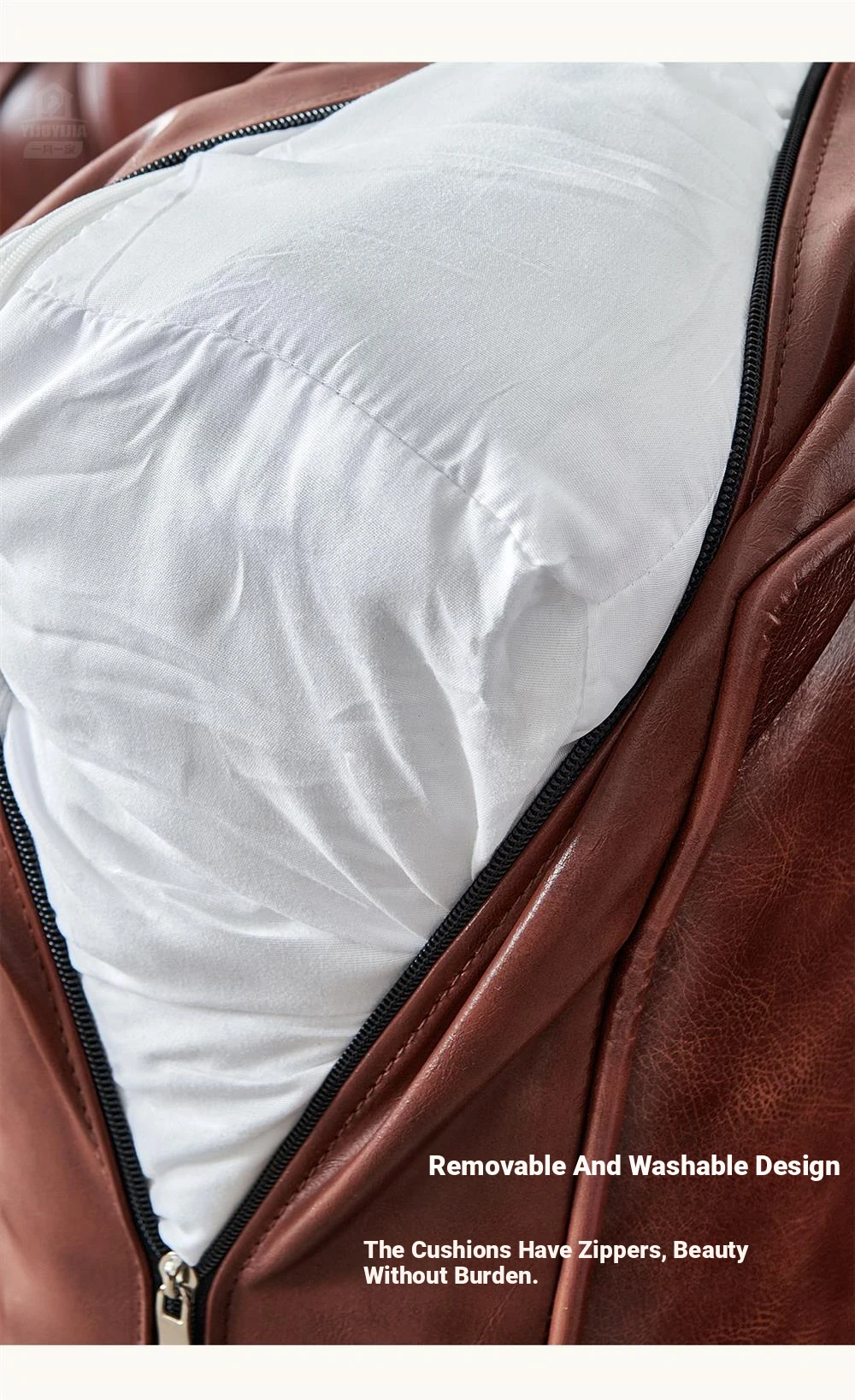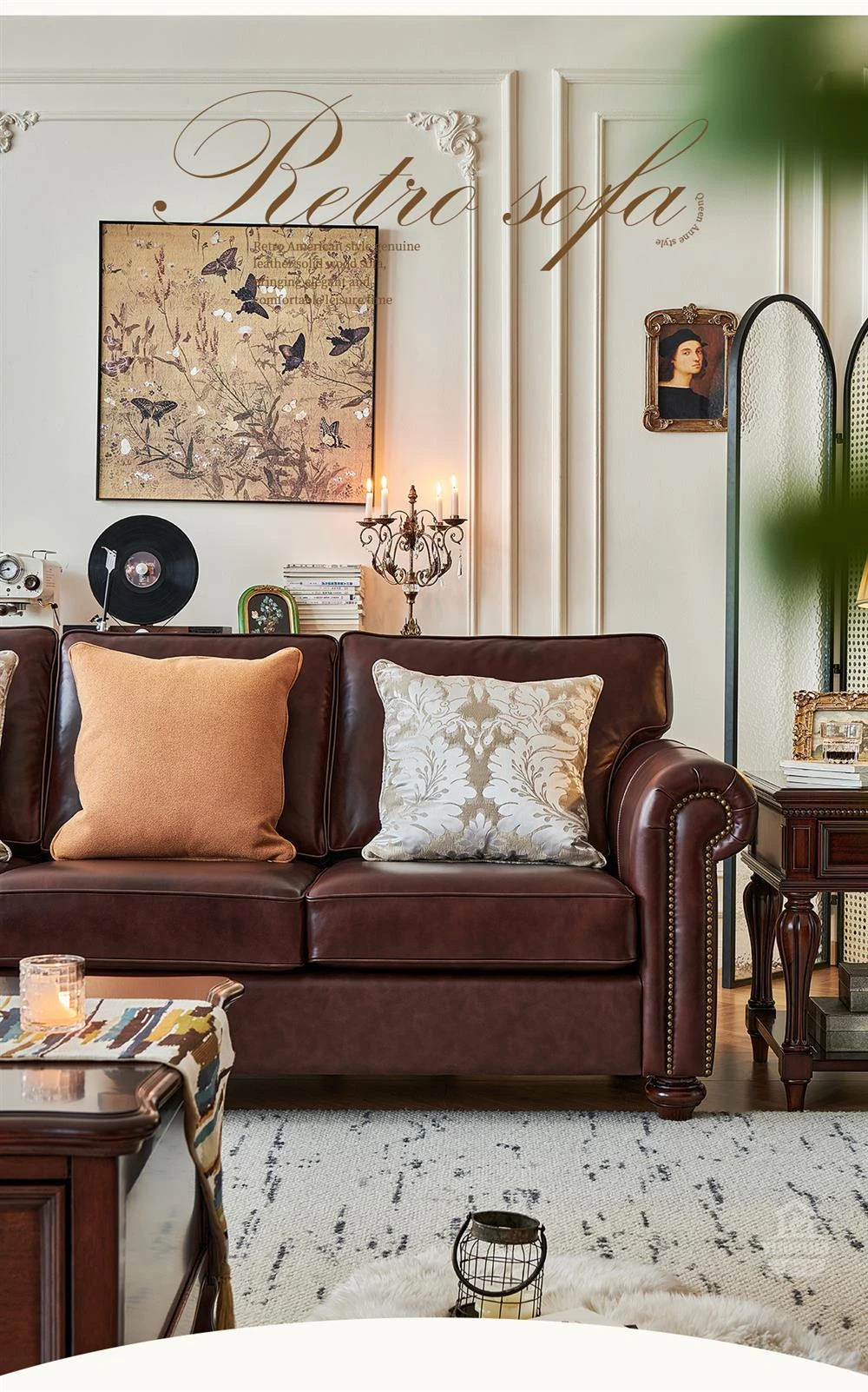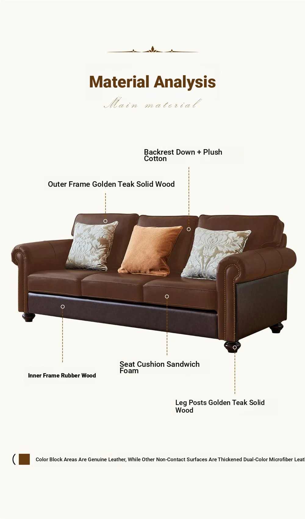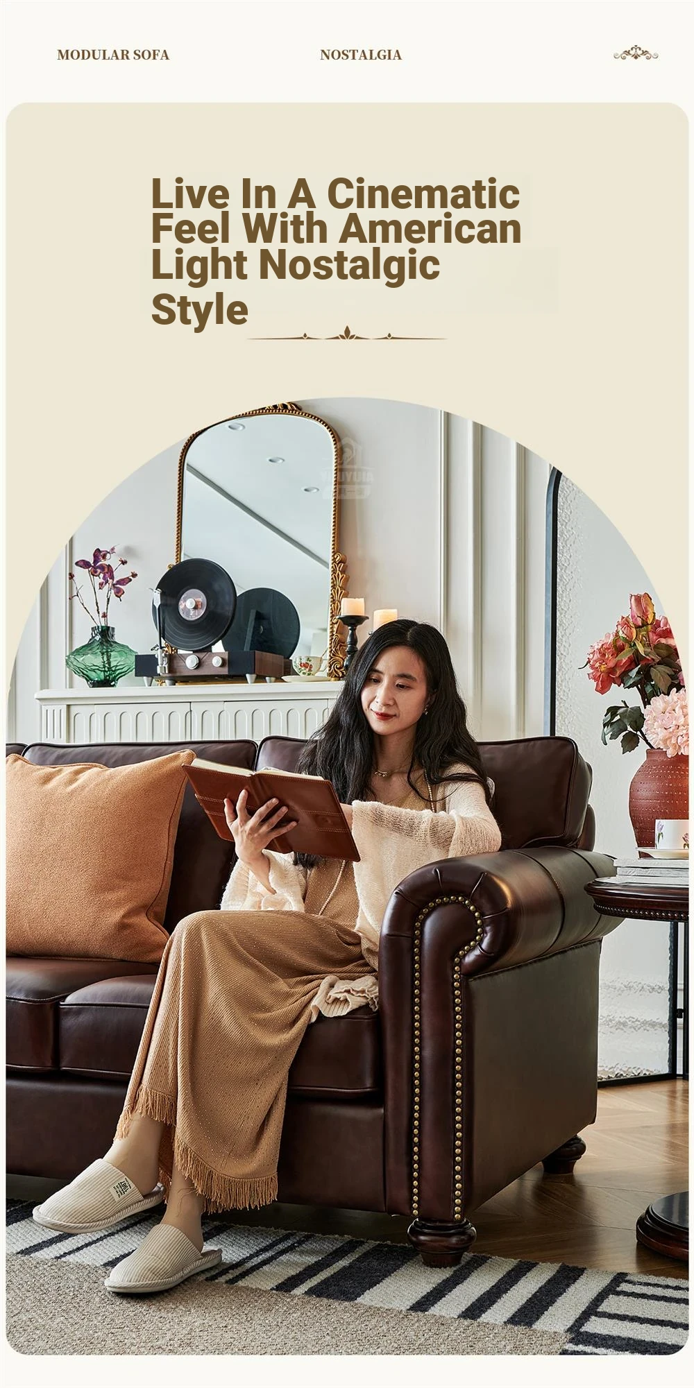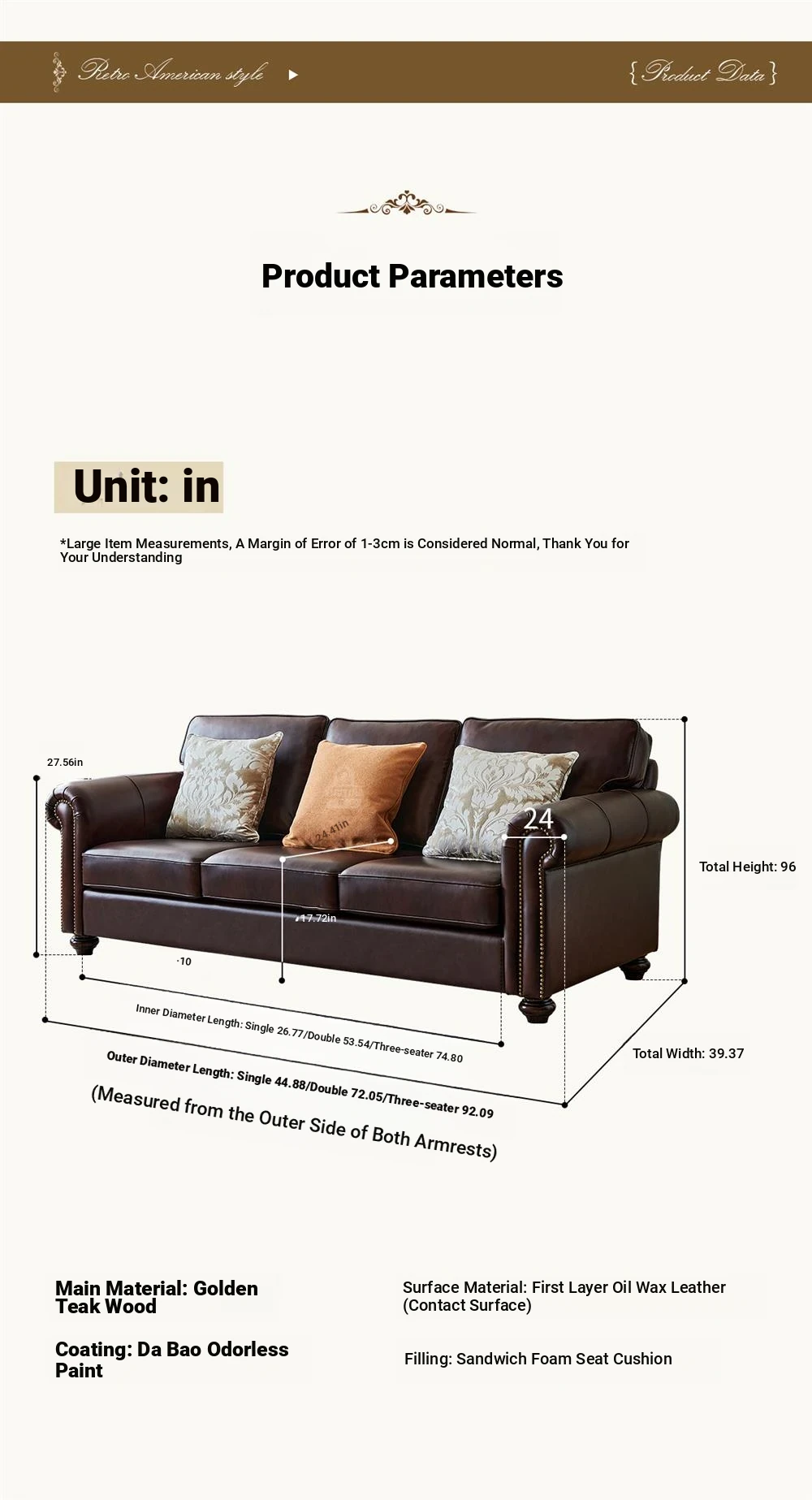 American Vintage Genuine Leather Sofa - Large Button Design, Top Grain Oil Wax Leather, Perfect for Small Living Rooms, 3-Seater Solid Wood Sofa