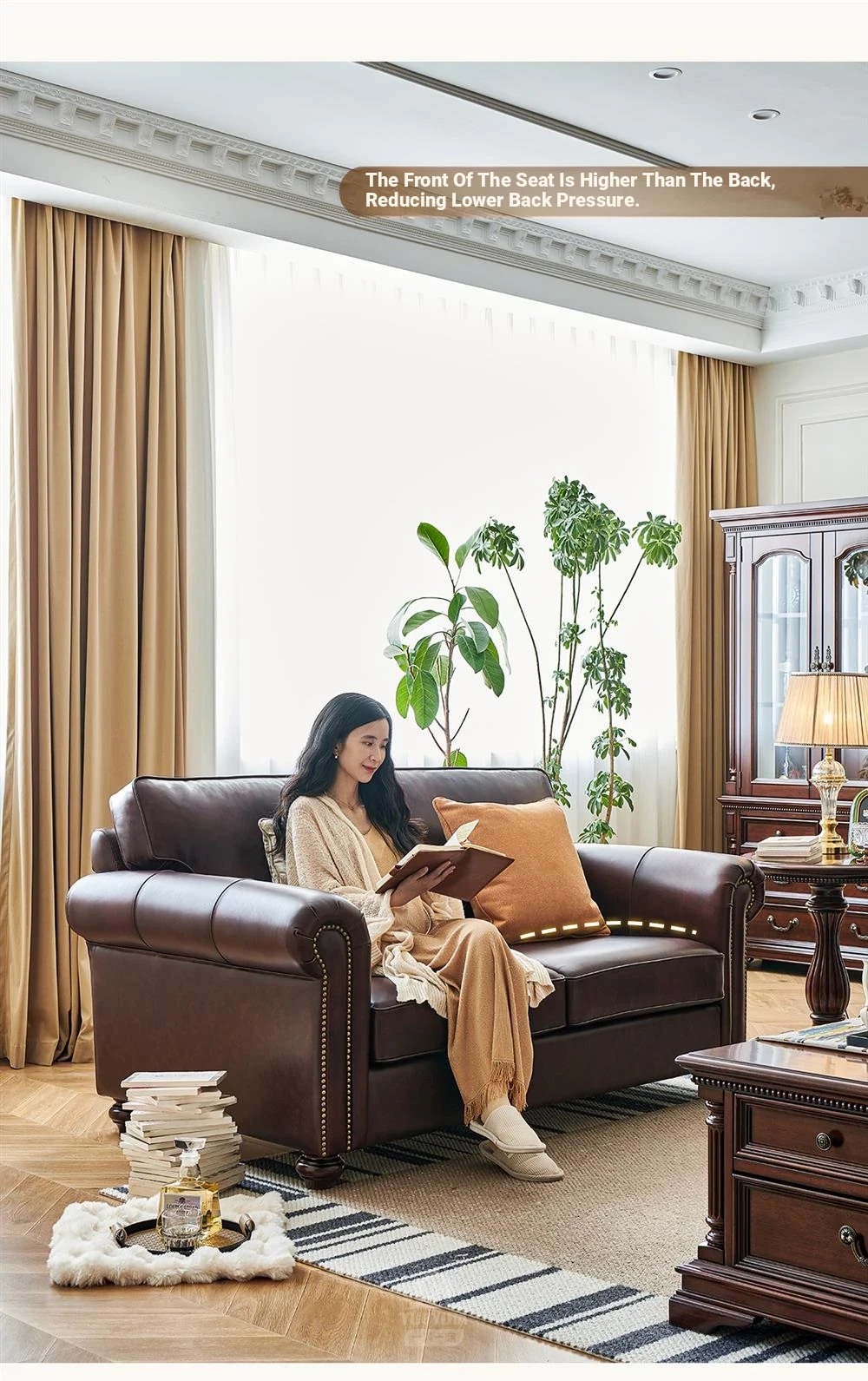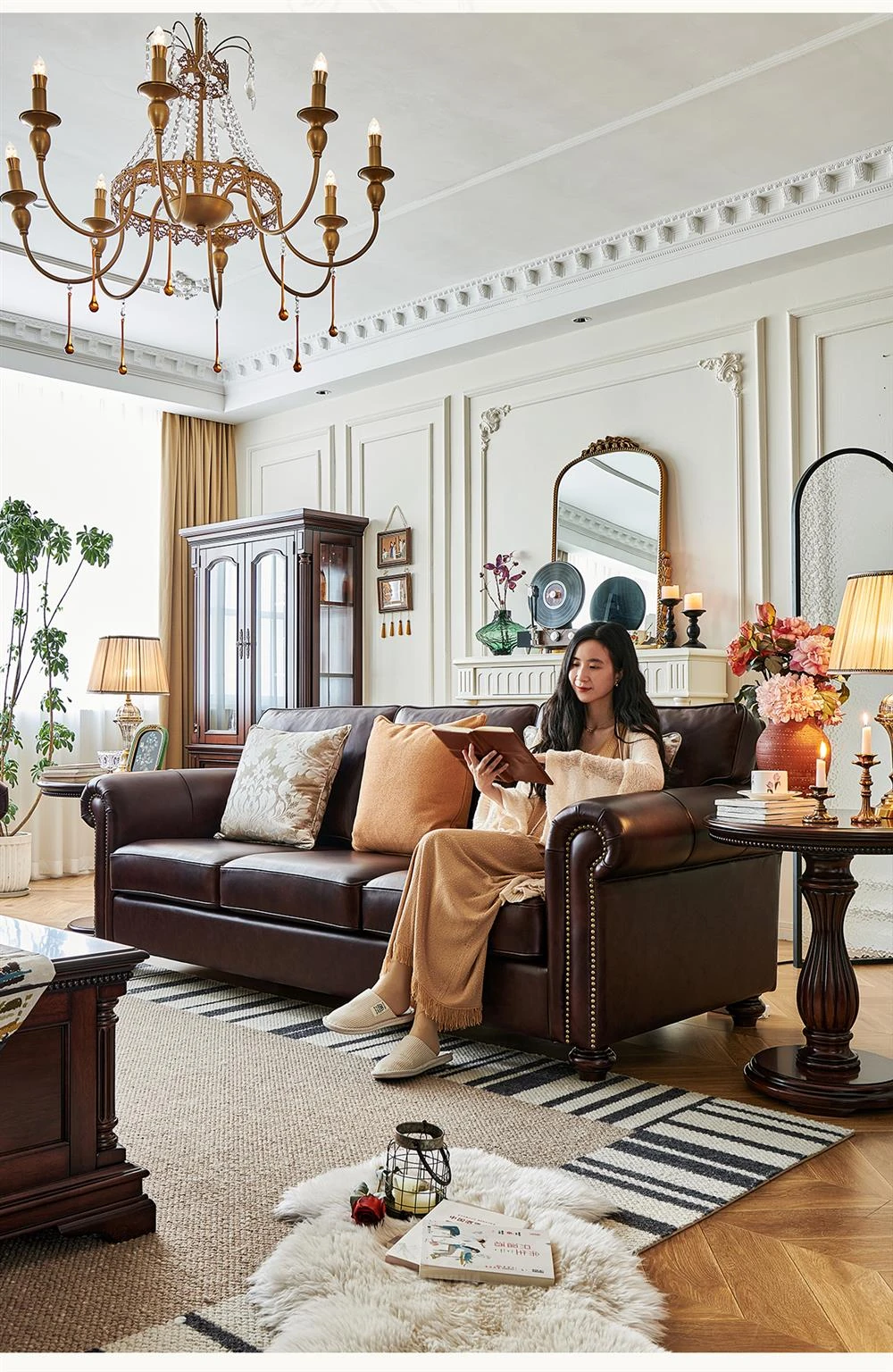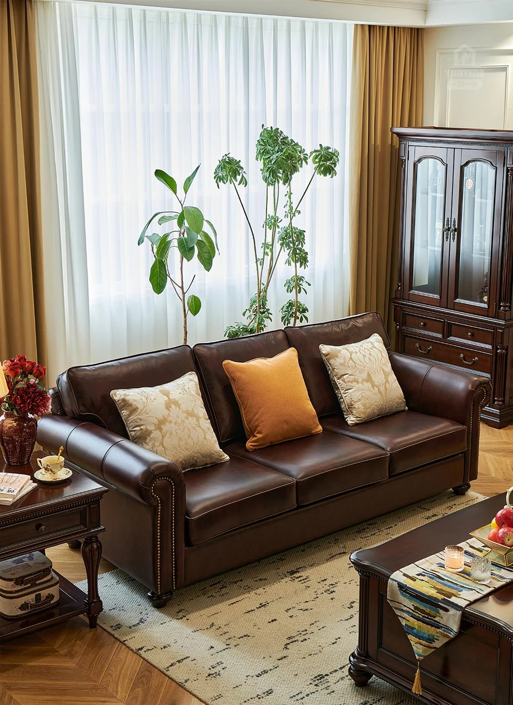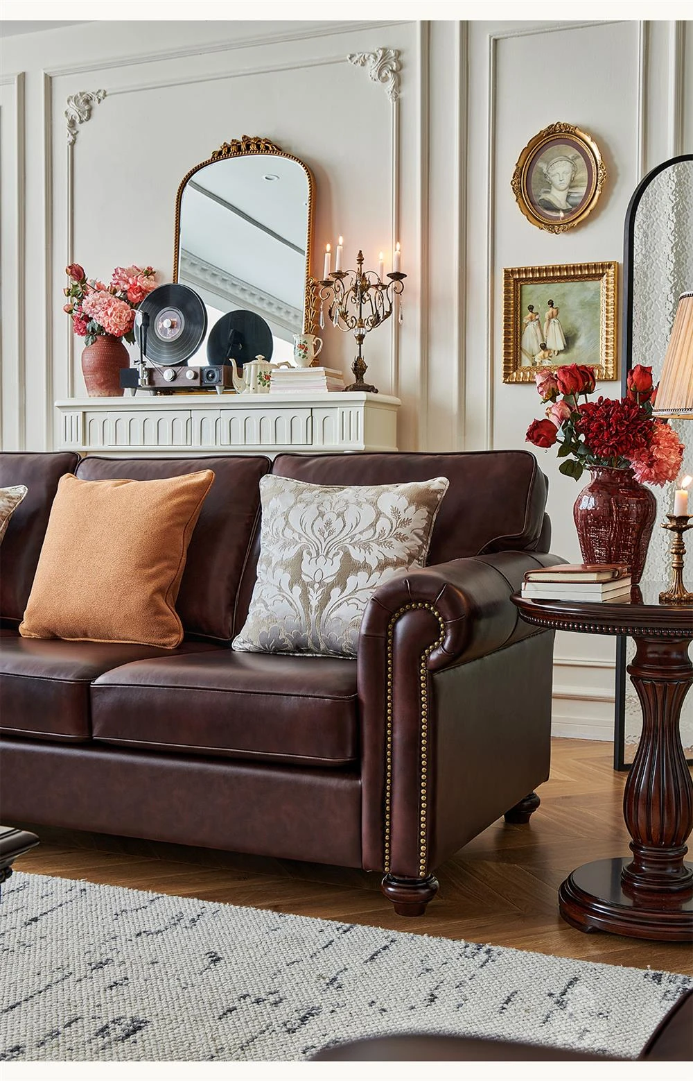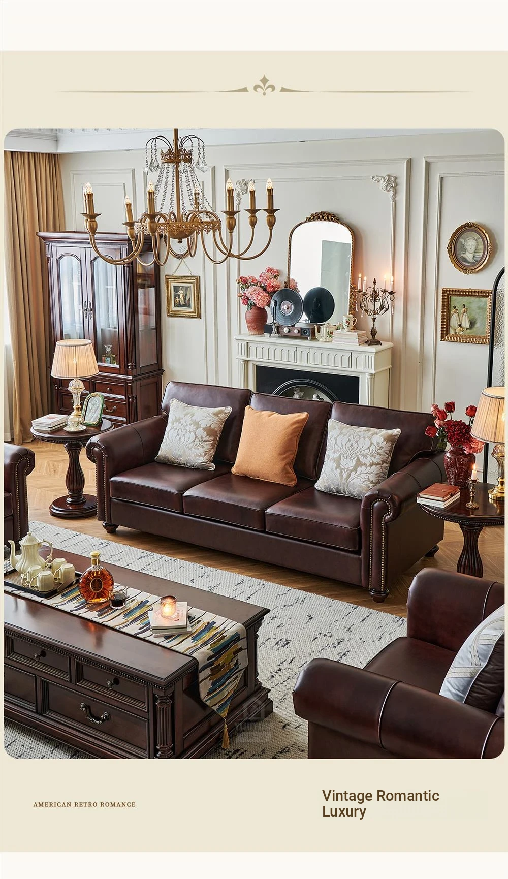 American Vintage Genuine Leather Sofa - Large Button Design, Top Grain Oil Wax Leather, Perfect for Small Living Rooms, 3-Seater Solid Wood Sofa