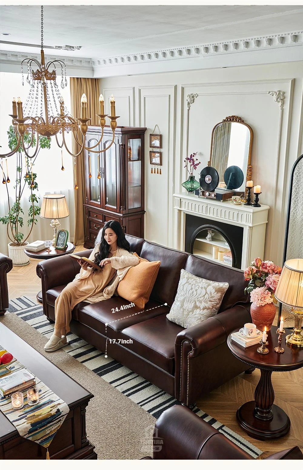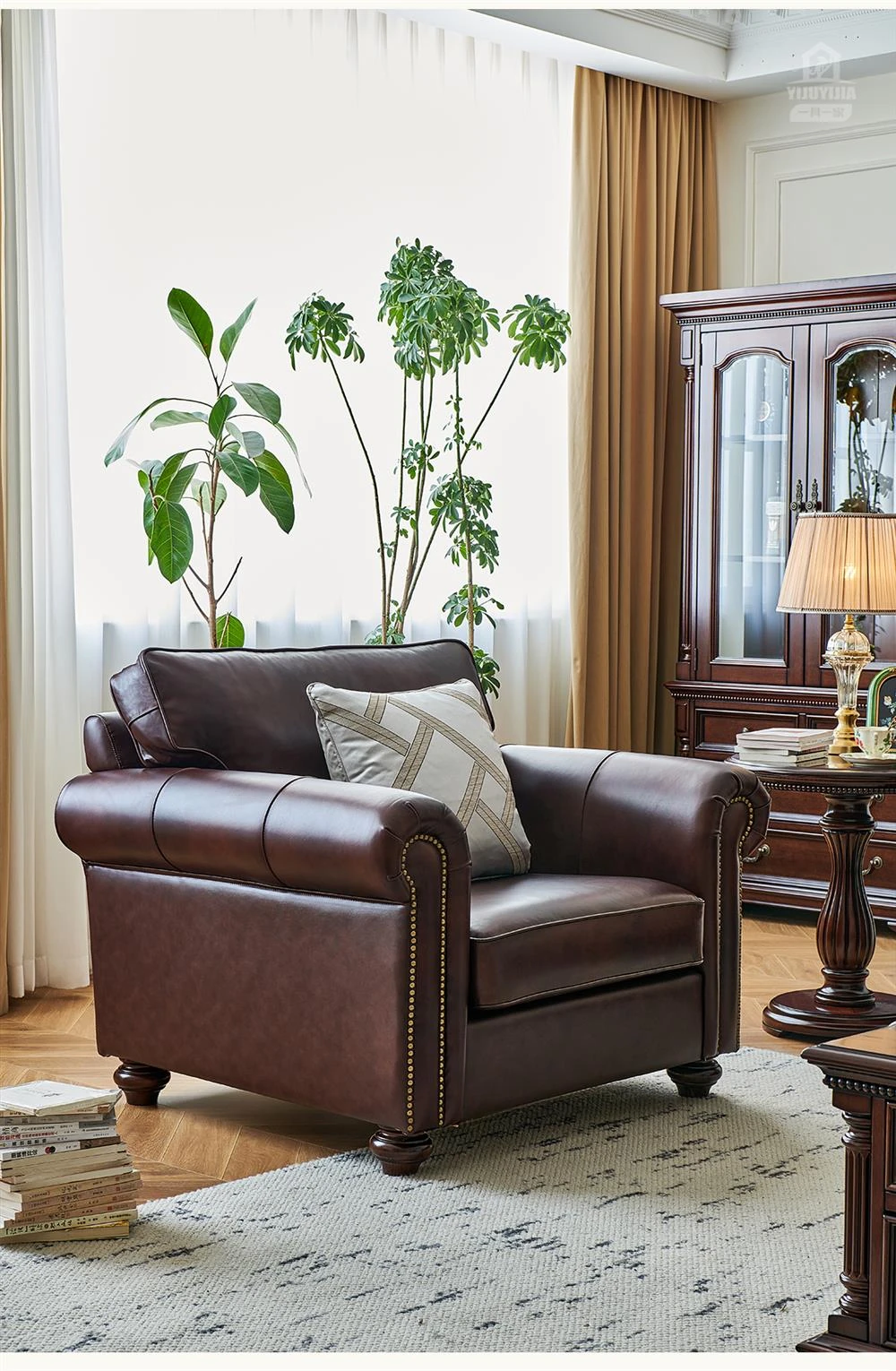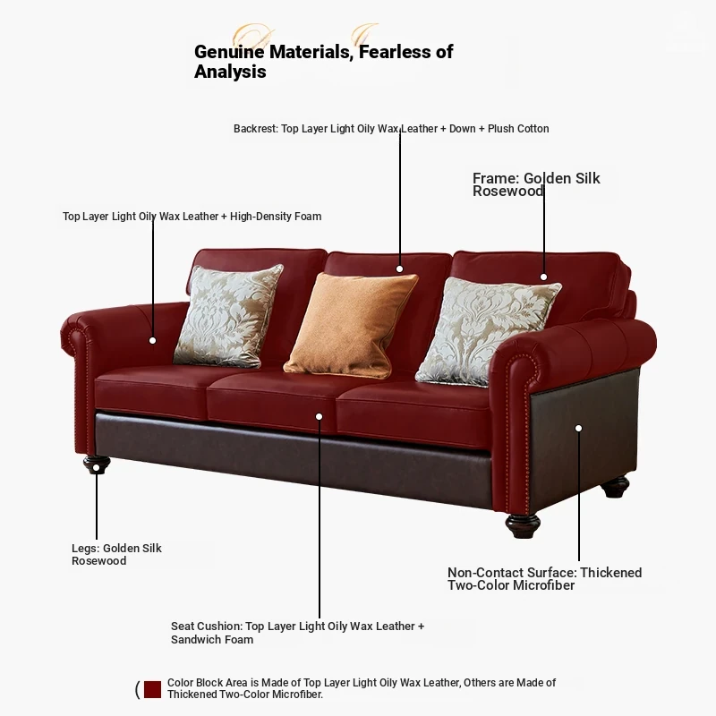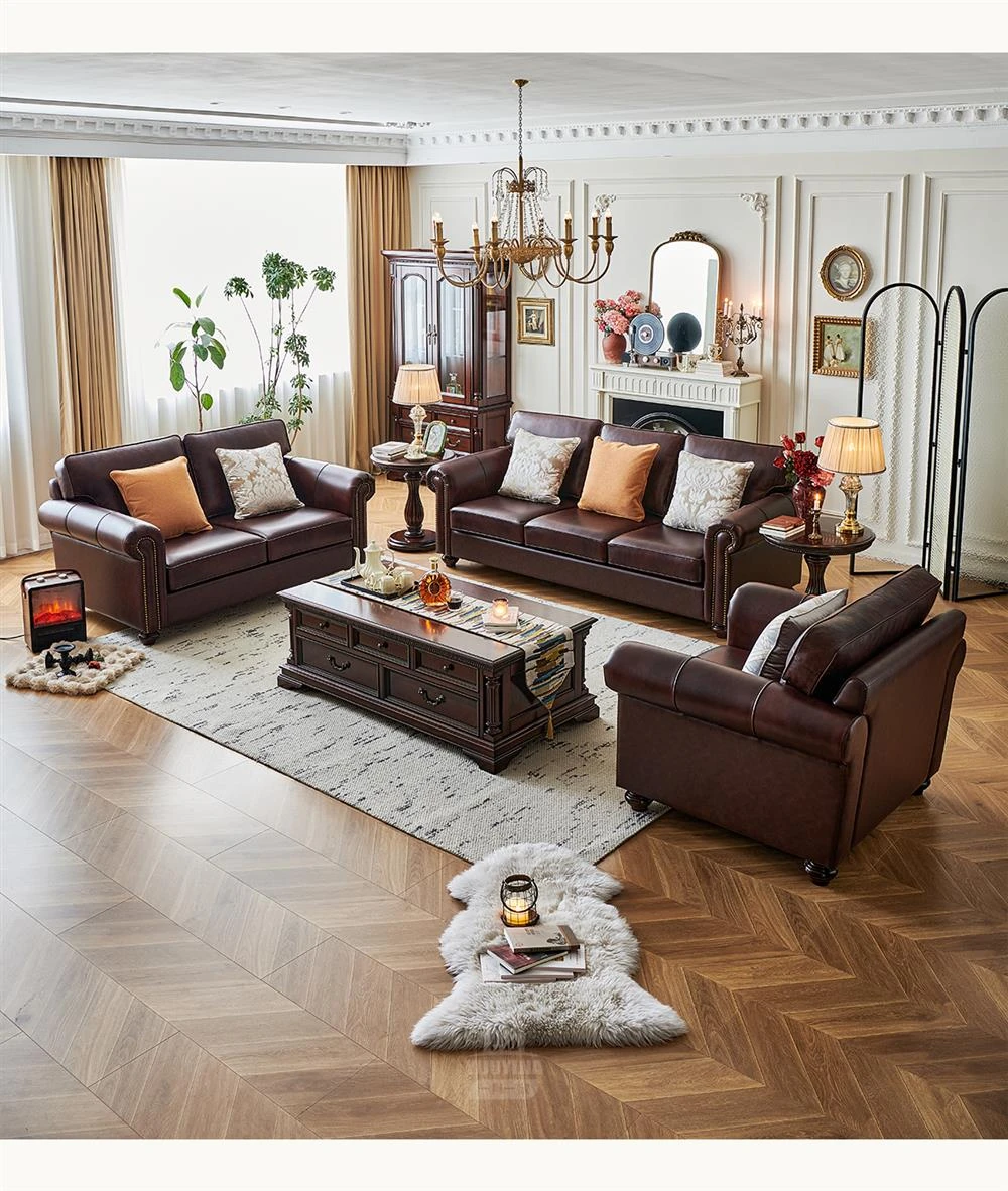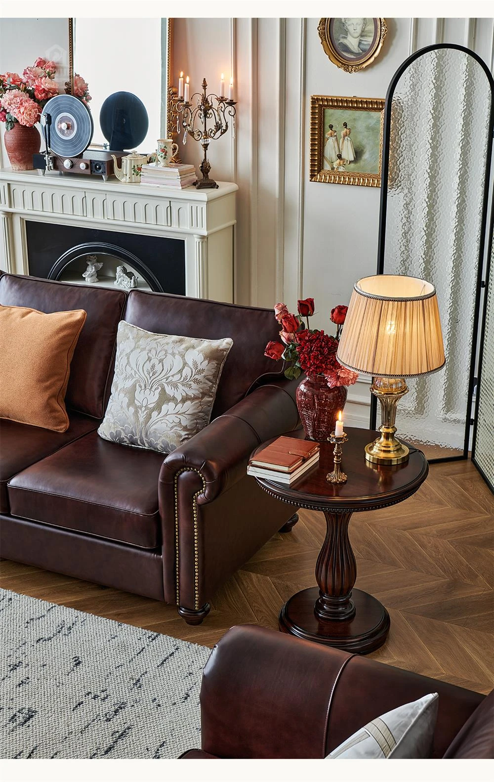 American Vintage Genuine Leather Sofa - Large Button Design, Top Grain Oil Wax Leather, Perfect for Small Living Rooms, 3-Seater Solid Wood Sofa