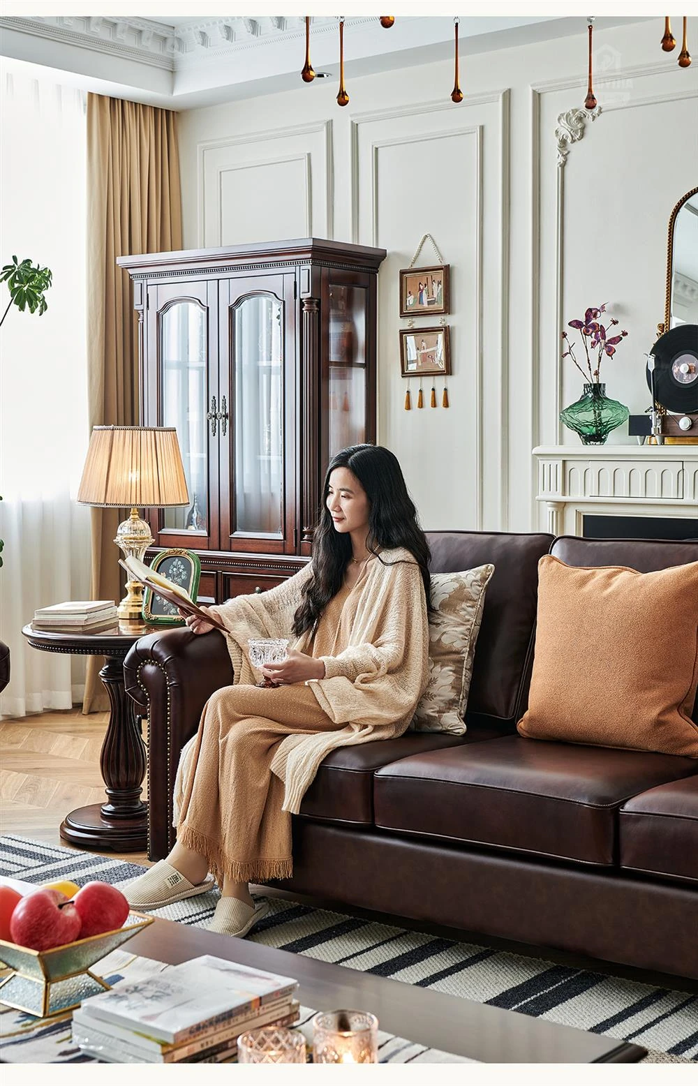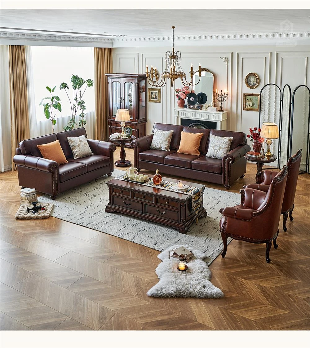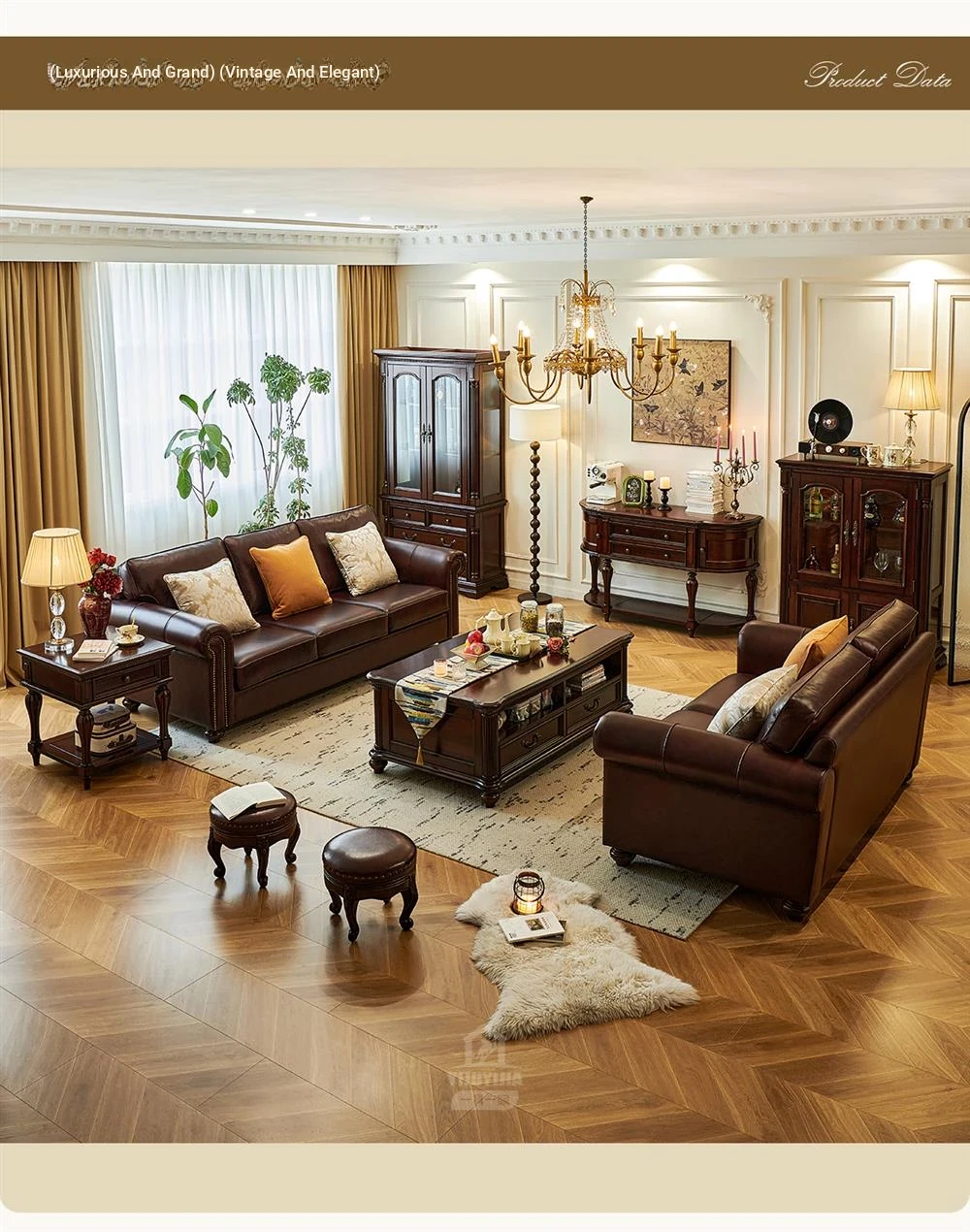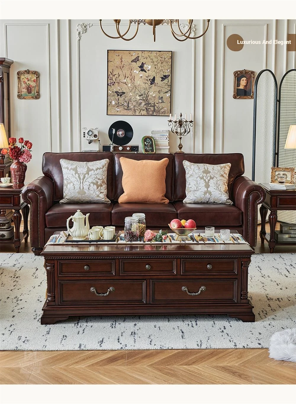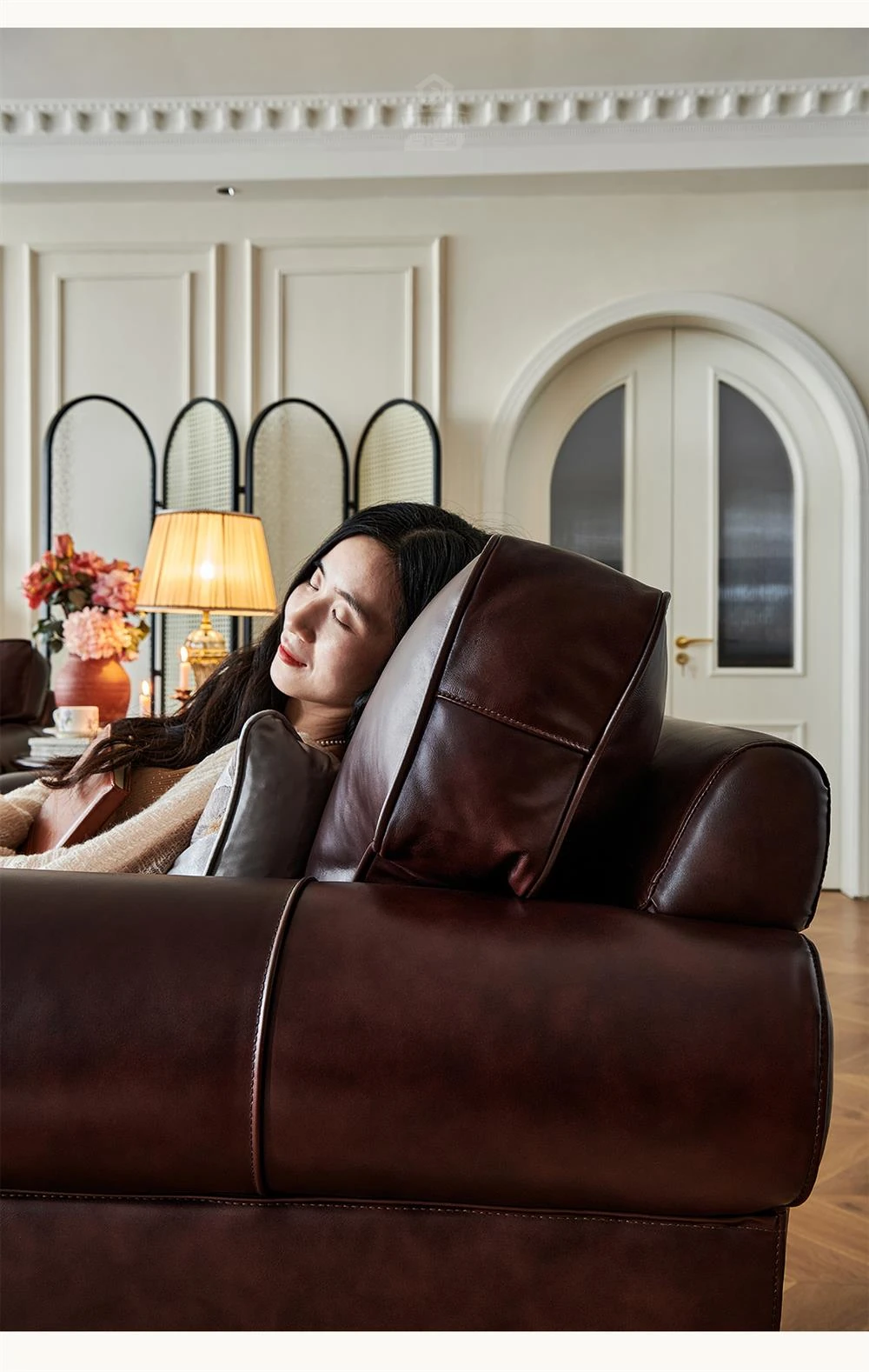 American Vintage Genuine Leather Sofa - Large Button Design, Top Grain Oil Wax Leather, Perfect for Small Living Rooms, 3-Seater Solid Wood Sofa