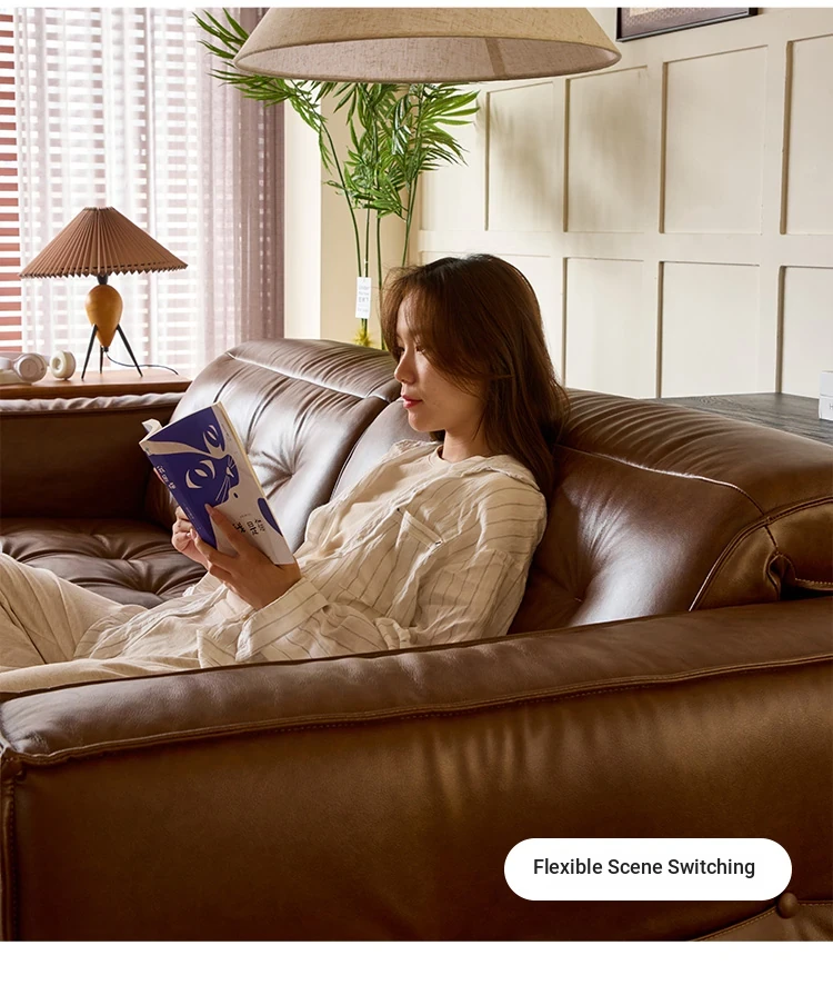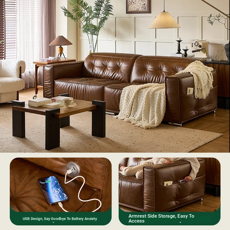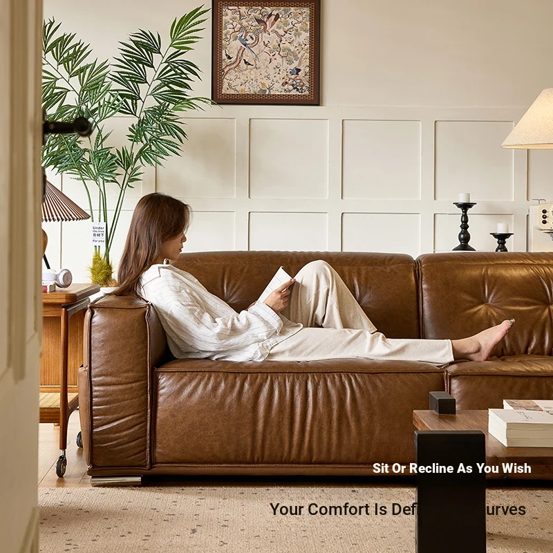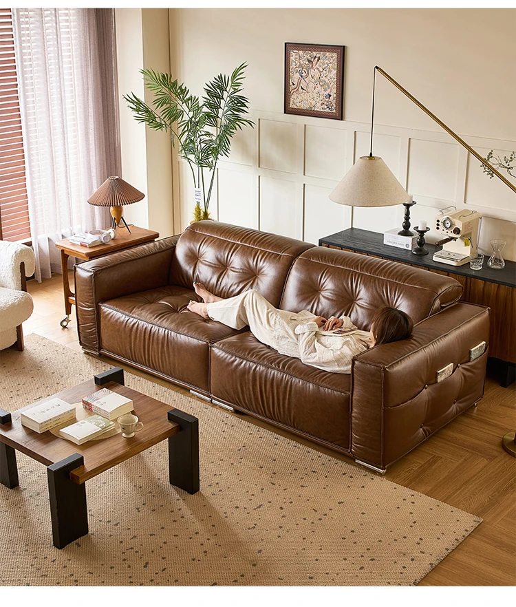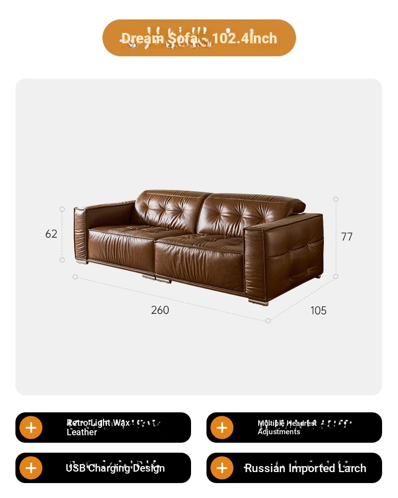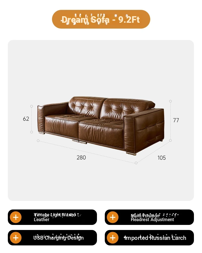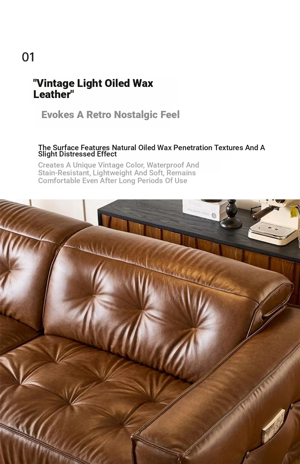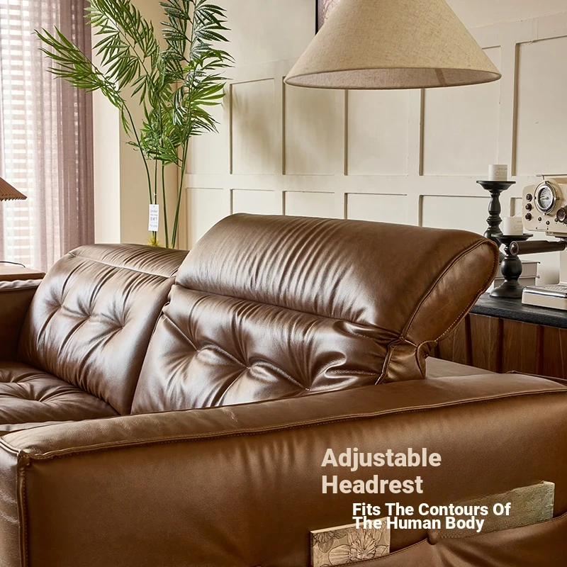 Dream Sofa Retro Waxed Leather Genuine Leather Sofa - Adjustable Backrest Vintage Style Three-Seat Living Room Couch
