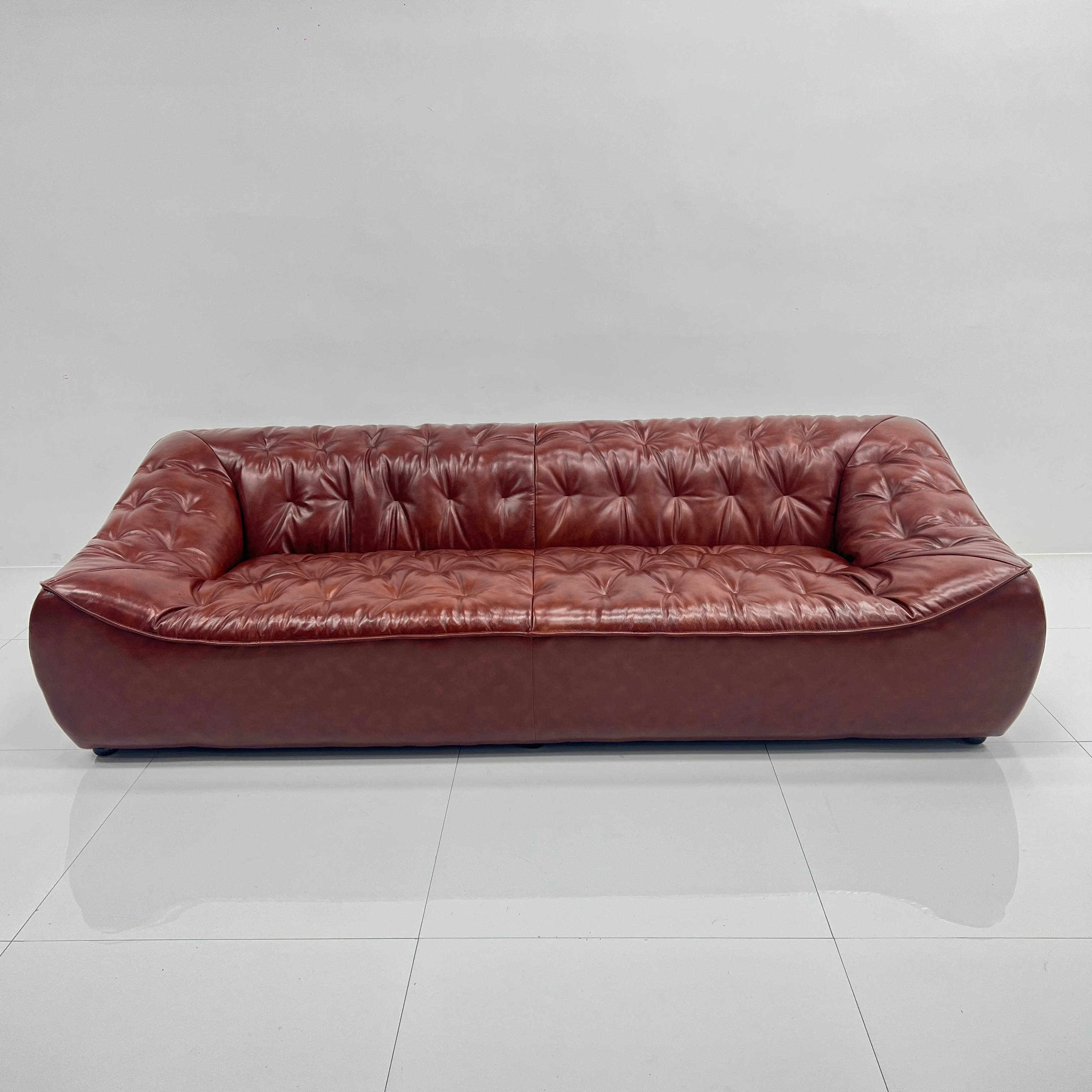 Vintage Waxed Leather Designer Sofa - Retro French Style Living Room Sofa with Pull-Tab, Perfect for Chic Interiors and Cozy Lounging.