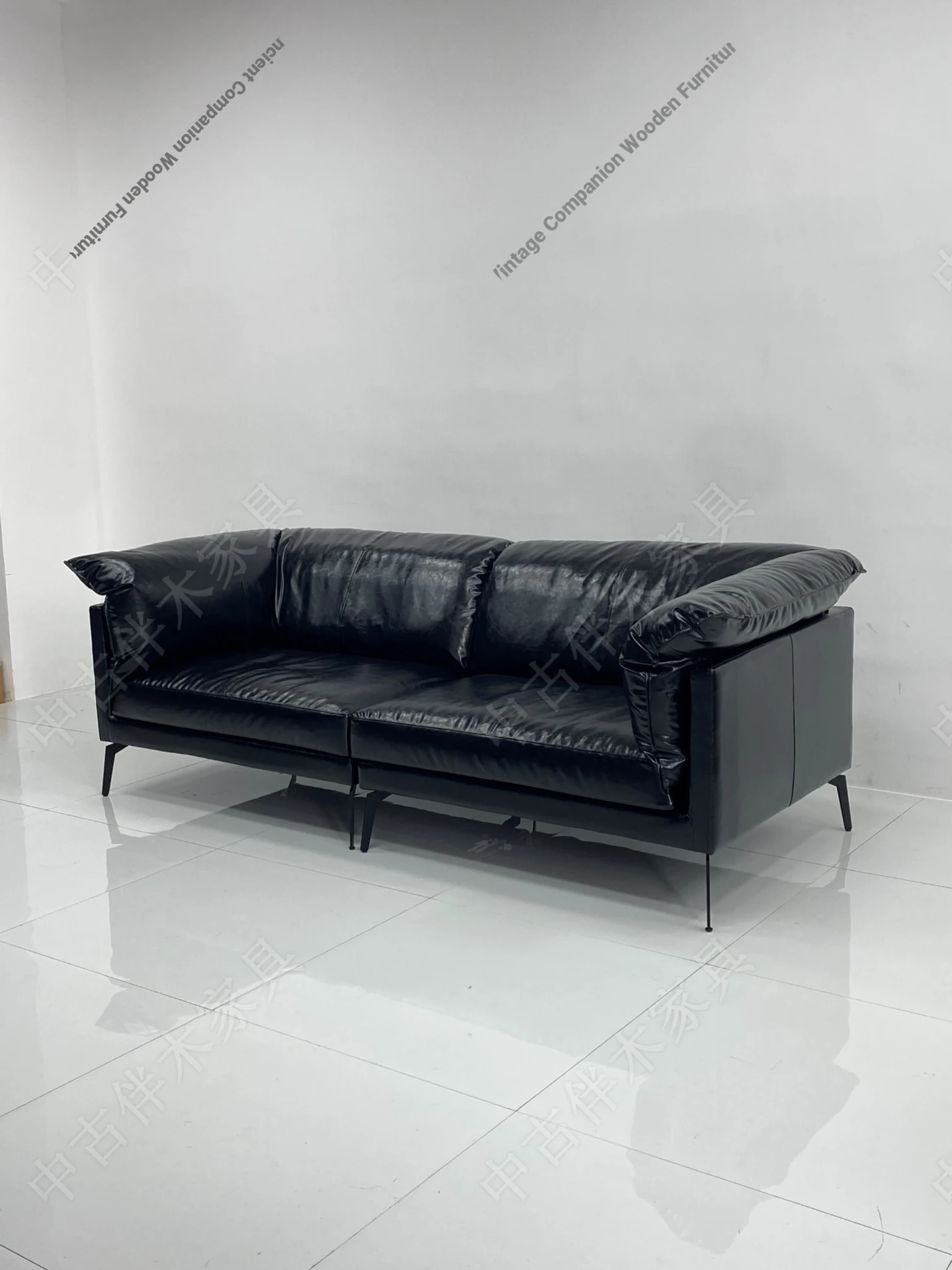 2025 New French Vintage Black Genuine Leather Sofa for Small Living Rooms - Luxurious Black Full-Grain Leather with Antique Style