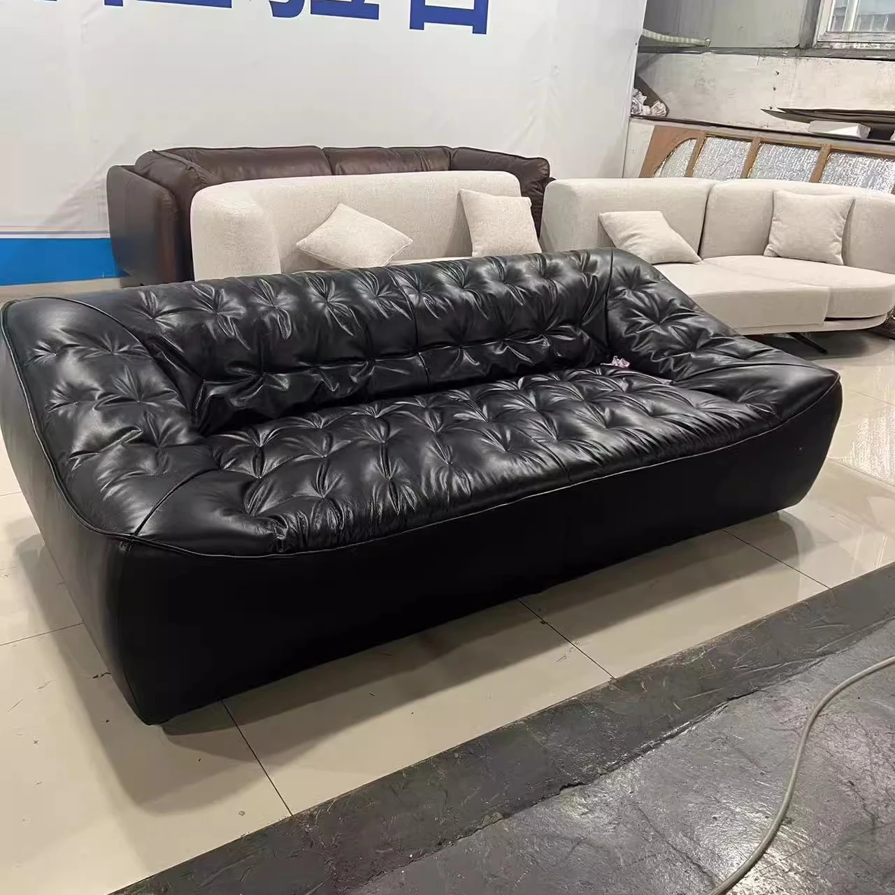 American-Style Light Luxury Vintage Bean Bag Sofa - Full Wax Leather Mid-Century Design for Small Living Rooms, 3-Seater Genuine Leather Couch