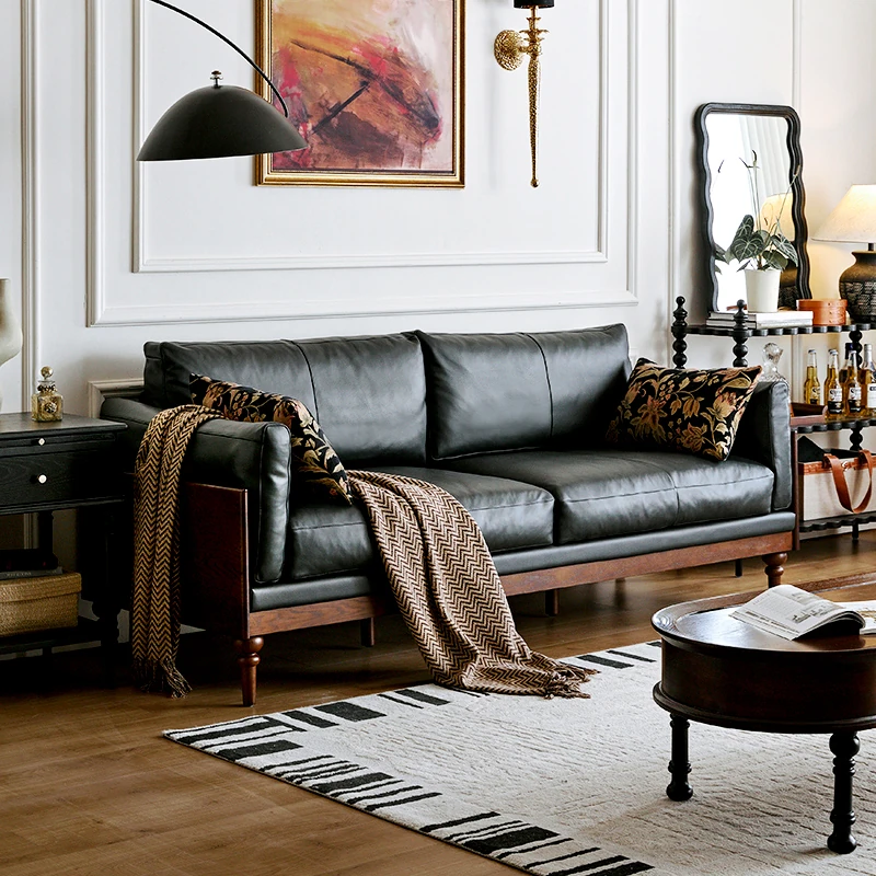 2025 New French Style Solid Wood Genuine Leather Sofa - Vintage Black for Small Living Rooms, High-End American Design