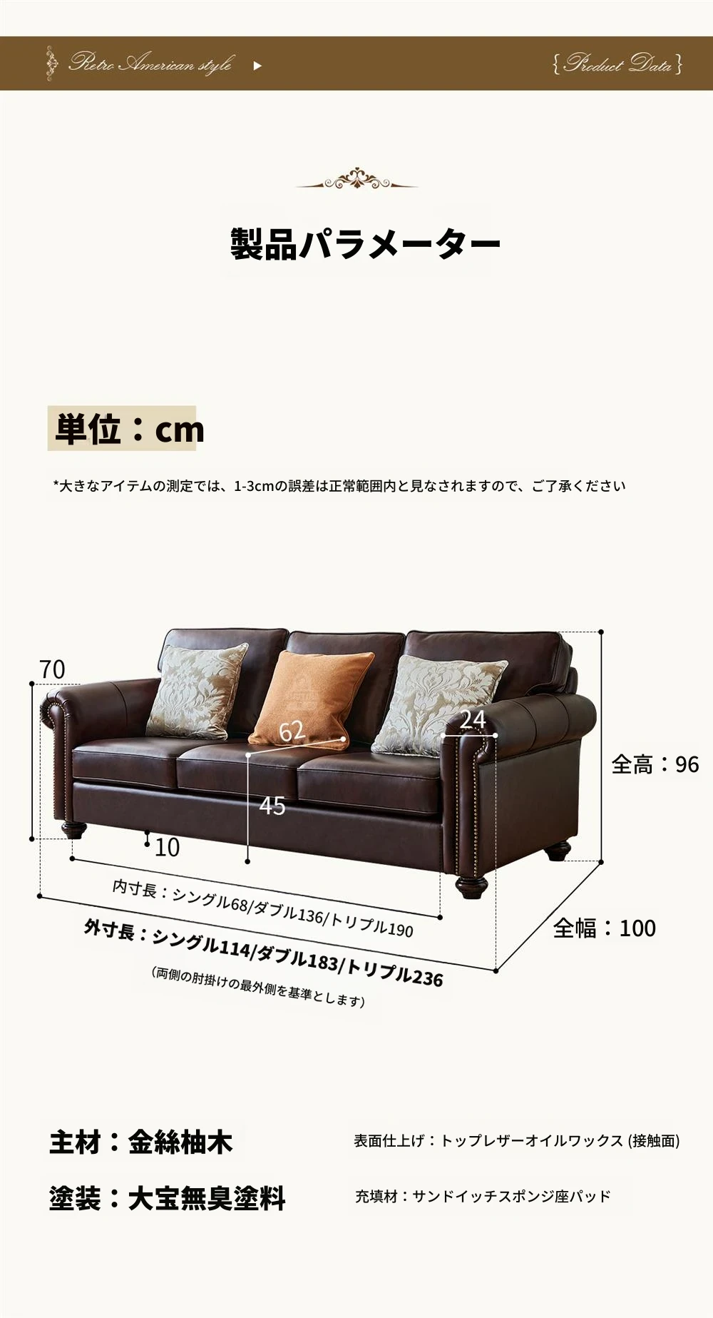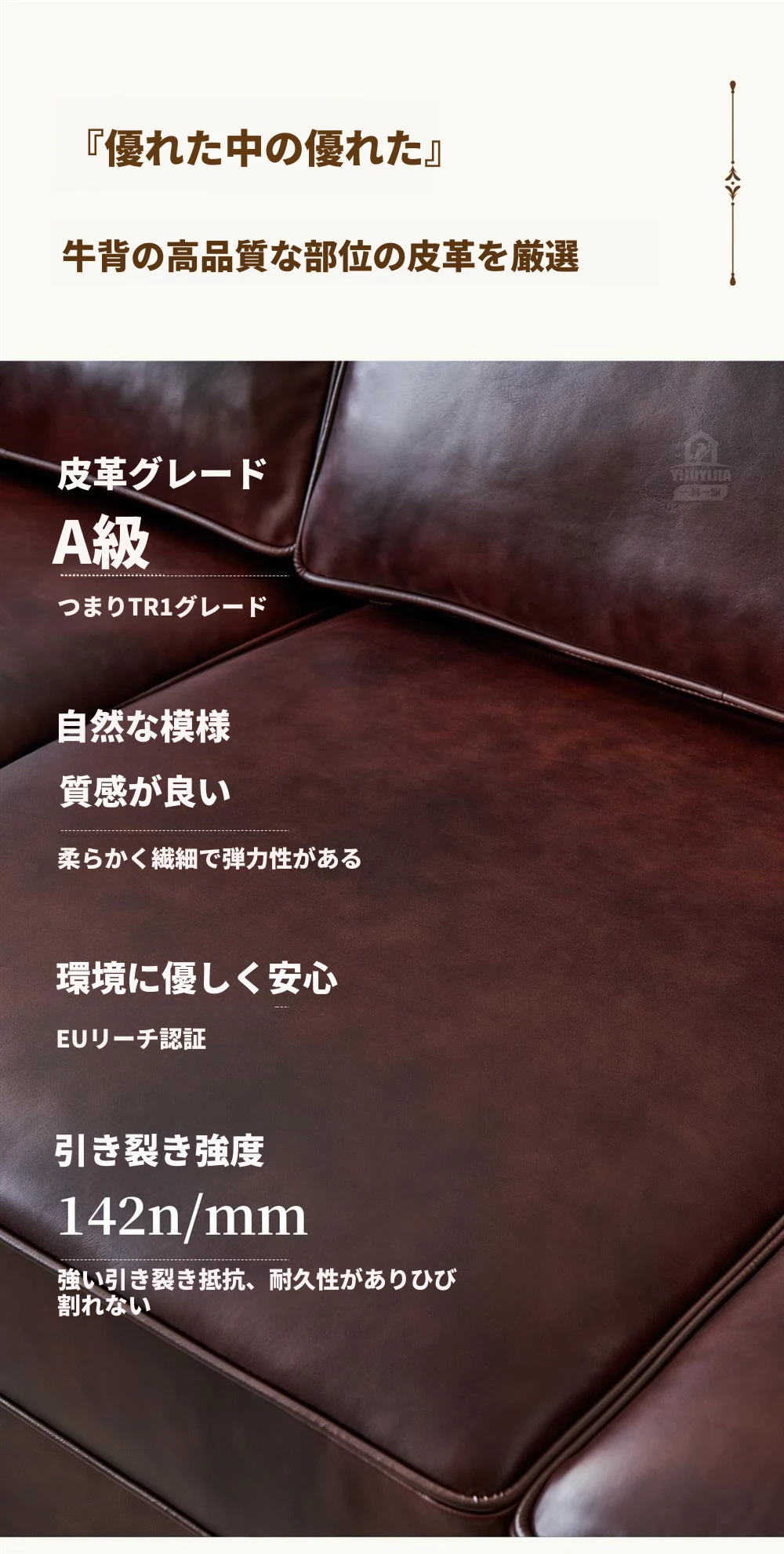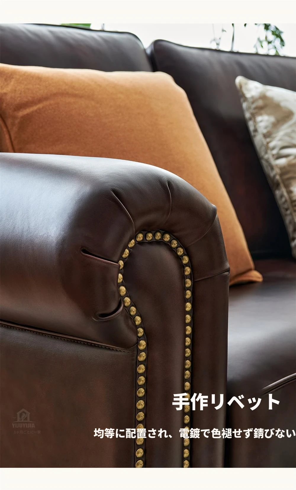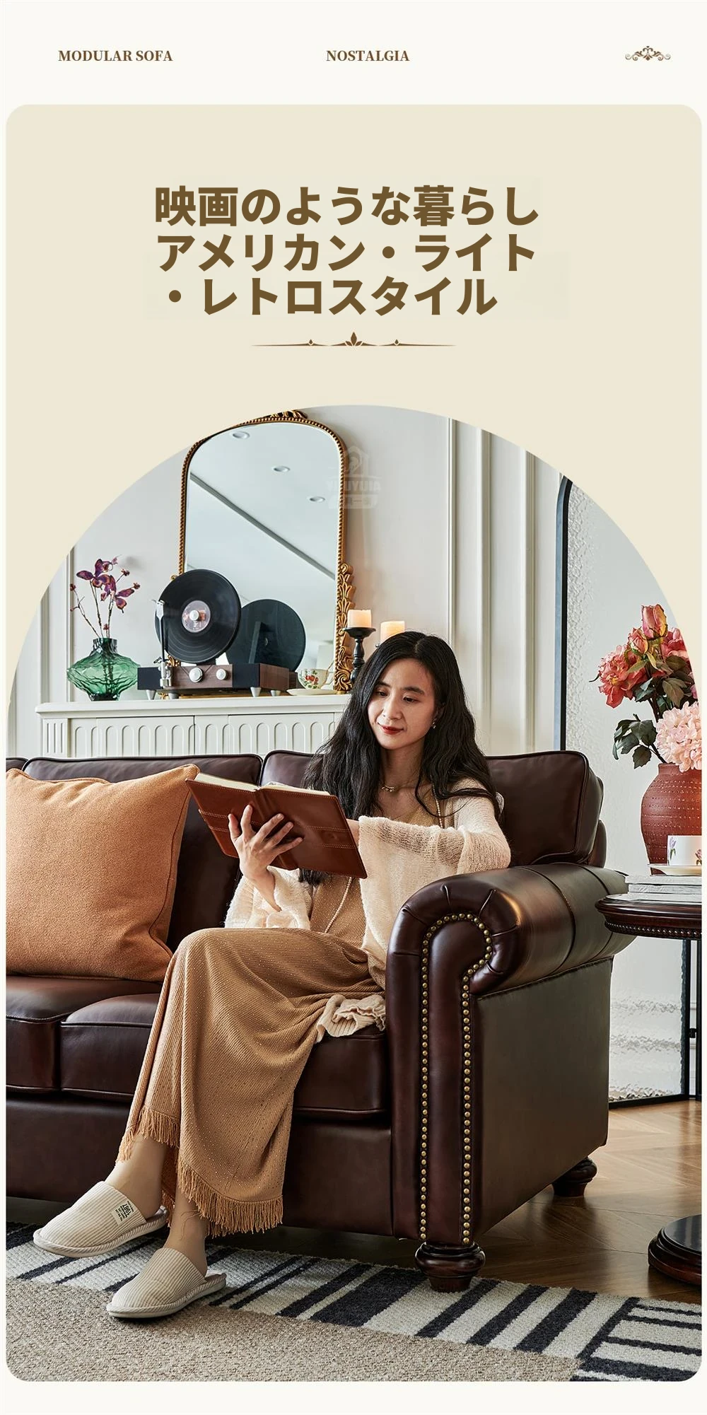 アメリカンレトロ本革ソファー - 大バットンのトップグレインオイルワックスレザー使用、小型リビングにぴったりな3人掛け無垢材ソファ!高級感溢れるデザインで、居心地の良い空間を演出します。