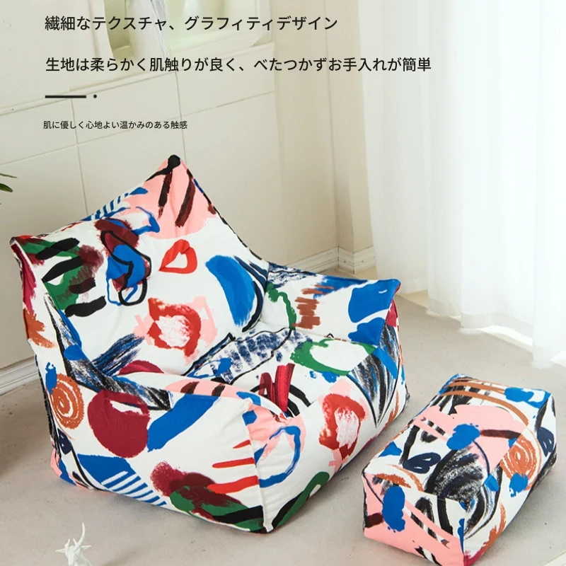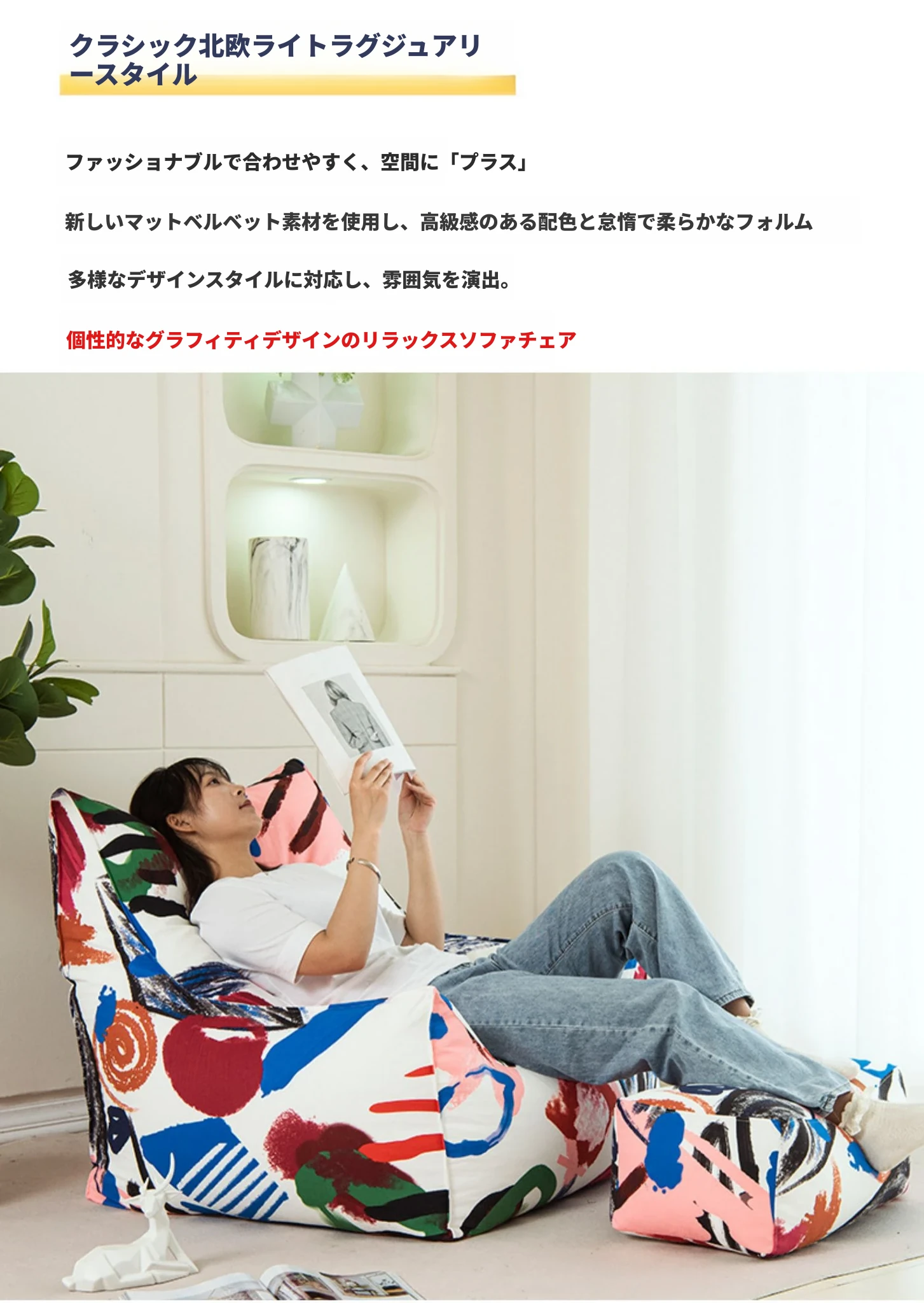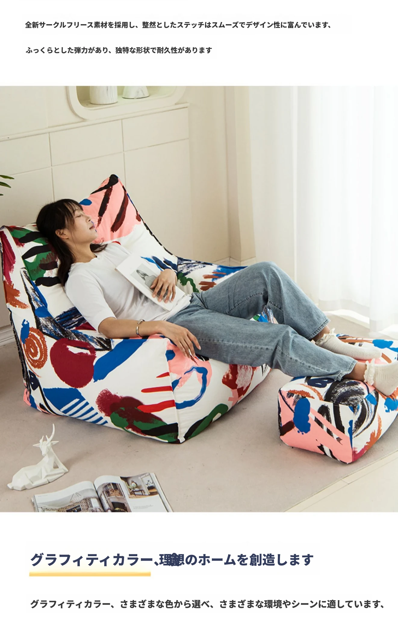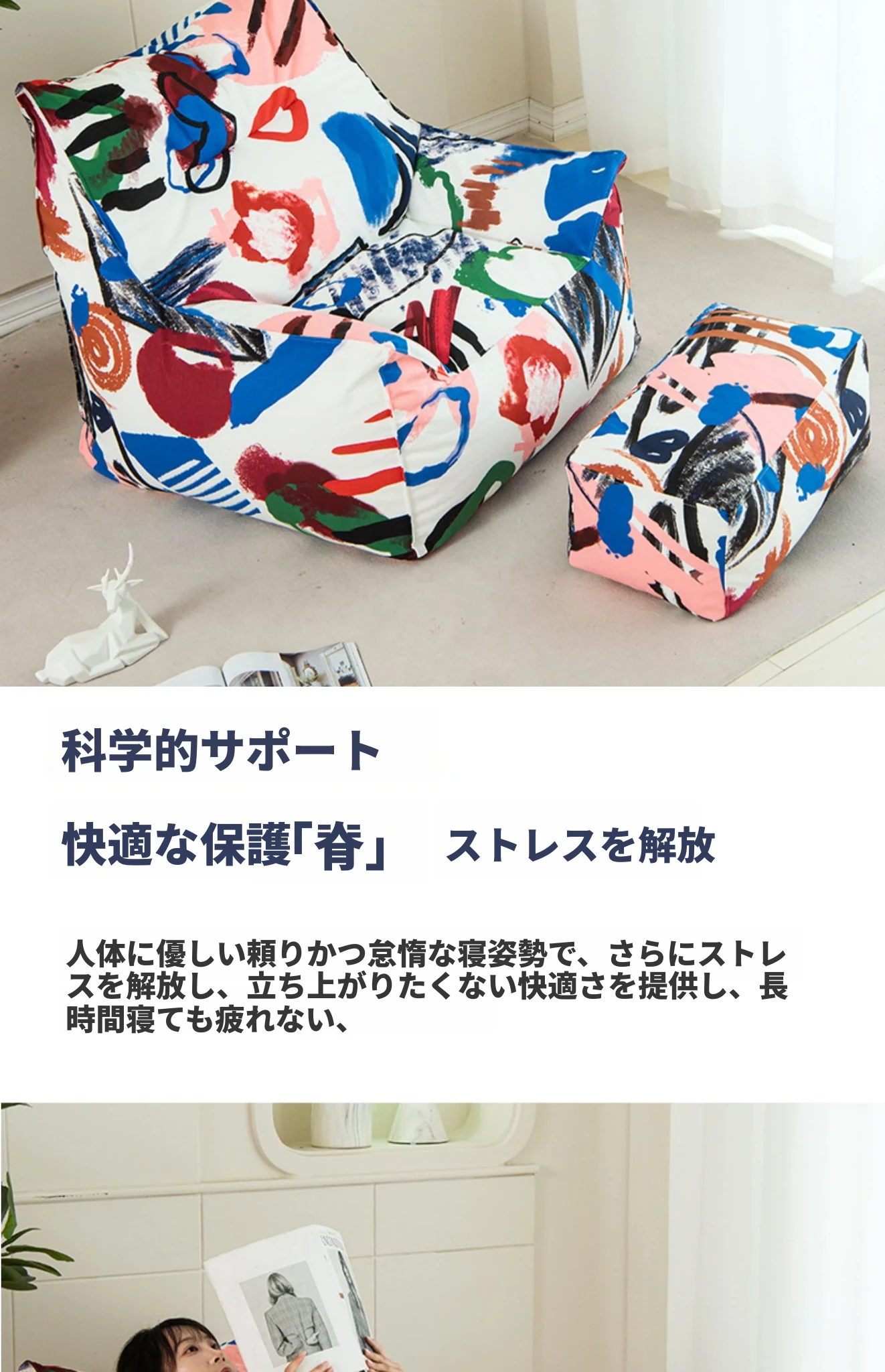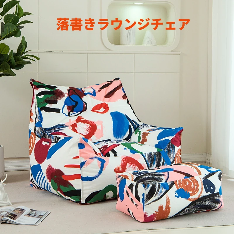 おしゃれな落書きデザインのリラックスソファ!座るもよし、寝るもよし、横になるもよし。バルコニーやリビング、寝室にぴったりな一人用座椅子。畳にも最適で、快適なひとときを提供します!