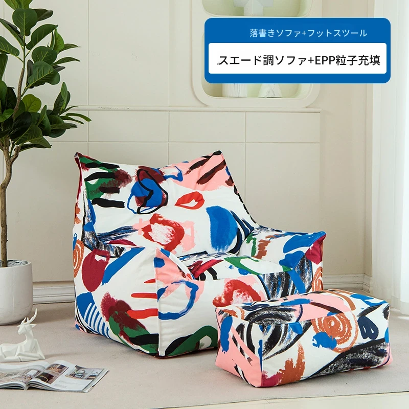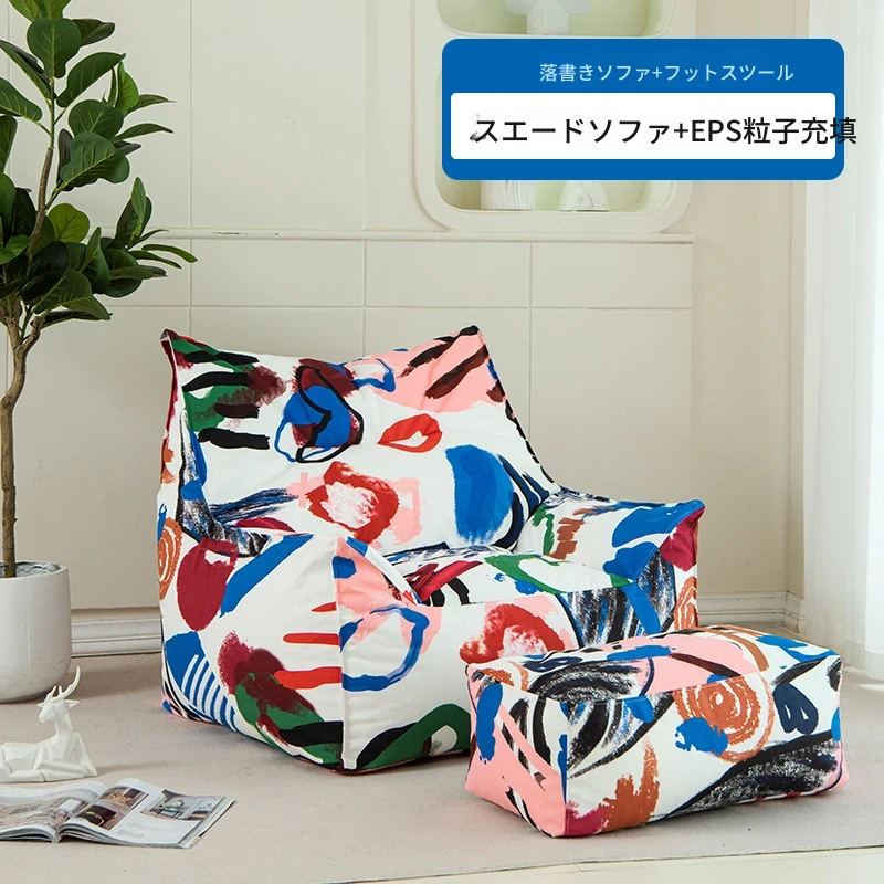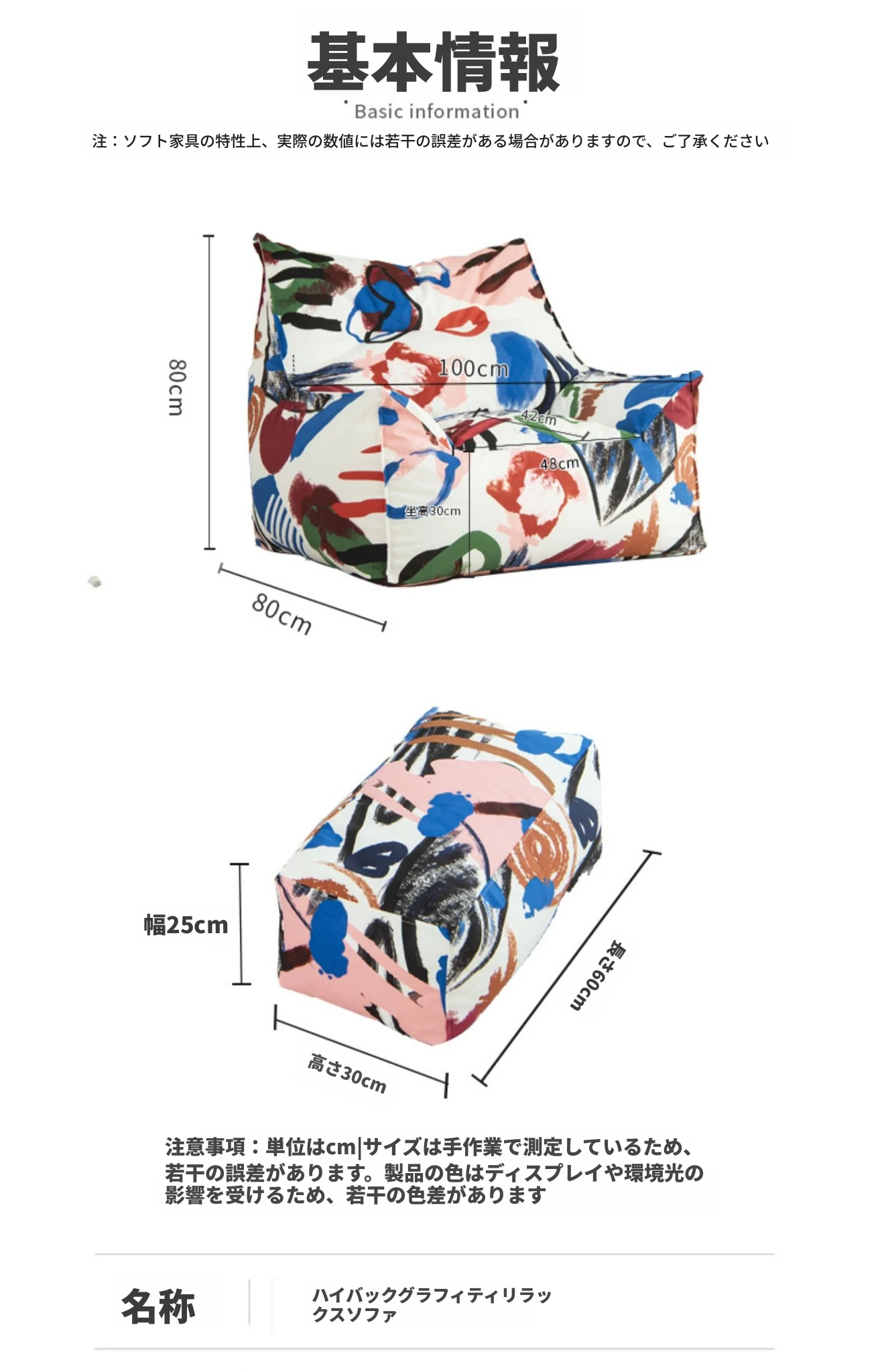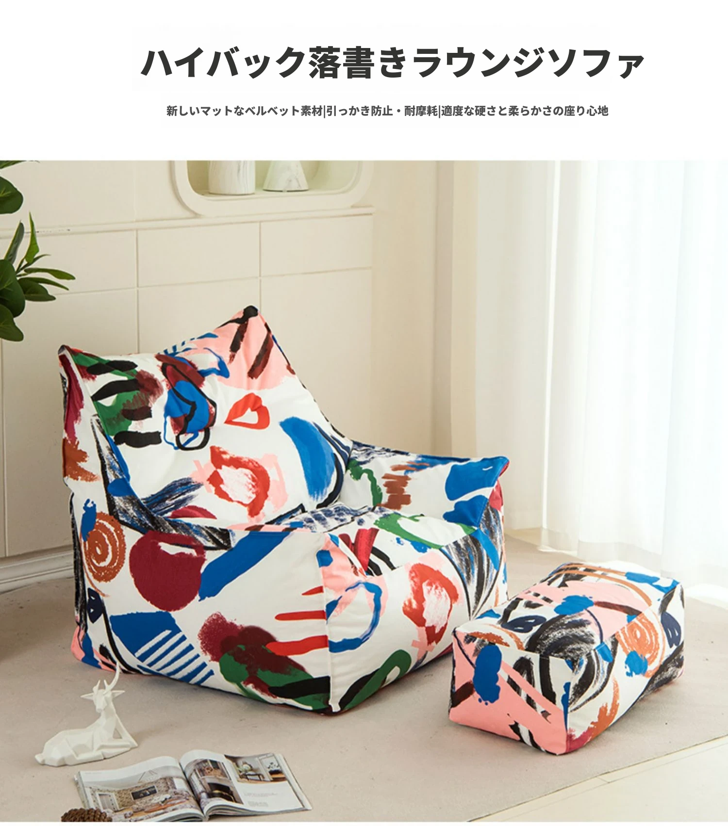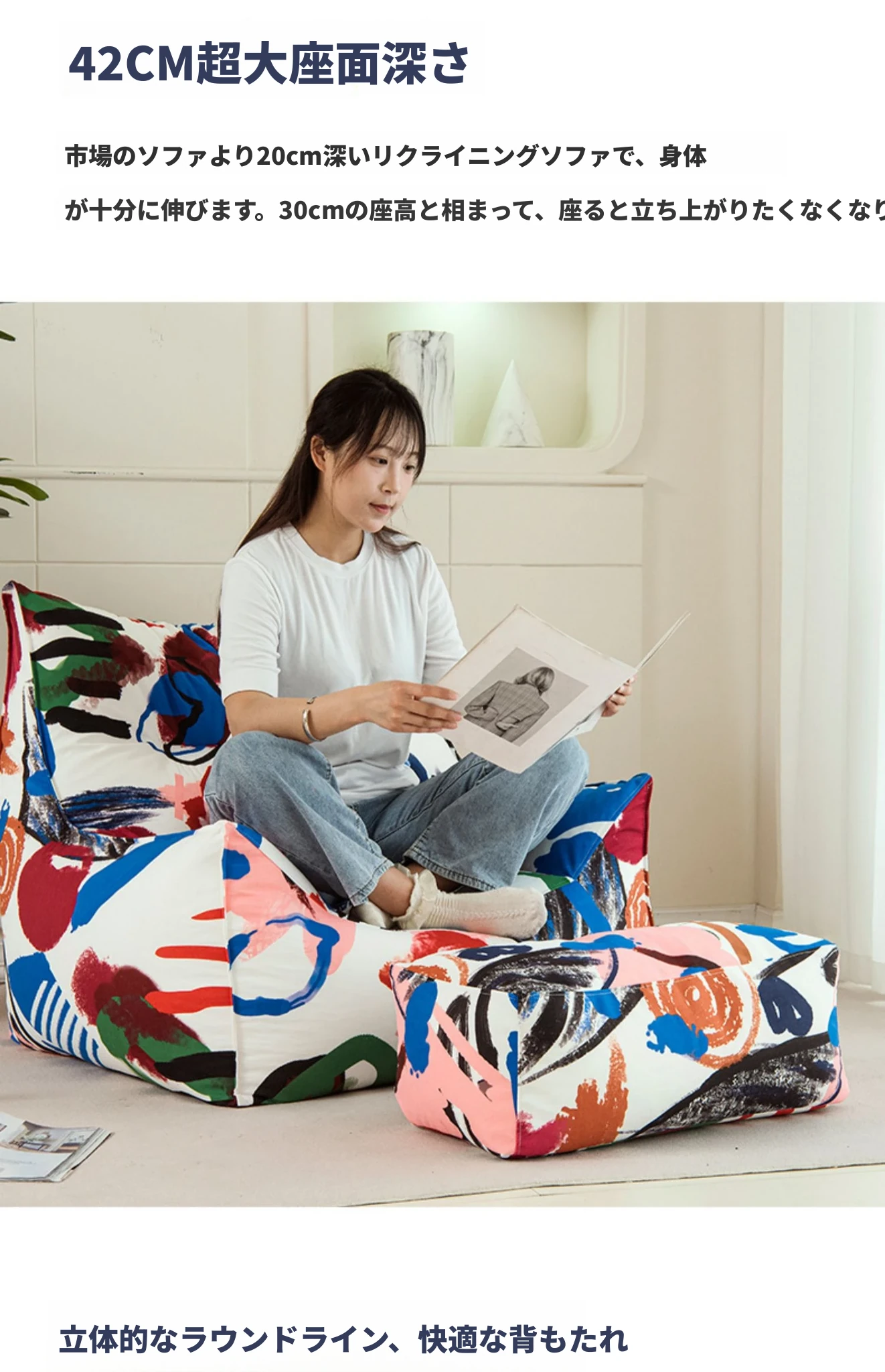 おしゃれな落書きデザインのリラックスソファ!座るもよし、寝るもよし、横になるもよし。バルコニーやリビング、寝室にぴったりな一人用座椅子。畳にも最適で、快適なひとときを提供します!