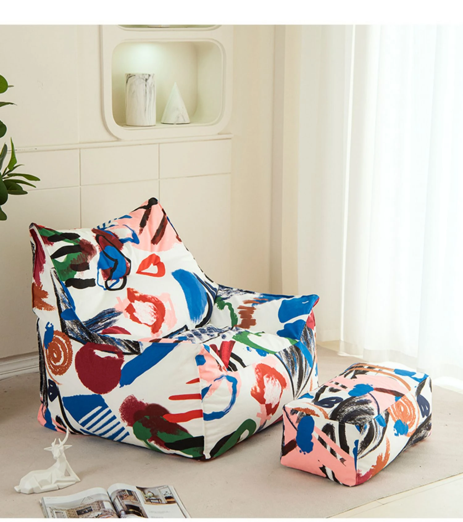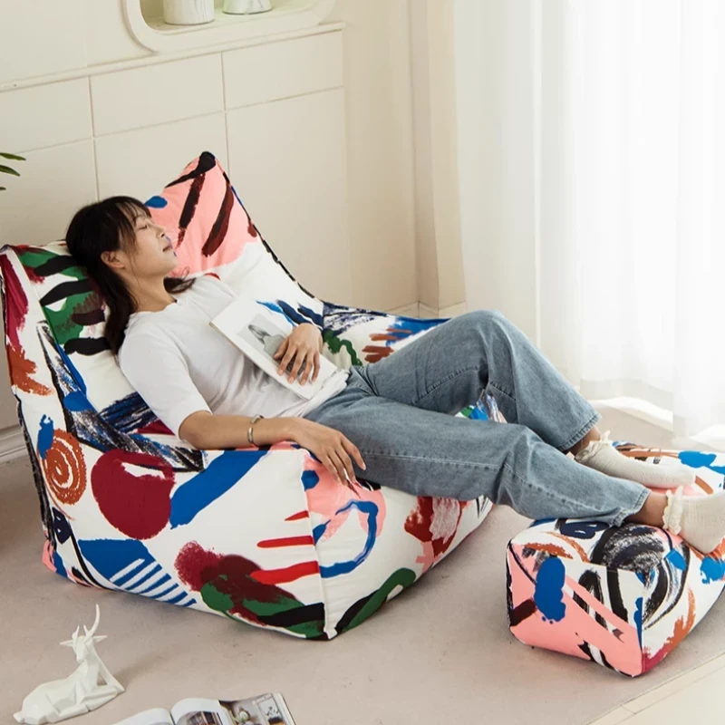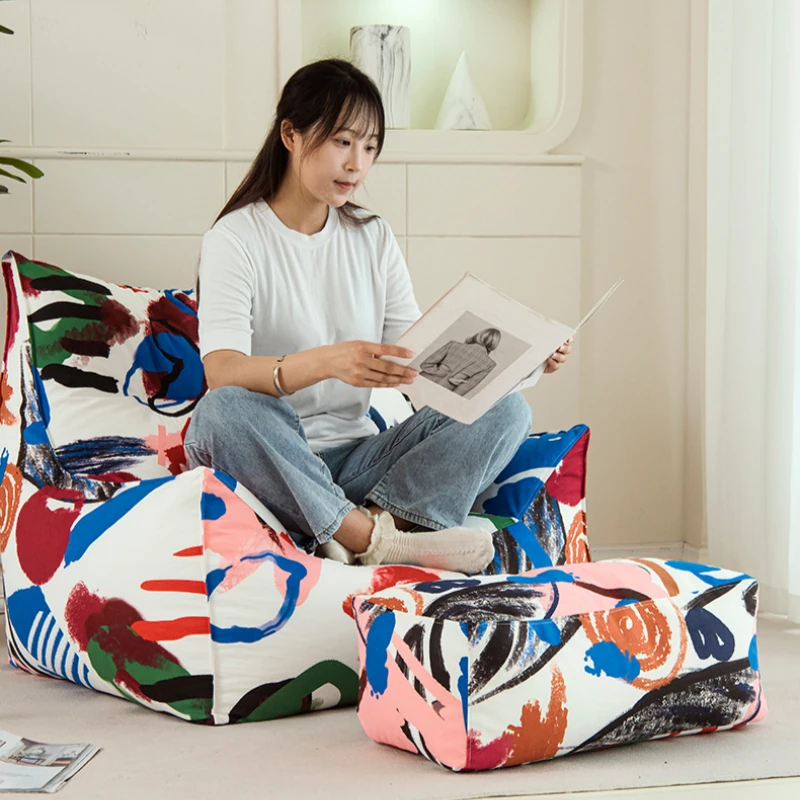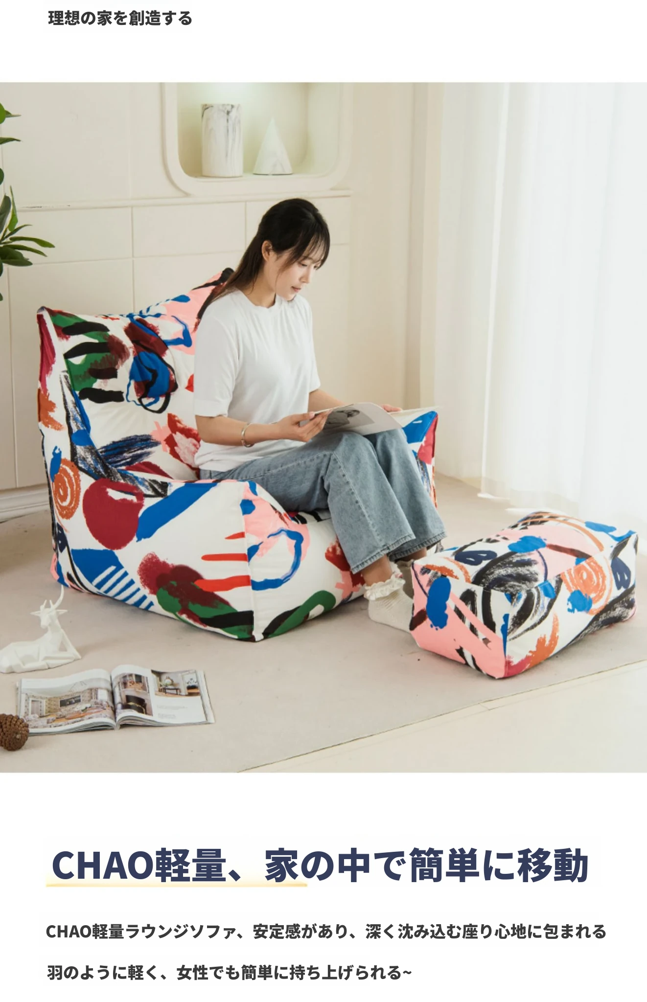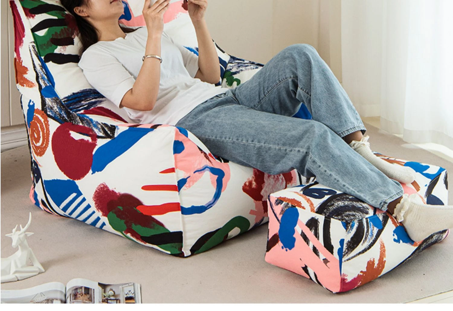 おしゃれな落書きデザインのリラックスソファ!座るもよし、寝るもよし、横になるもよし。バルコニーやリビング、寝室にぴったりな一人用座椅子。畳にも最適で、快適なひとときを提供します!