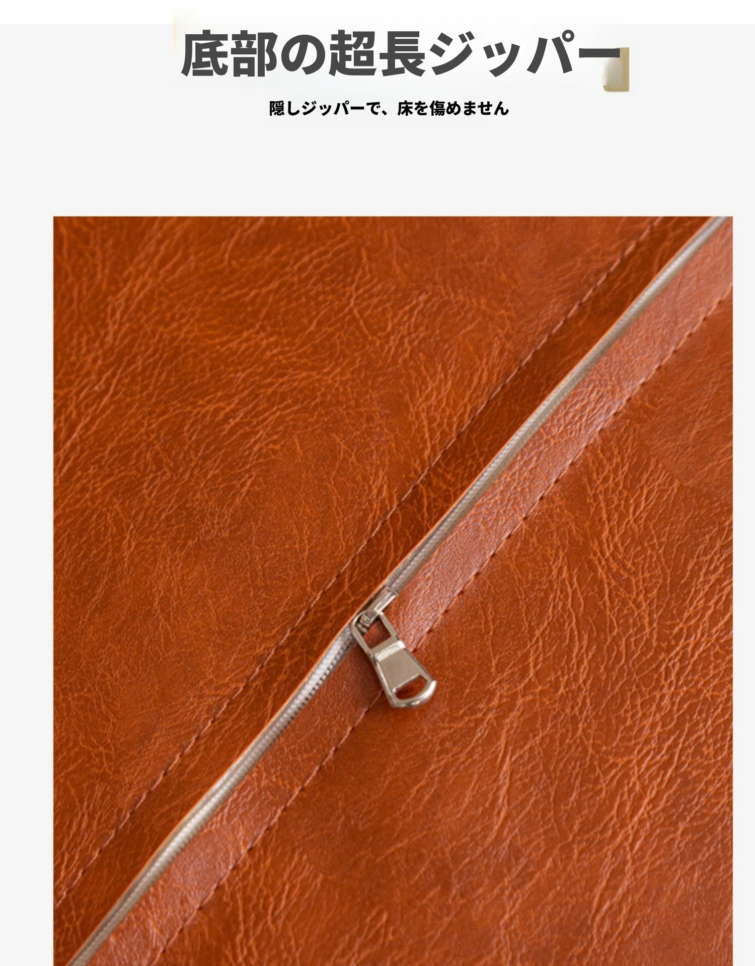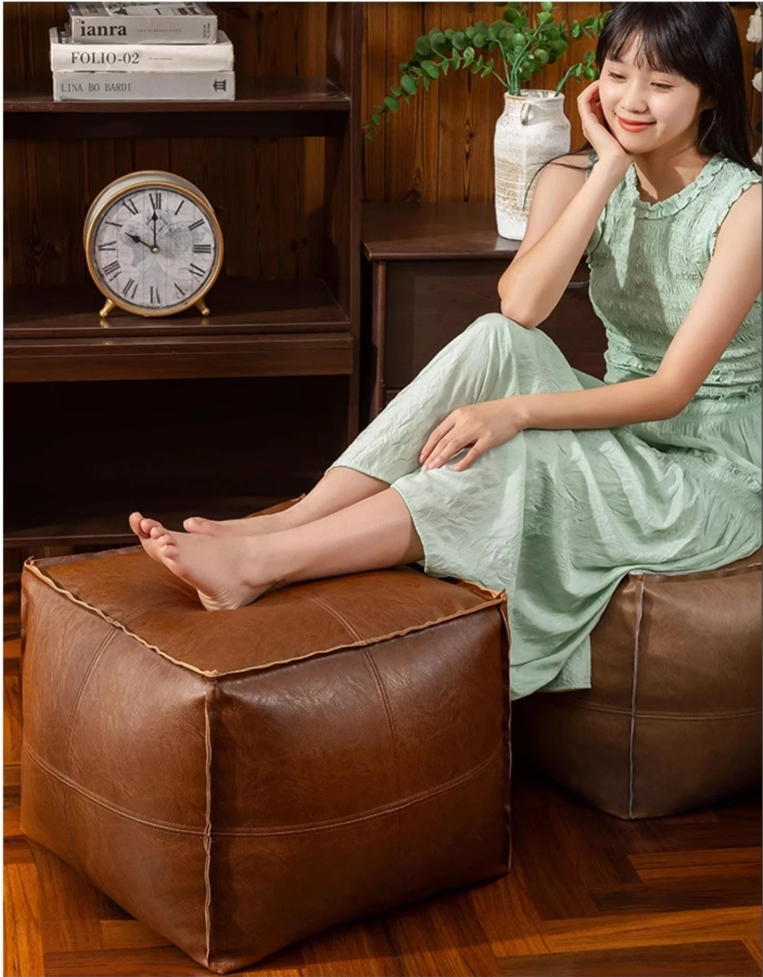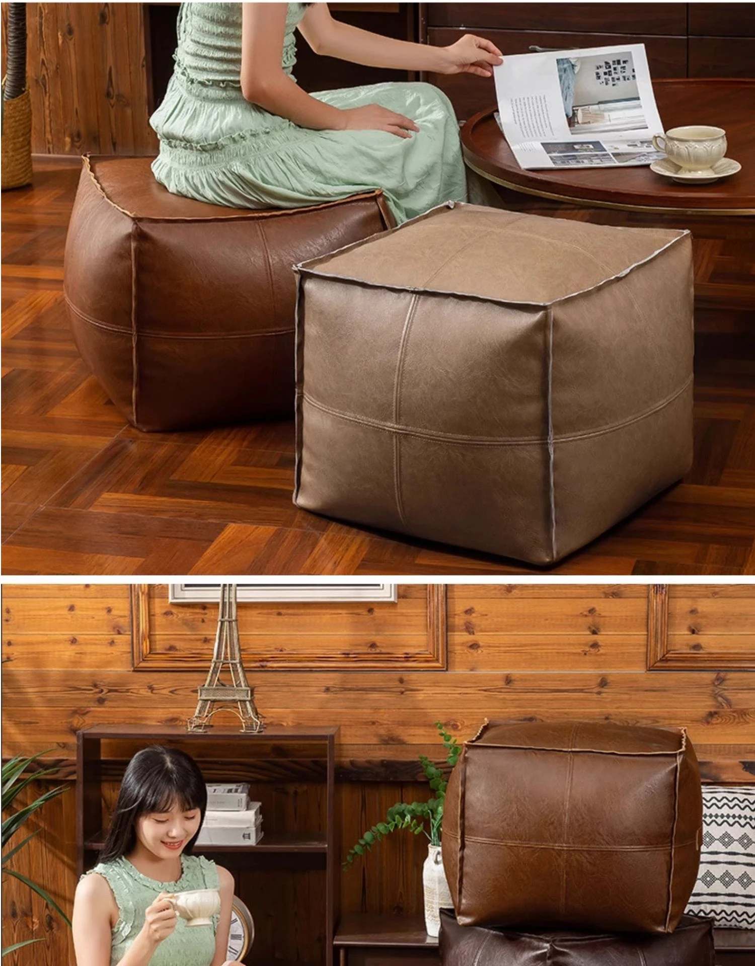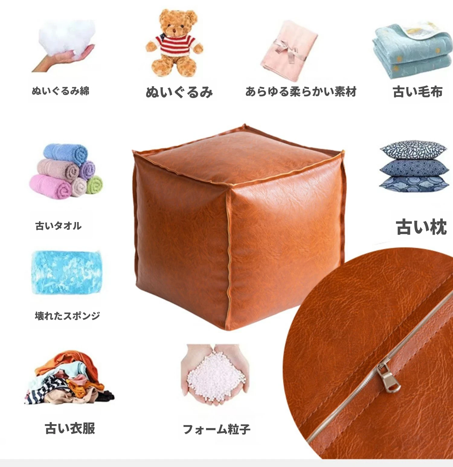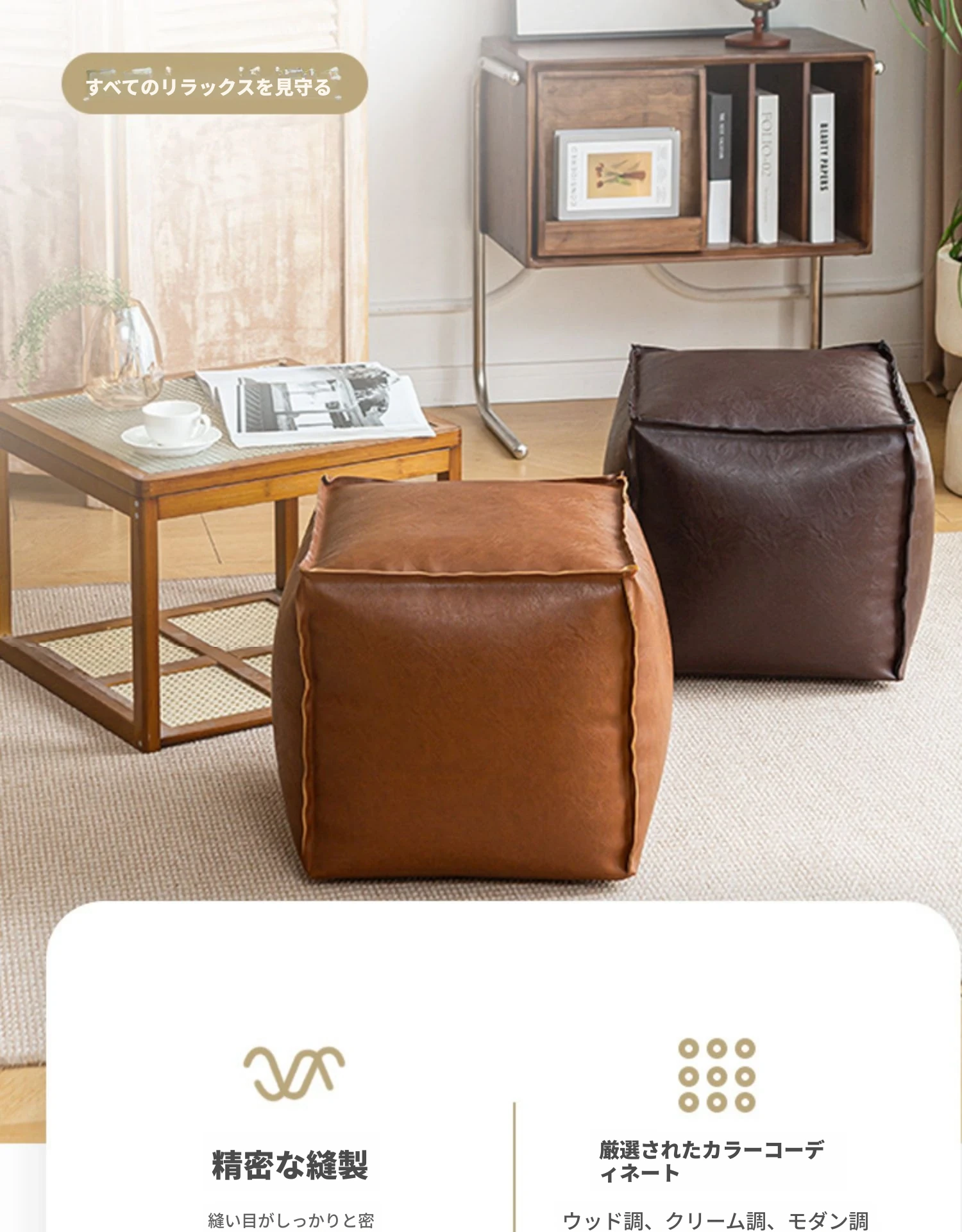 北欧風の手作りレザーラウンジオットマン - リラックスできる座り心地、靴を履くのにも最適!おしゃれな収納機能付きで、古い衣類もスッキリ整理。あなたのリビングにぴったりなアイテム!