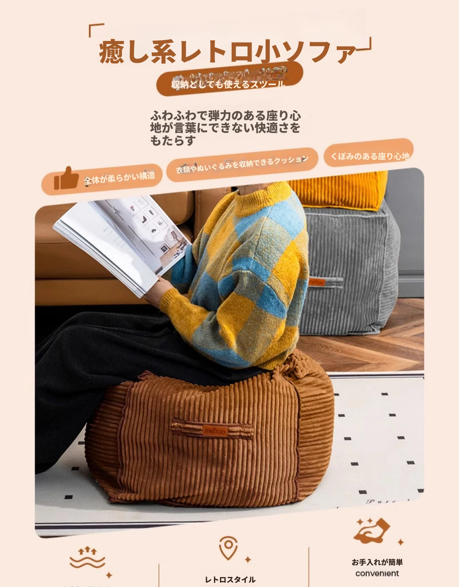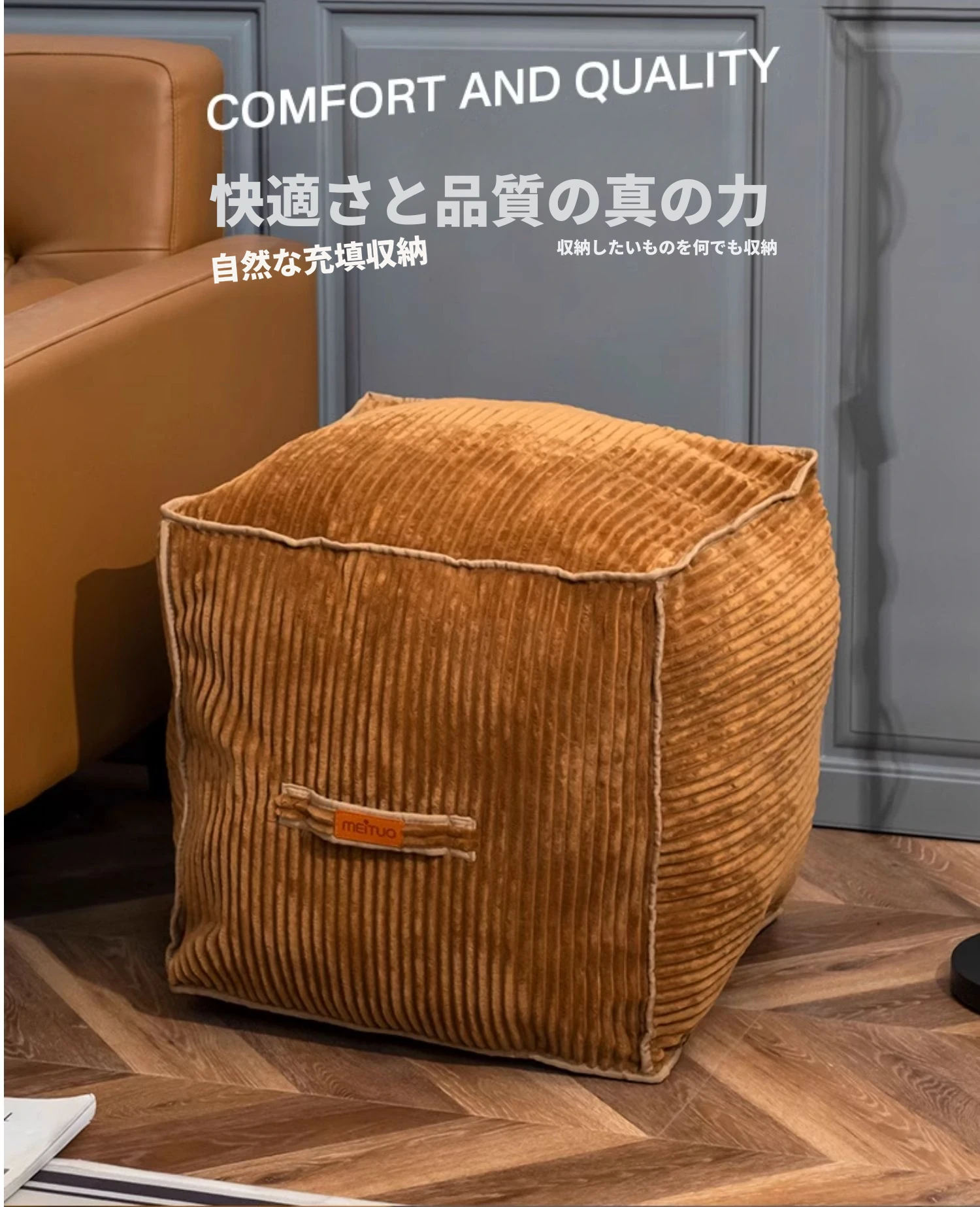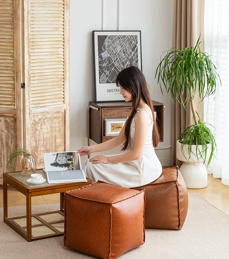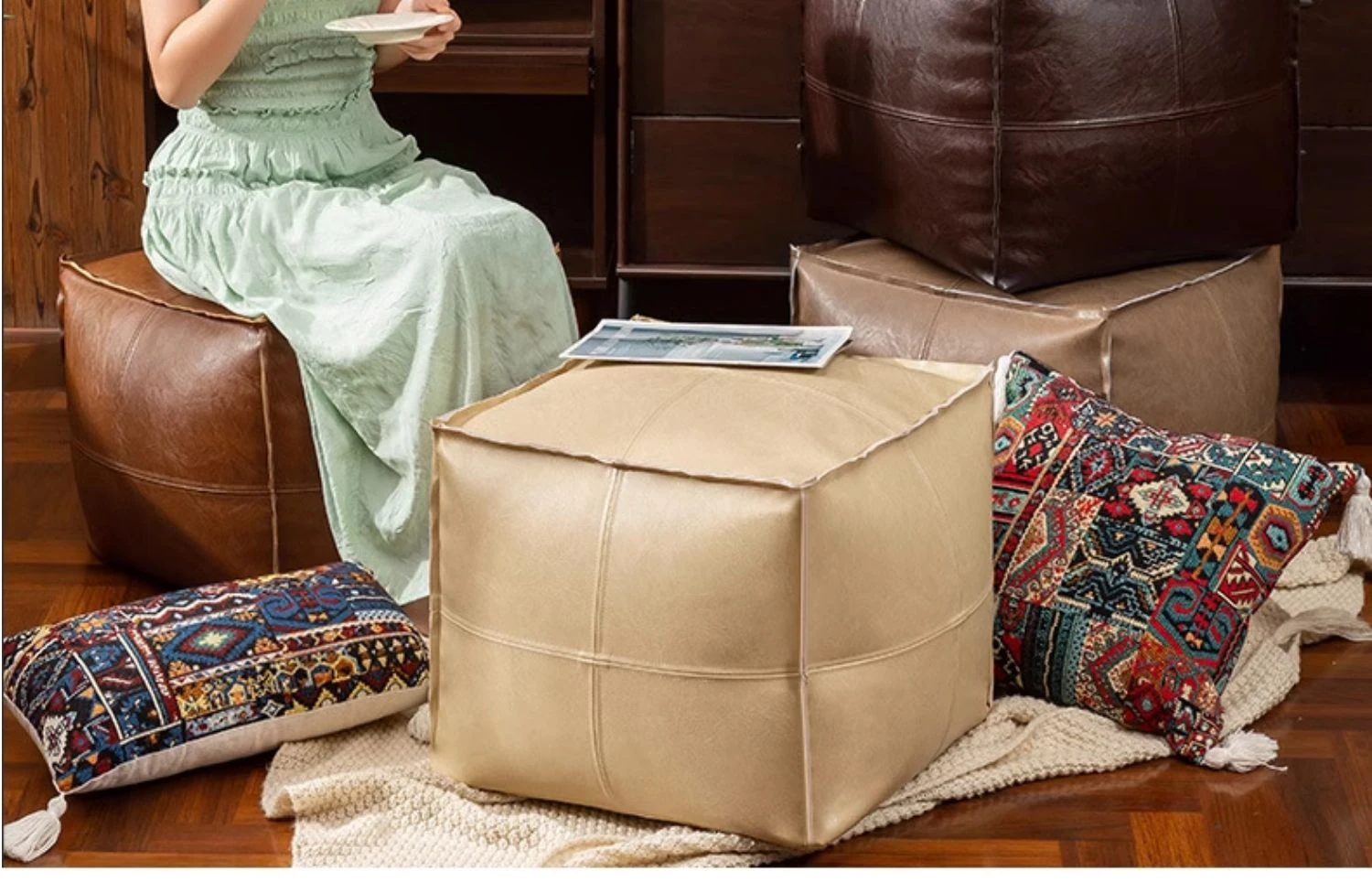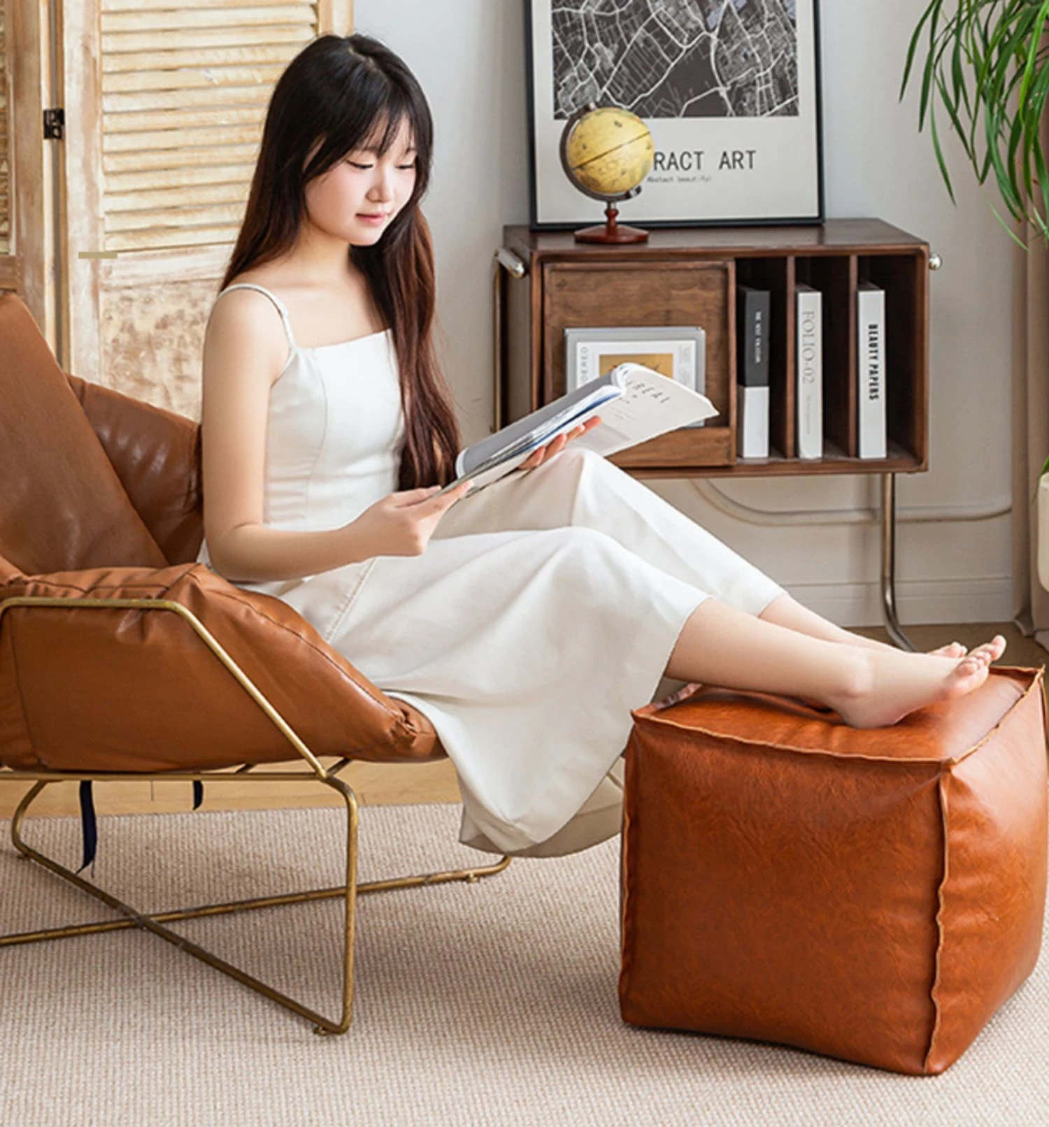 北欧風の手作りレザーラウンジオットマン - リラックスできる座り心地、靴を履くのにも最適!おしゃれな収納機能付きで、古い衣類もスッキリ整理。あなたのリビングにぴったりなアイテム!