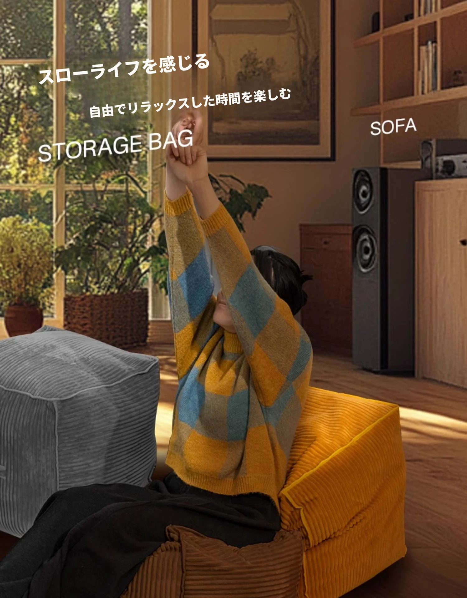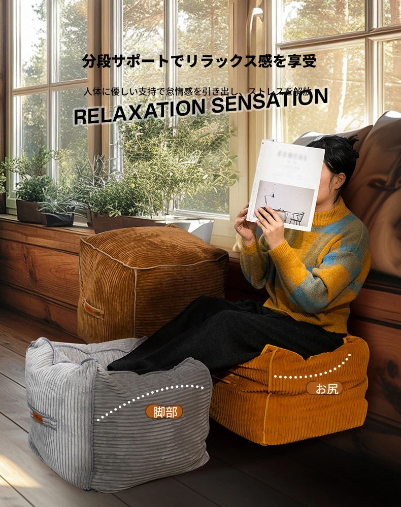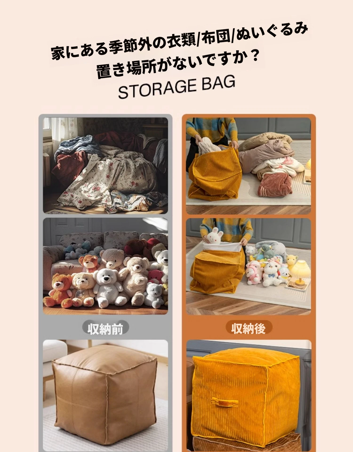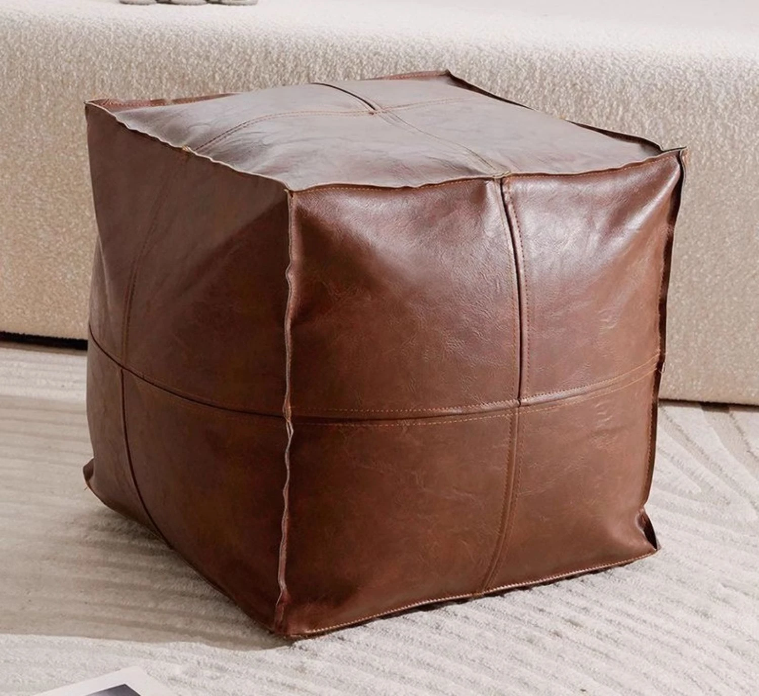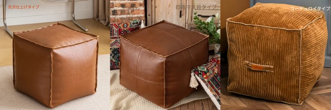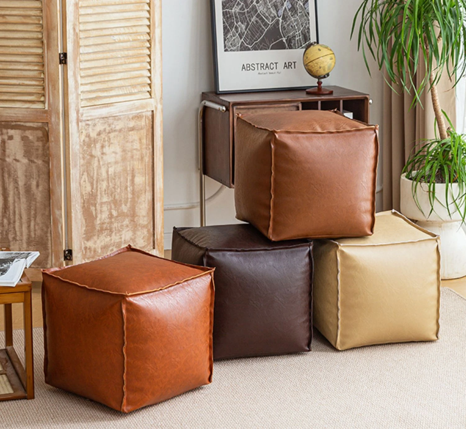 北欧風の手作りレザーラウンジオットマン - リラックスできる座り心地、靴を履くのにも最適!おしゃれな収納機能付きで、古い衣類もスッキリ整理。あなたのリビングにぴったりなアイテム!