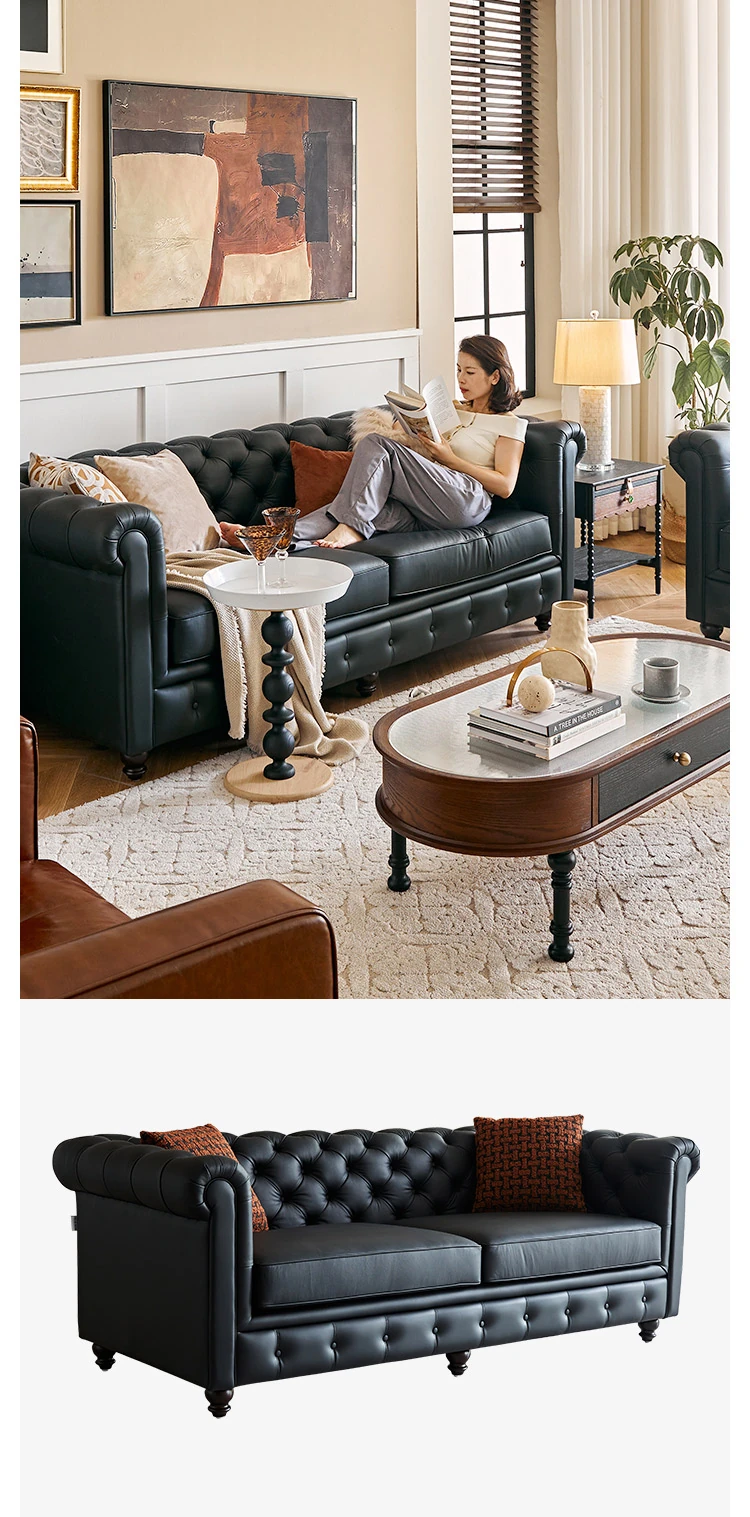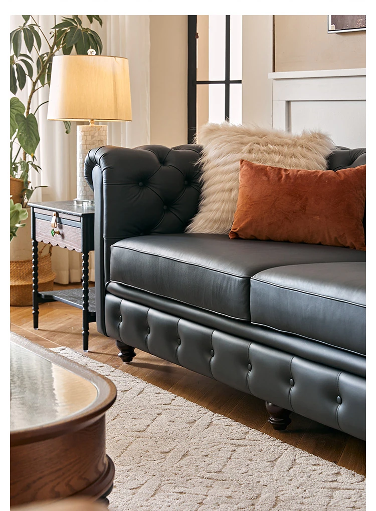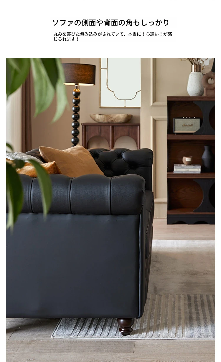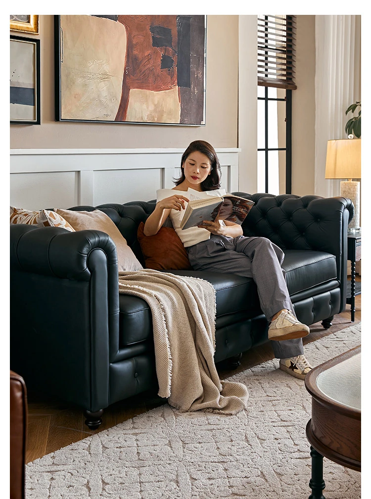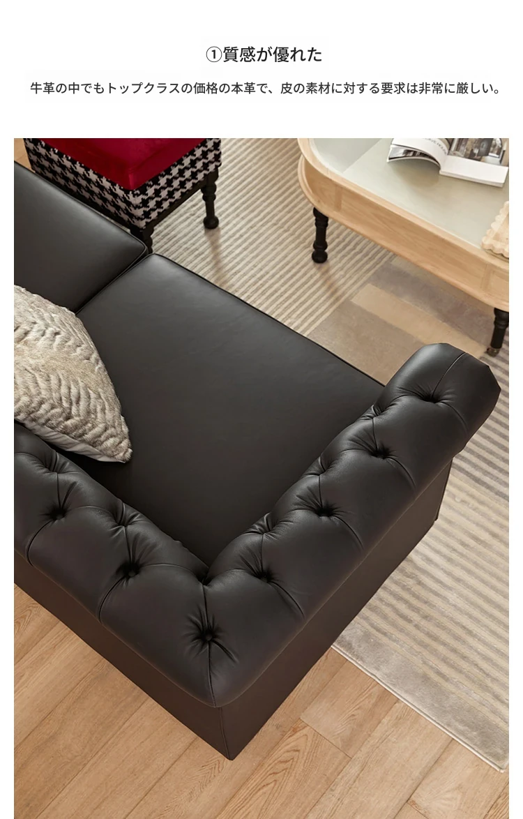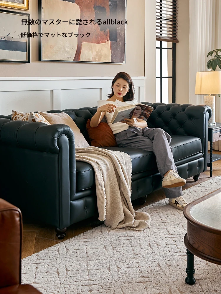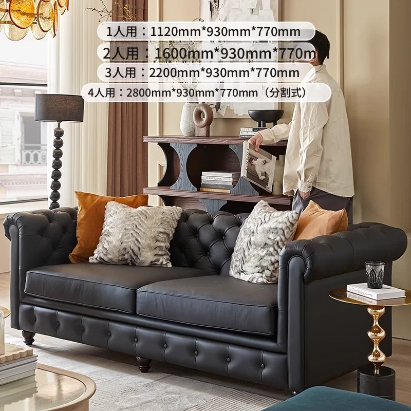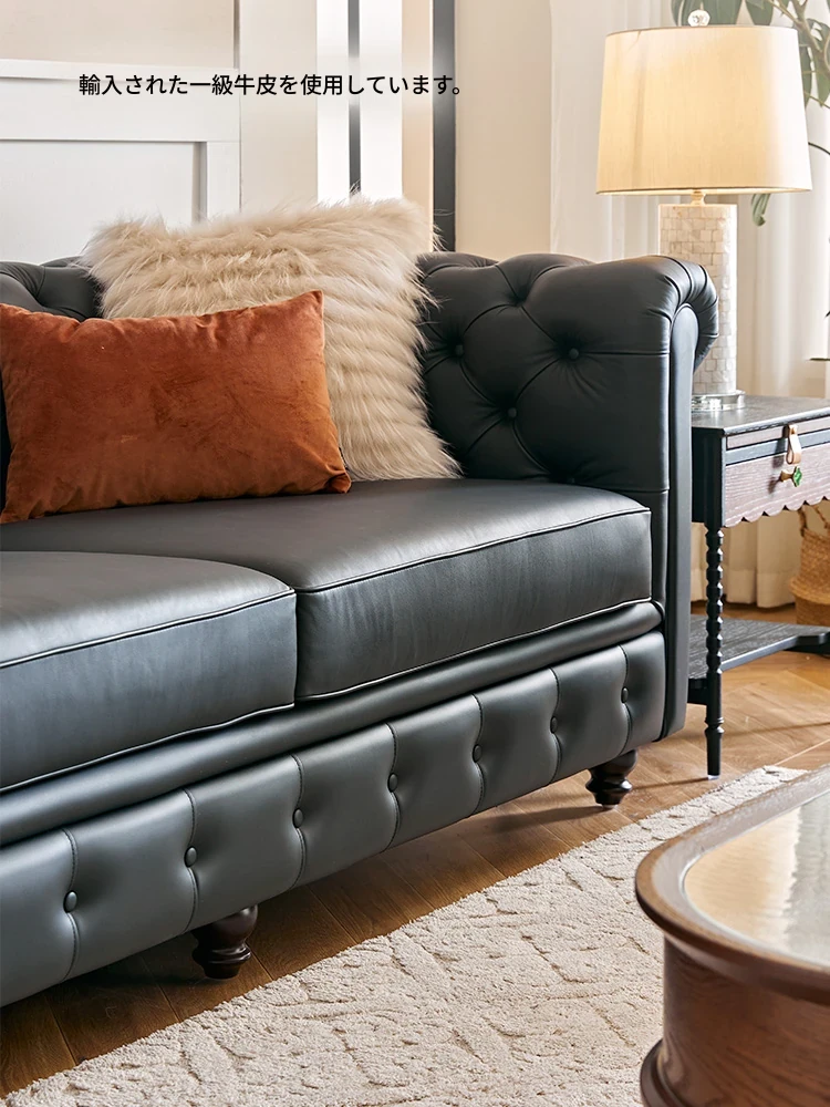 アメリカンスタイル本革ソファー - 小型リビングに最適!レトロなデザインとウッドフレームの直線的な皮革張りソファーで、高級感あふれる空間を演出。おしゃれで快適な居心地を実現します!