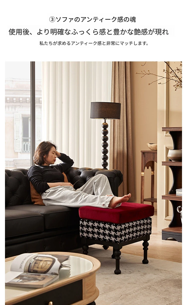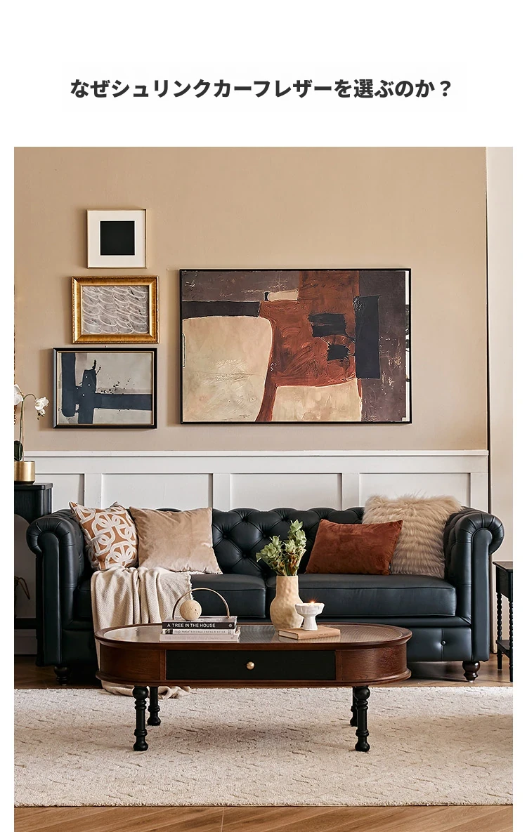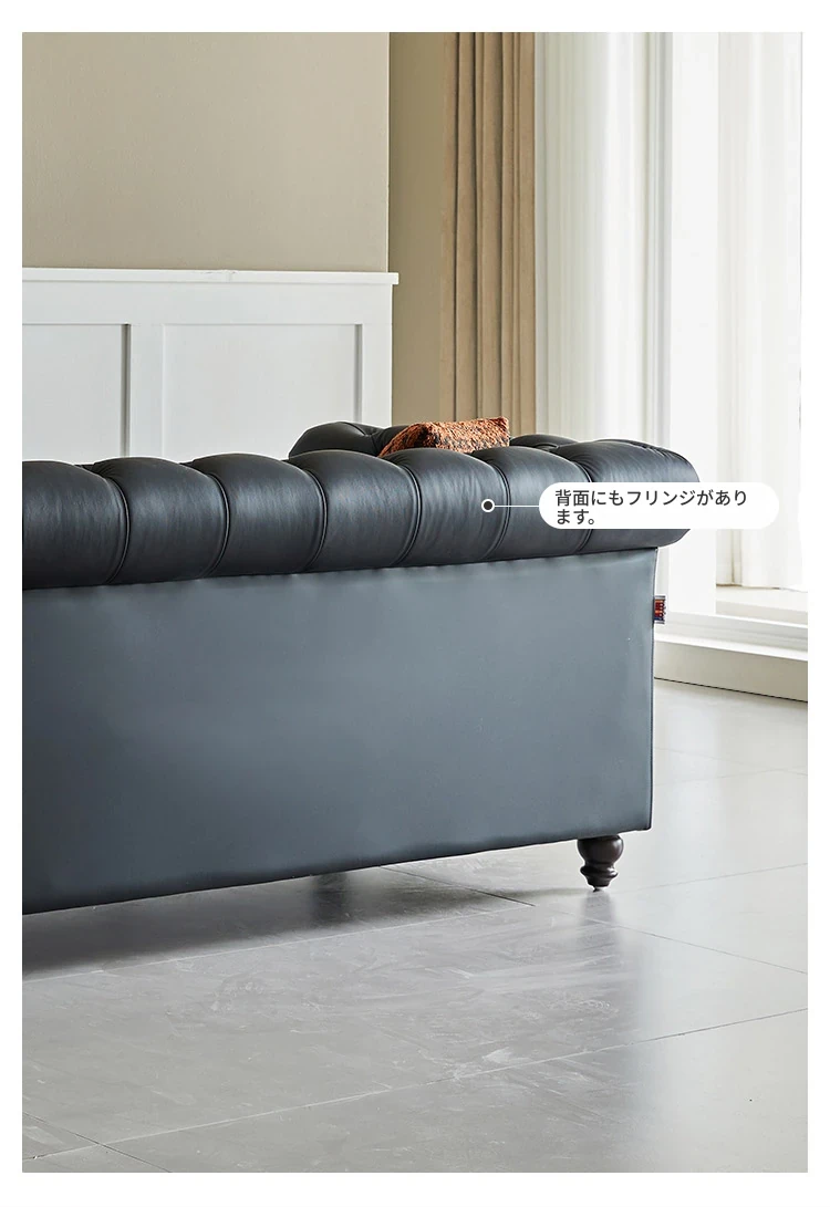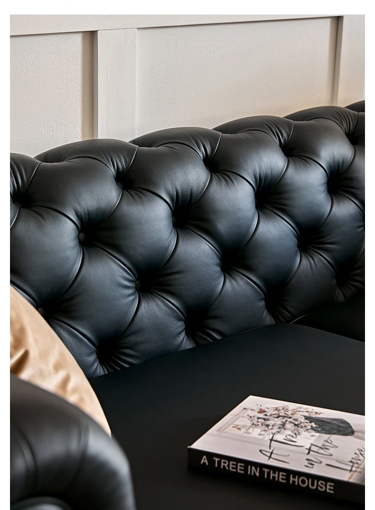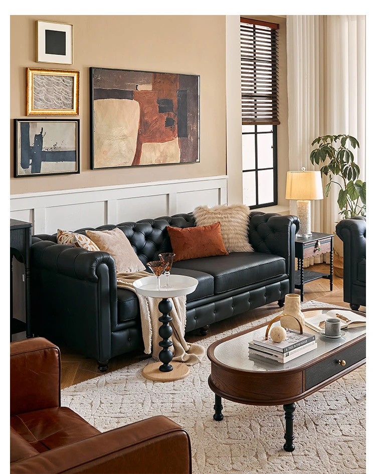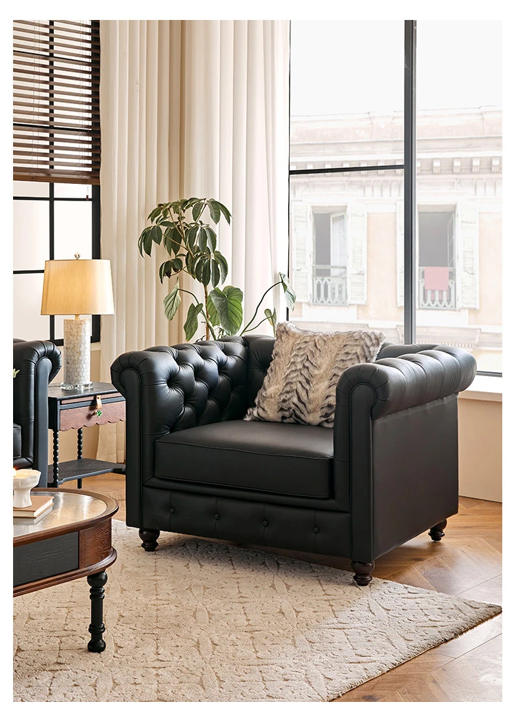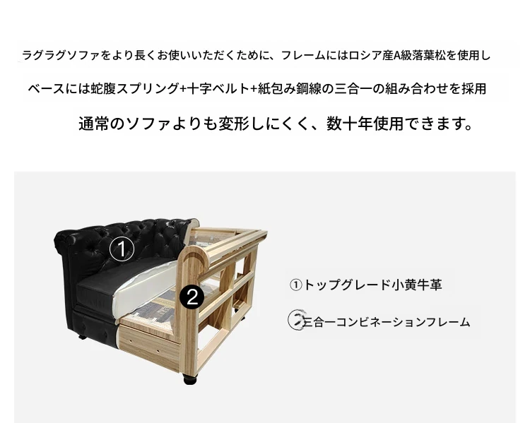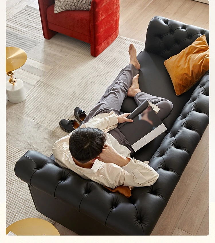 アメリカンスタイル本革ソファー - 小型リビングに最適!レトロなデザインとウッドフレームの直線的な皮革張りソファーで、高級感あふれる空間を演出。おしゃれで快適な居心地を実現します!