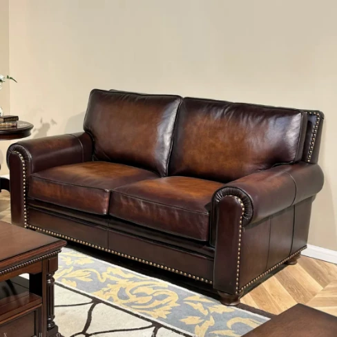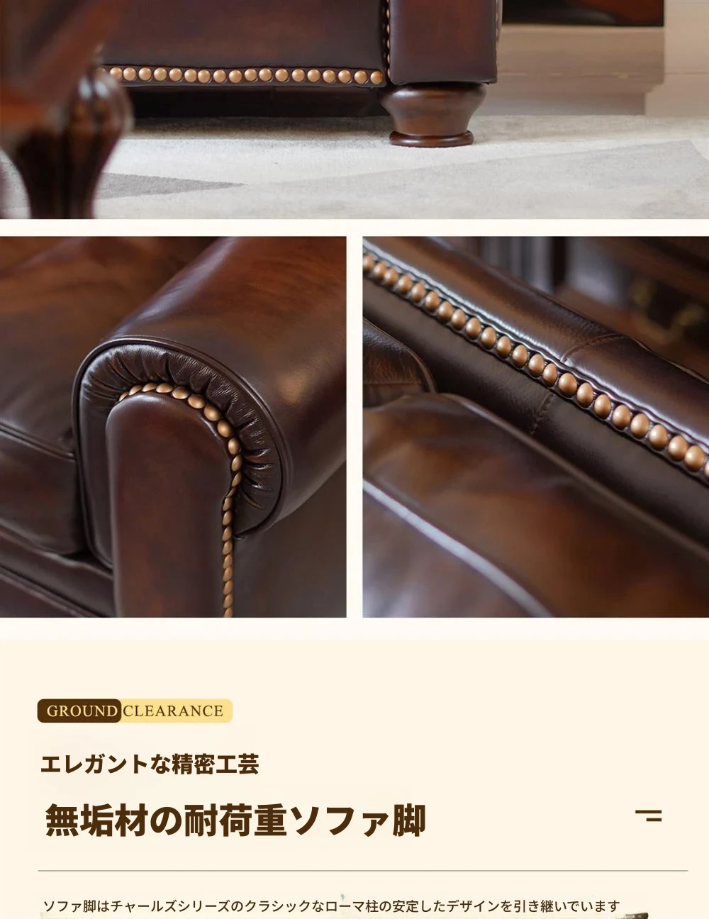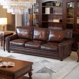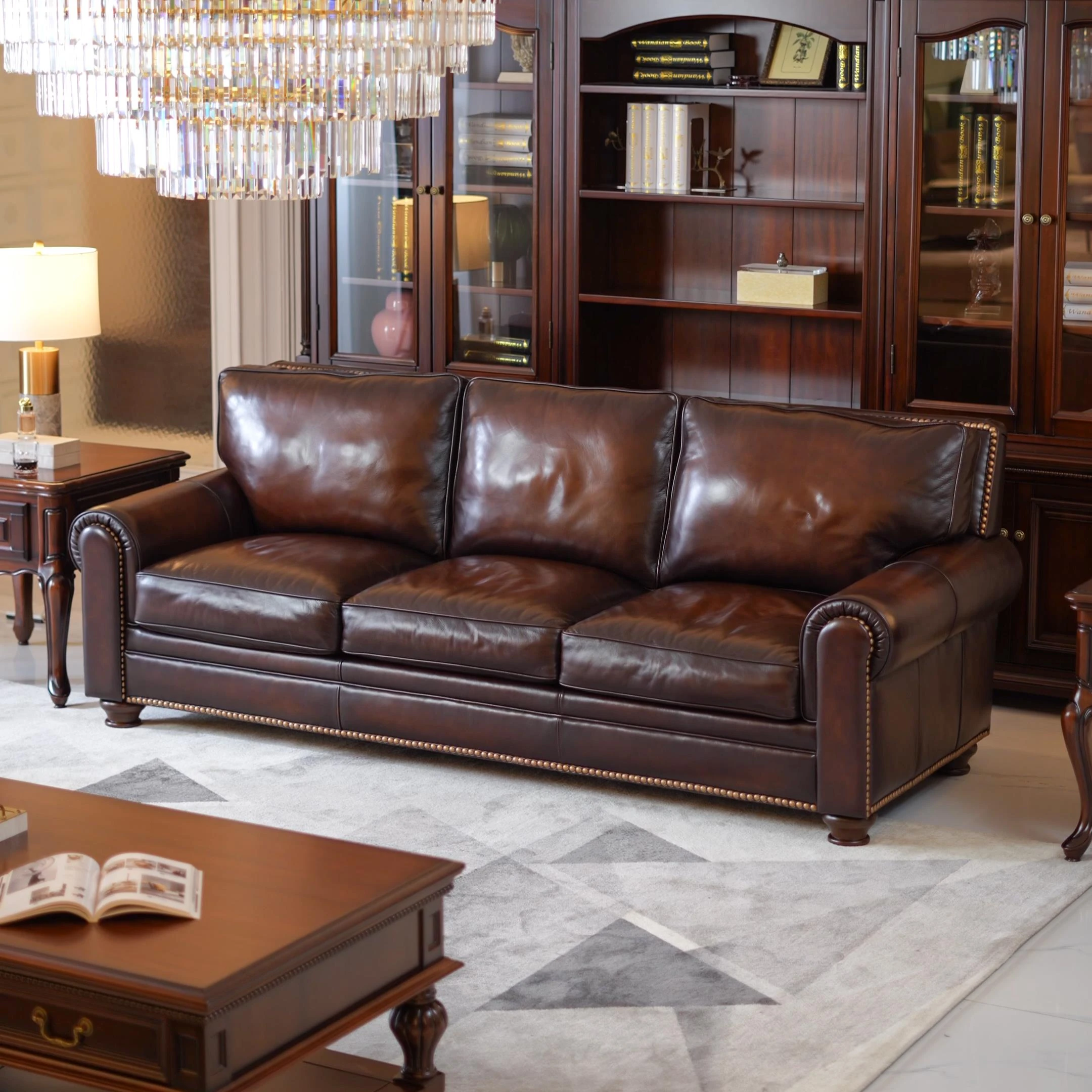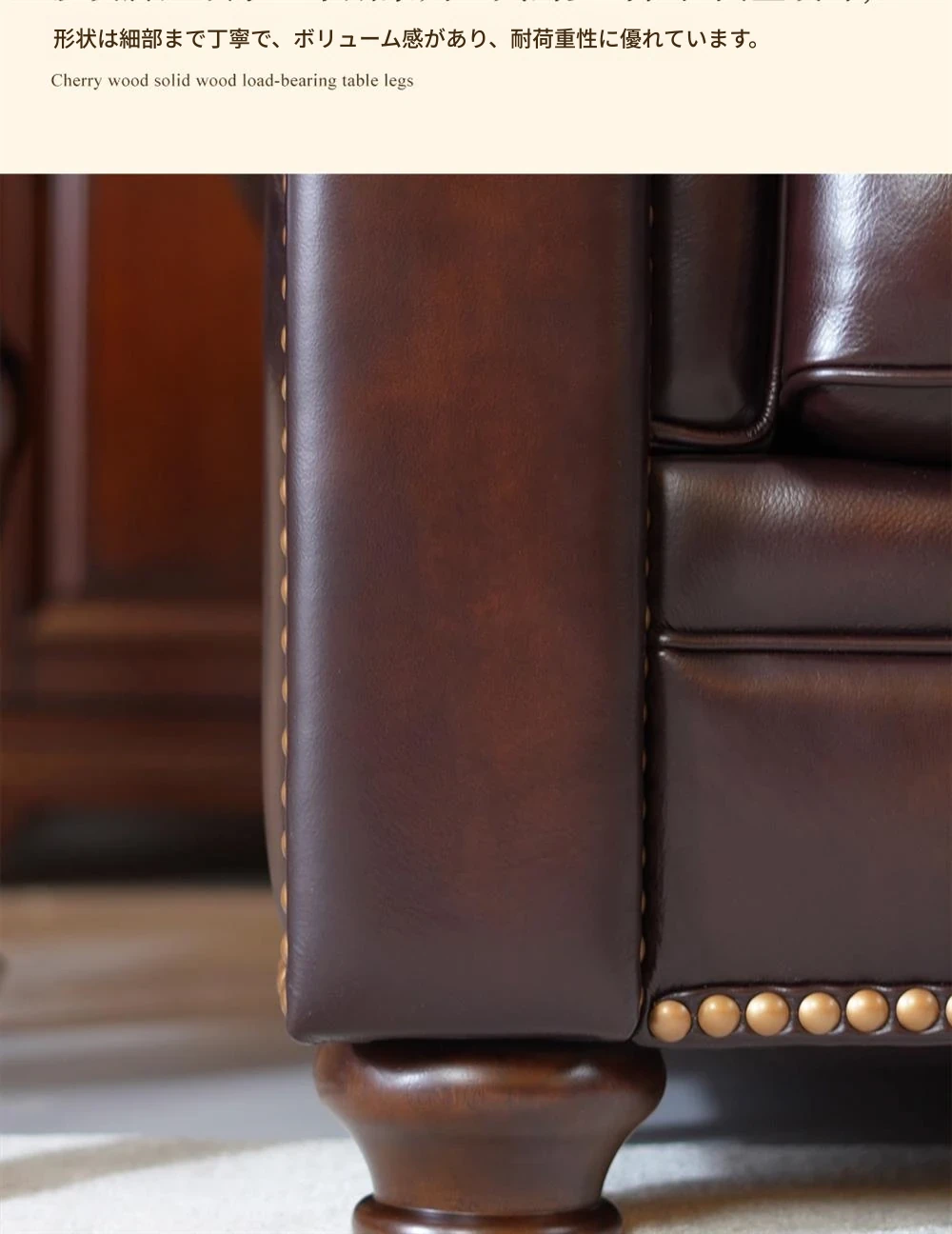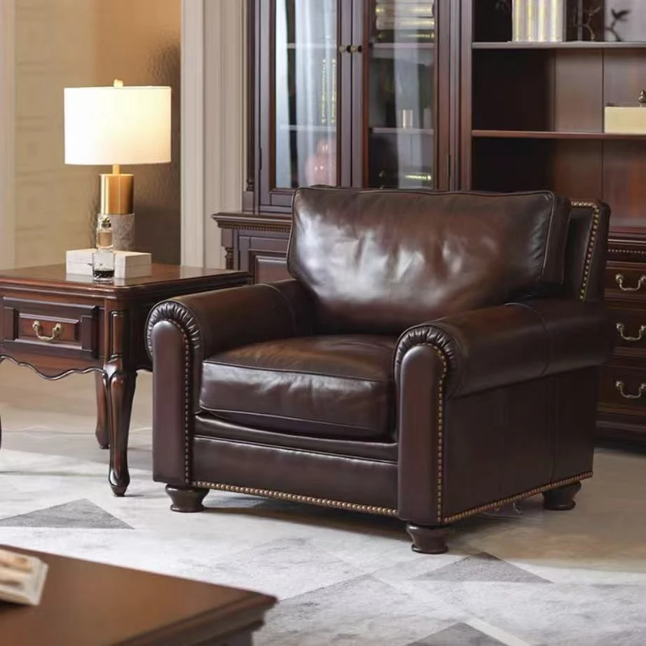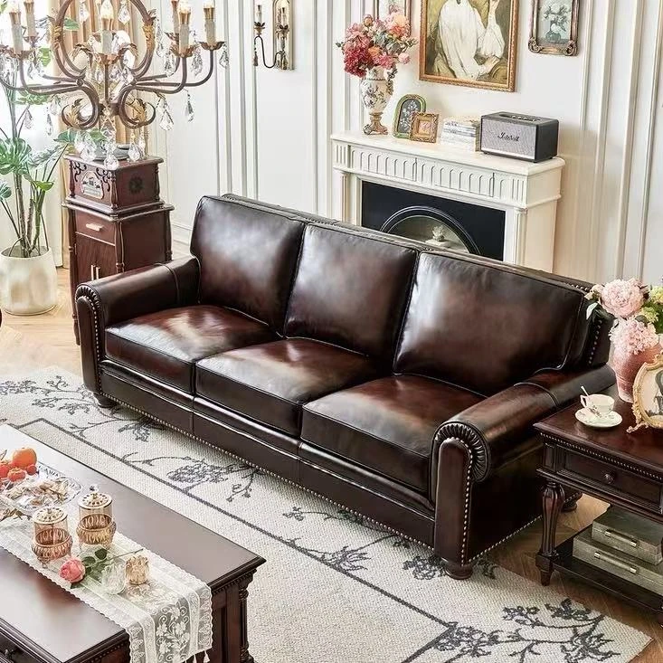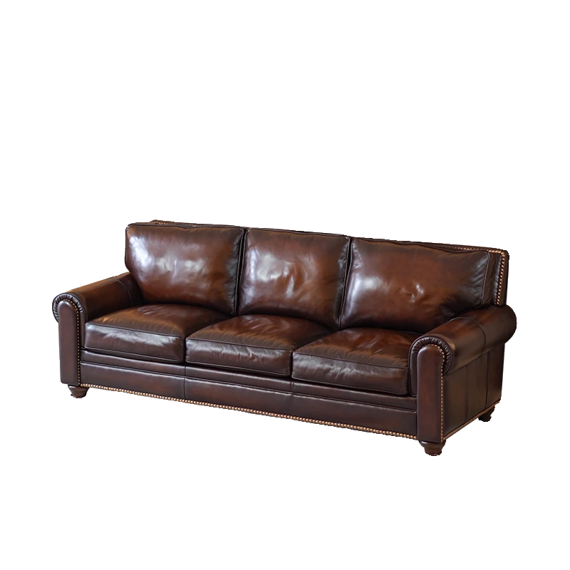 アメリカンスタイルの無垢材ヴィンテージ大バトン本革ソファー|オイルワックス仕上げの中華風デザイン|広々としたリビングに最適な直排家具!おしゃれで快適な空間を演出します。