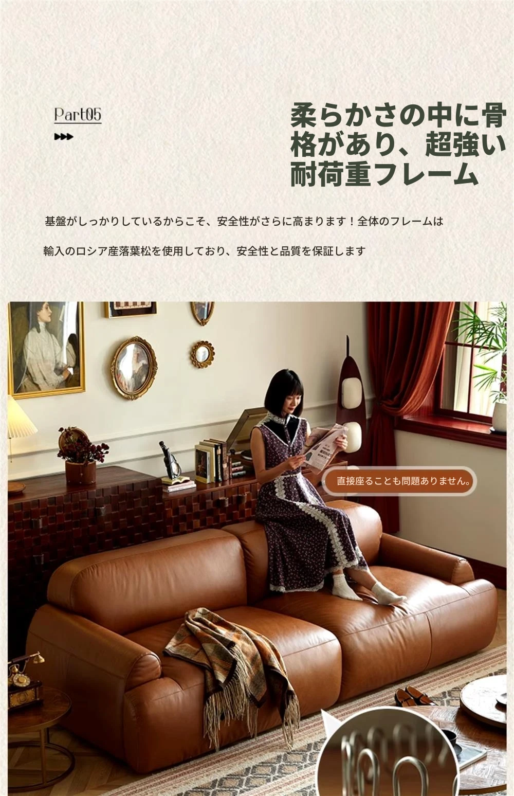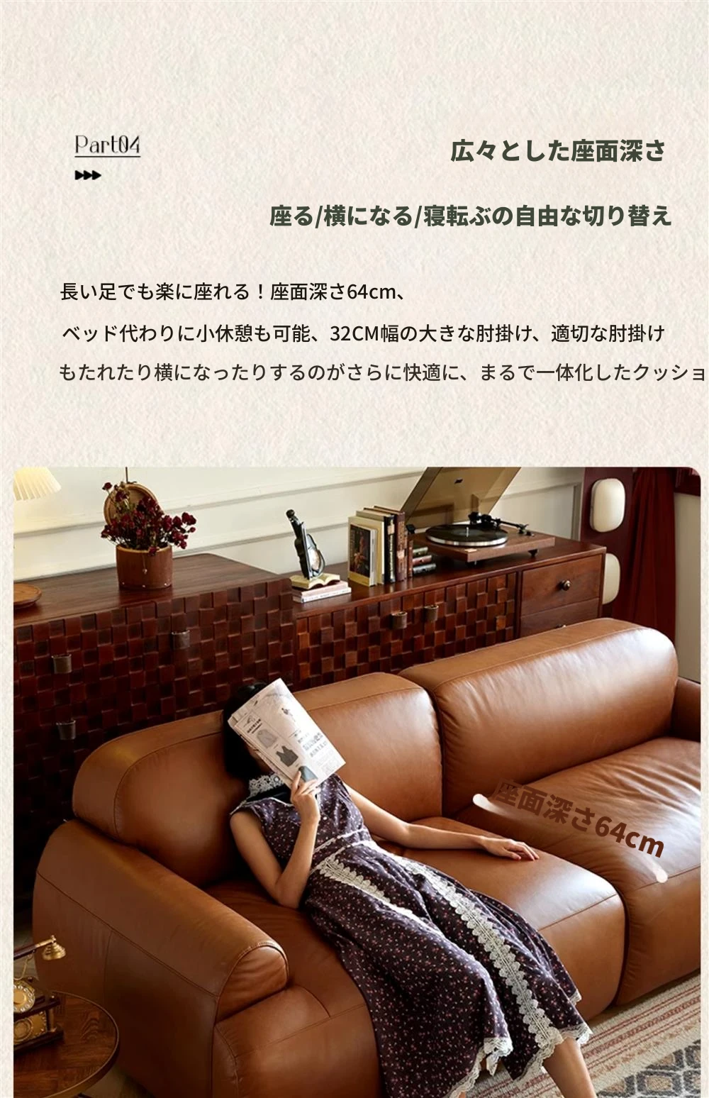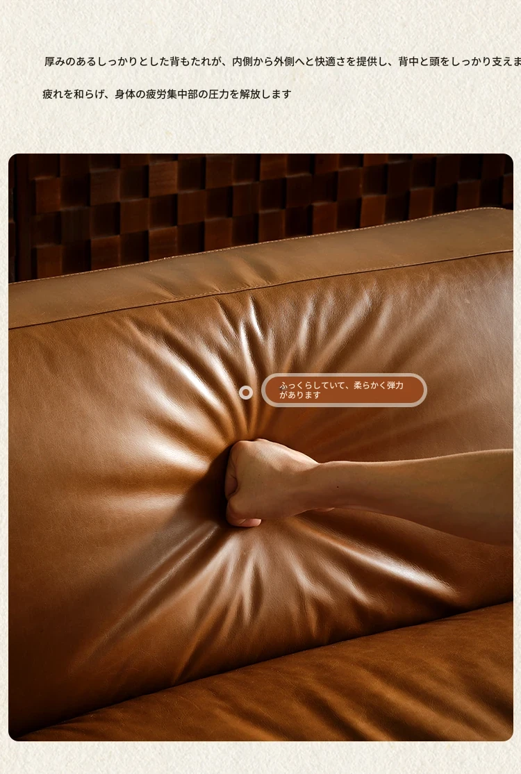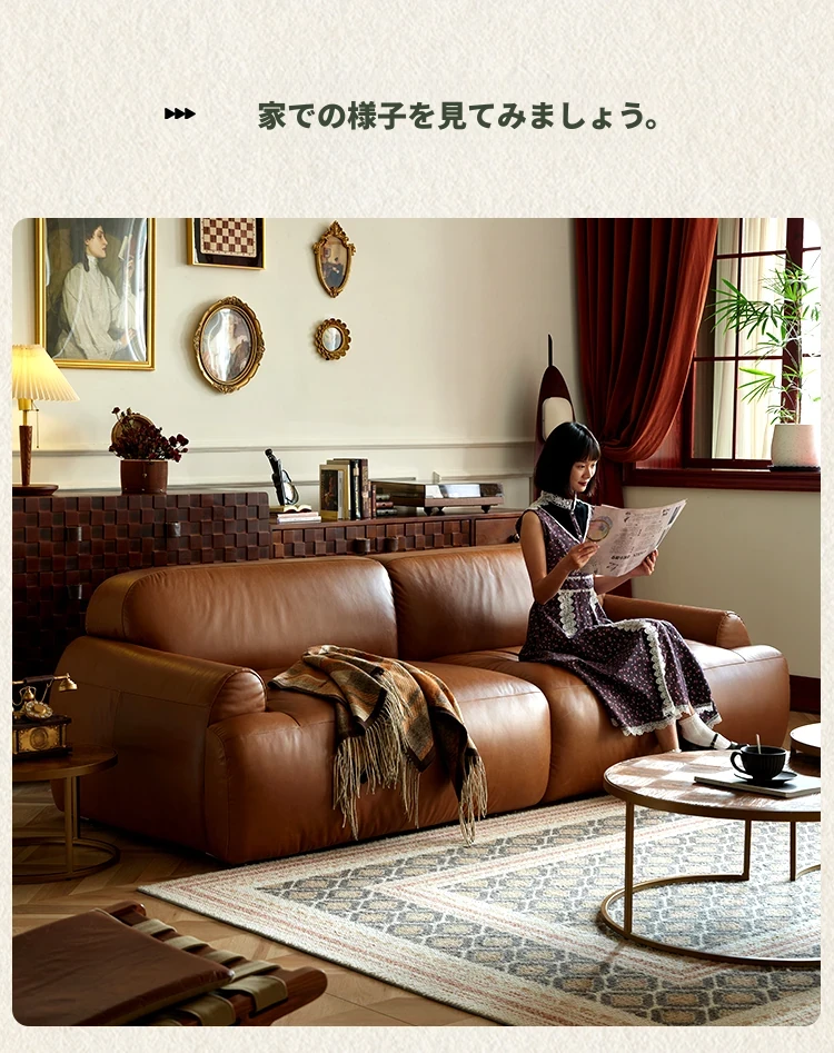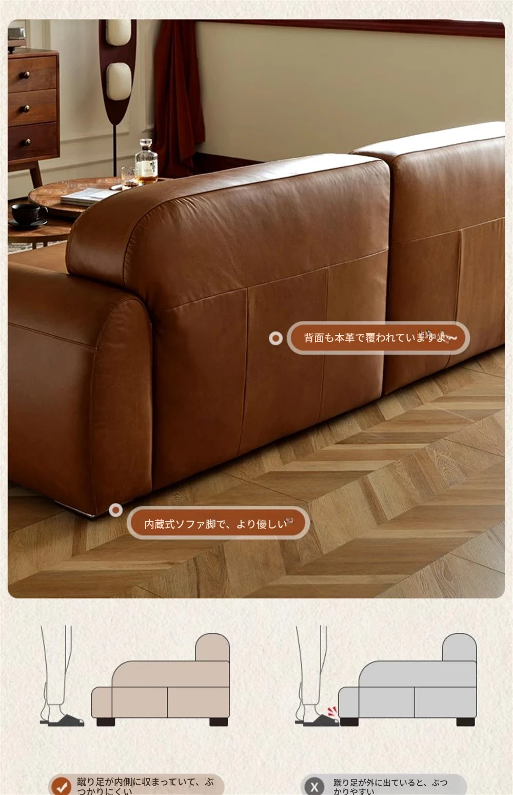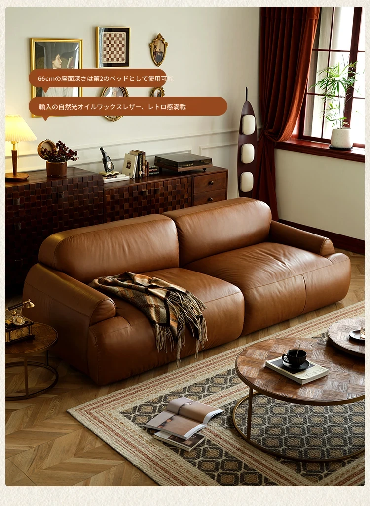 ヴィンテージ風オールレザーソファー - レトロブラウンの豆腐ブロック、オイルワックスレザー使用。小型・中型リビングに最適なストレート型パンソファ。お部屋に温かみとスタイルをプラス!