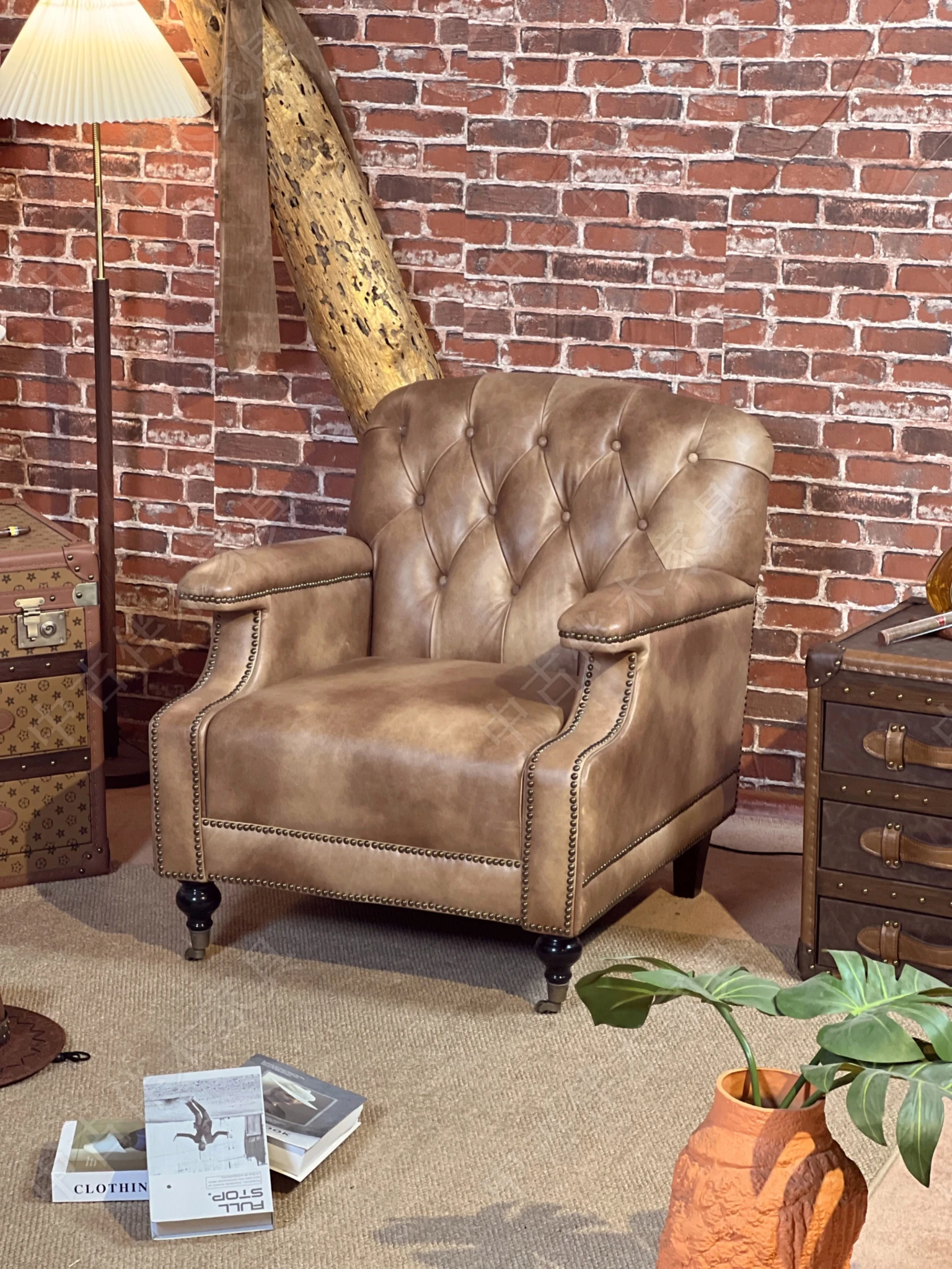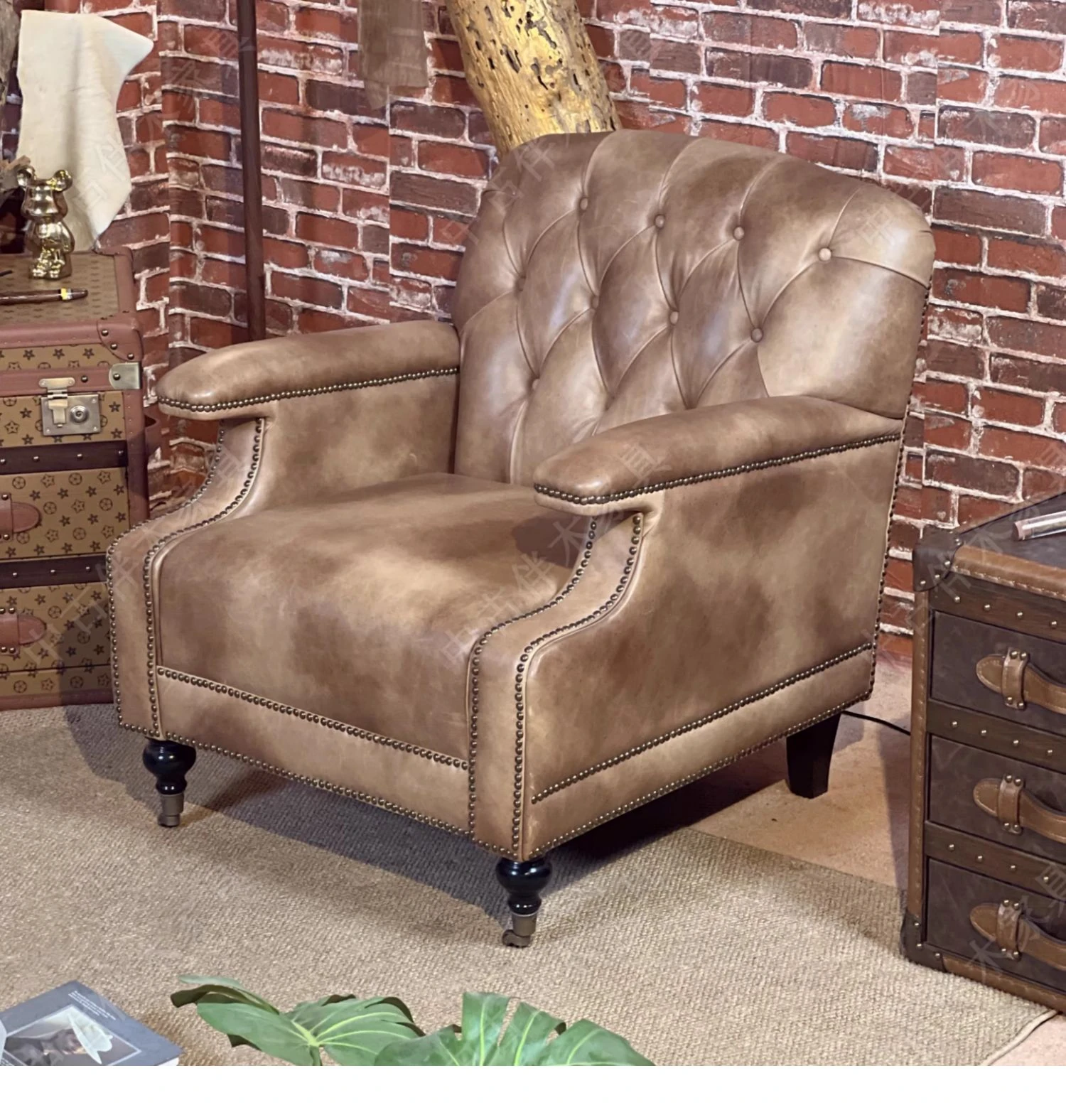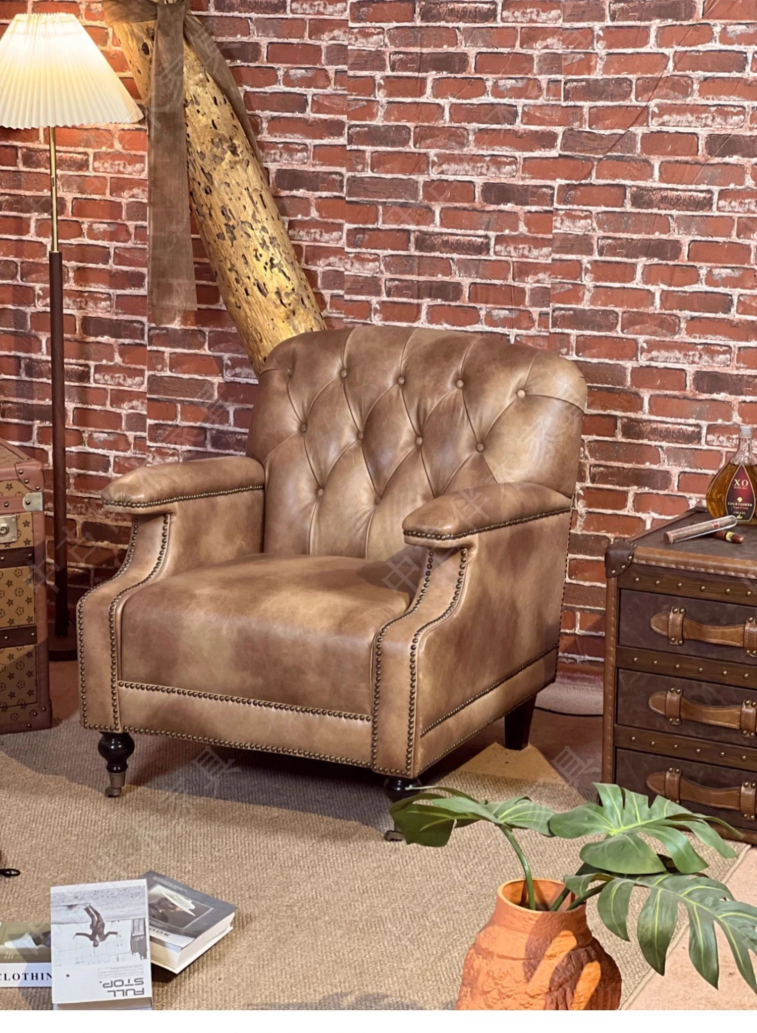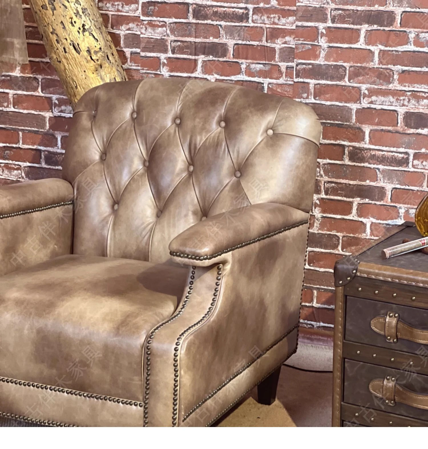 アメリカンヴィンテージの一人掛けソファチェア - 本革タッセルデザイン、リラックスできるレトロスタイル。リビングやバルコニー、民宿にも最適なシガーチェア。おしゃれで快適な空間を演出します!