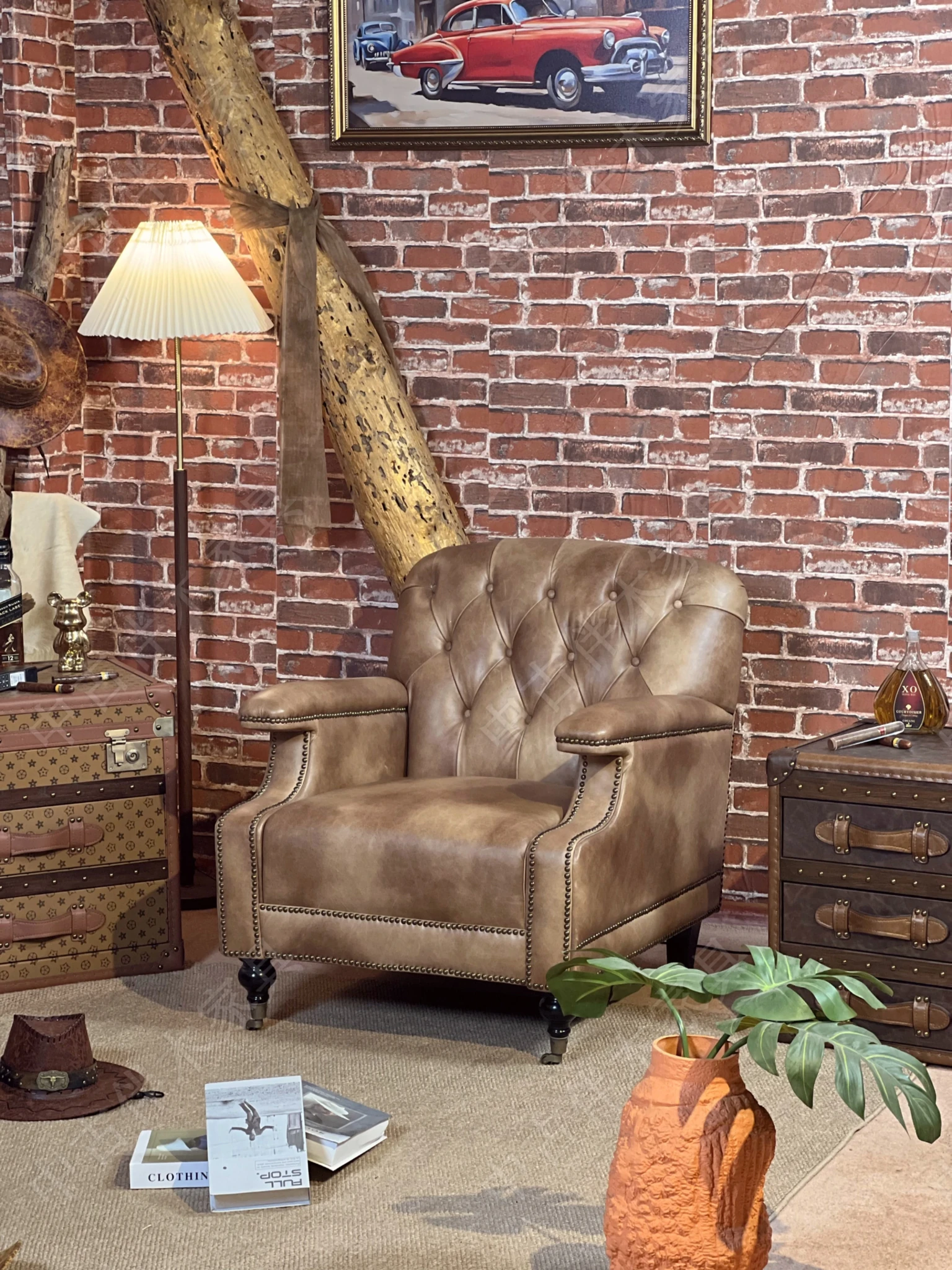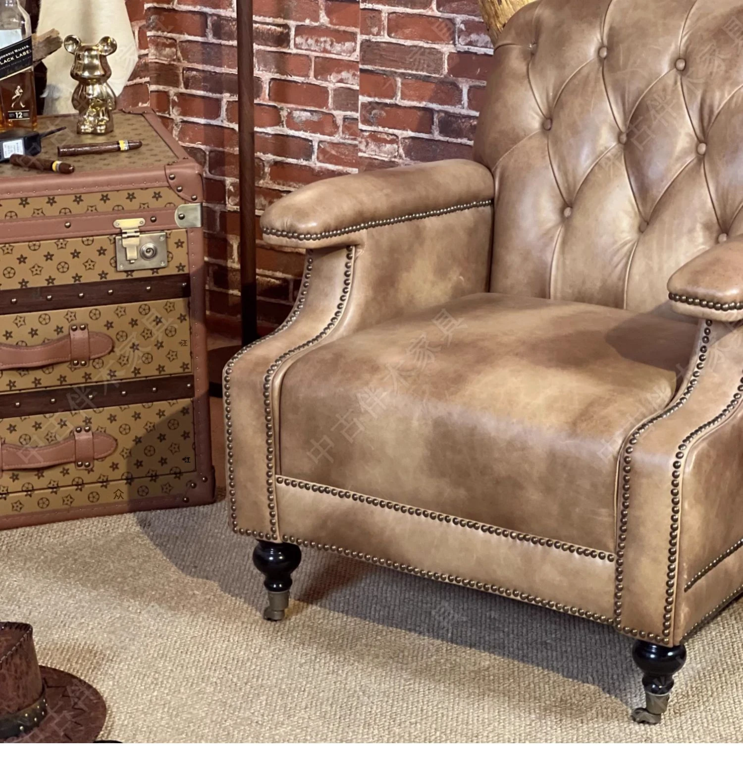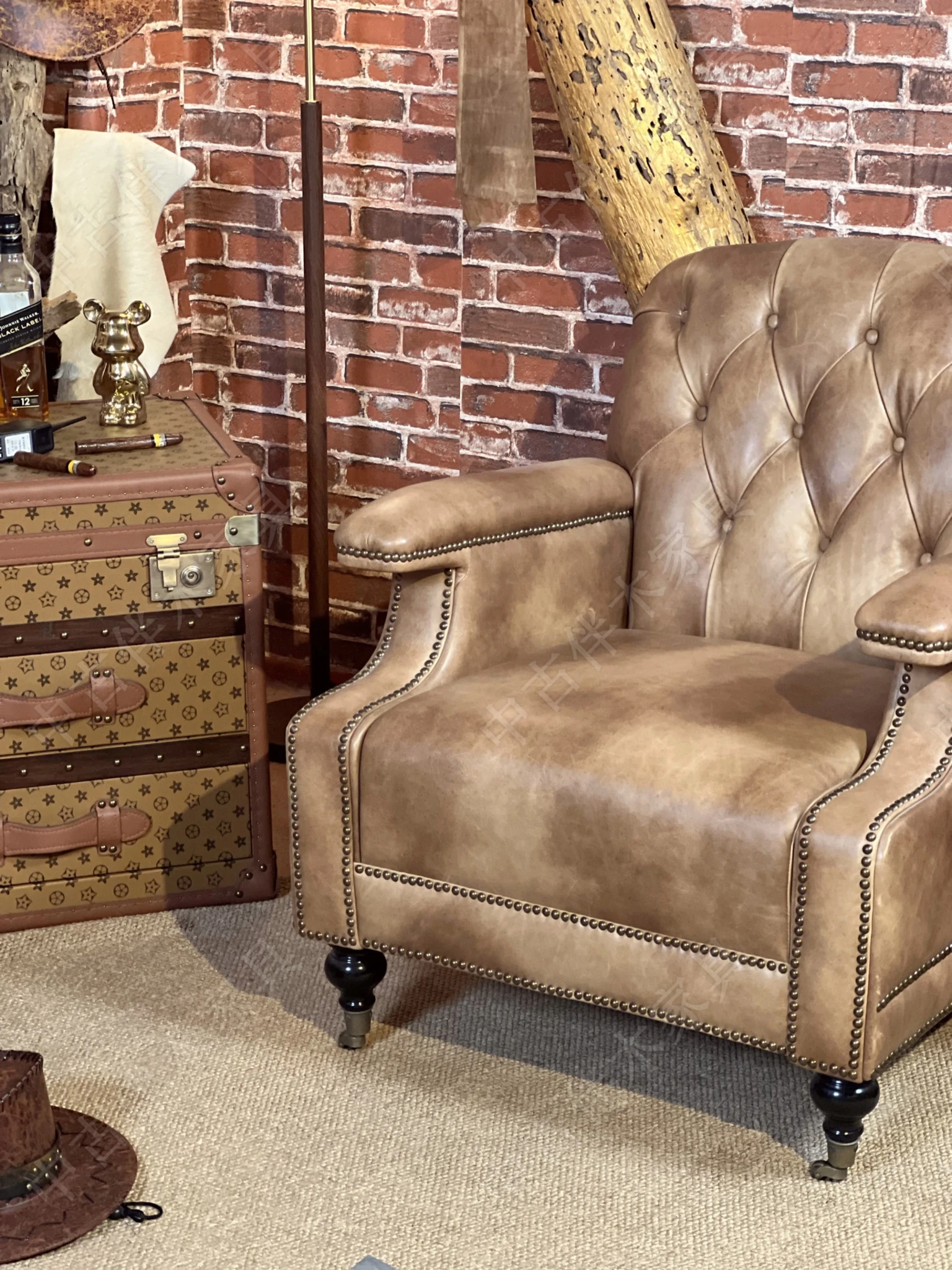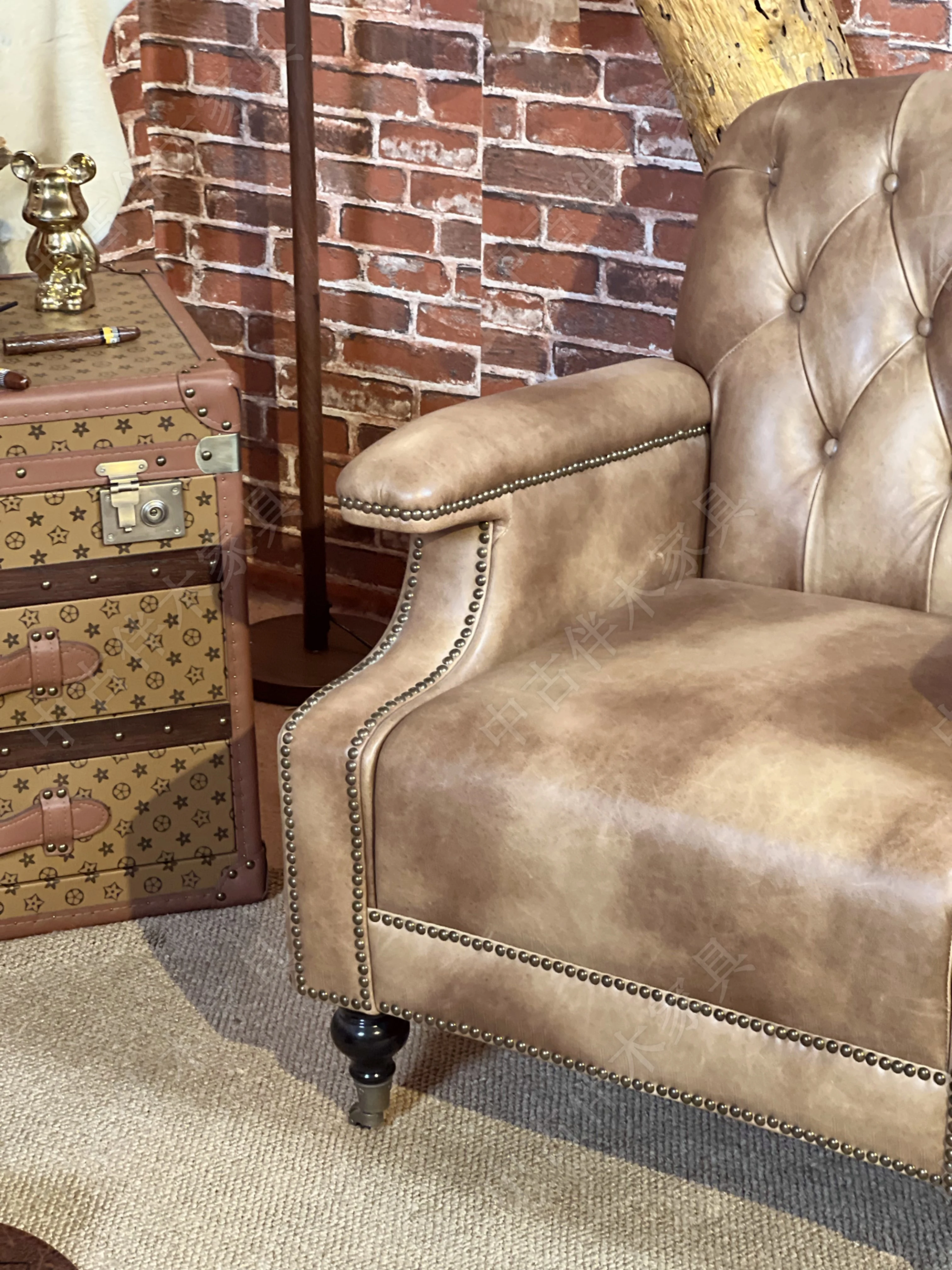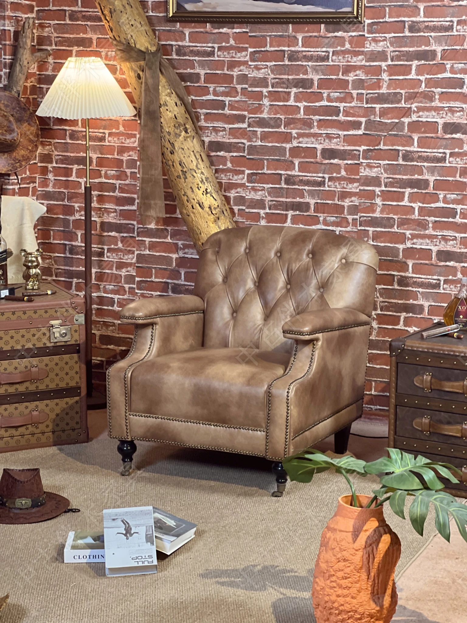 アメリカンヴィンテージの一人掛けソファチェア - 本革タッセルデザイン、リラックスできるレトロスタイル。リビングやバルコニー、民宿にも最適なシガーチェア。おしゃれで快適な空間を演出します!